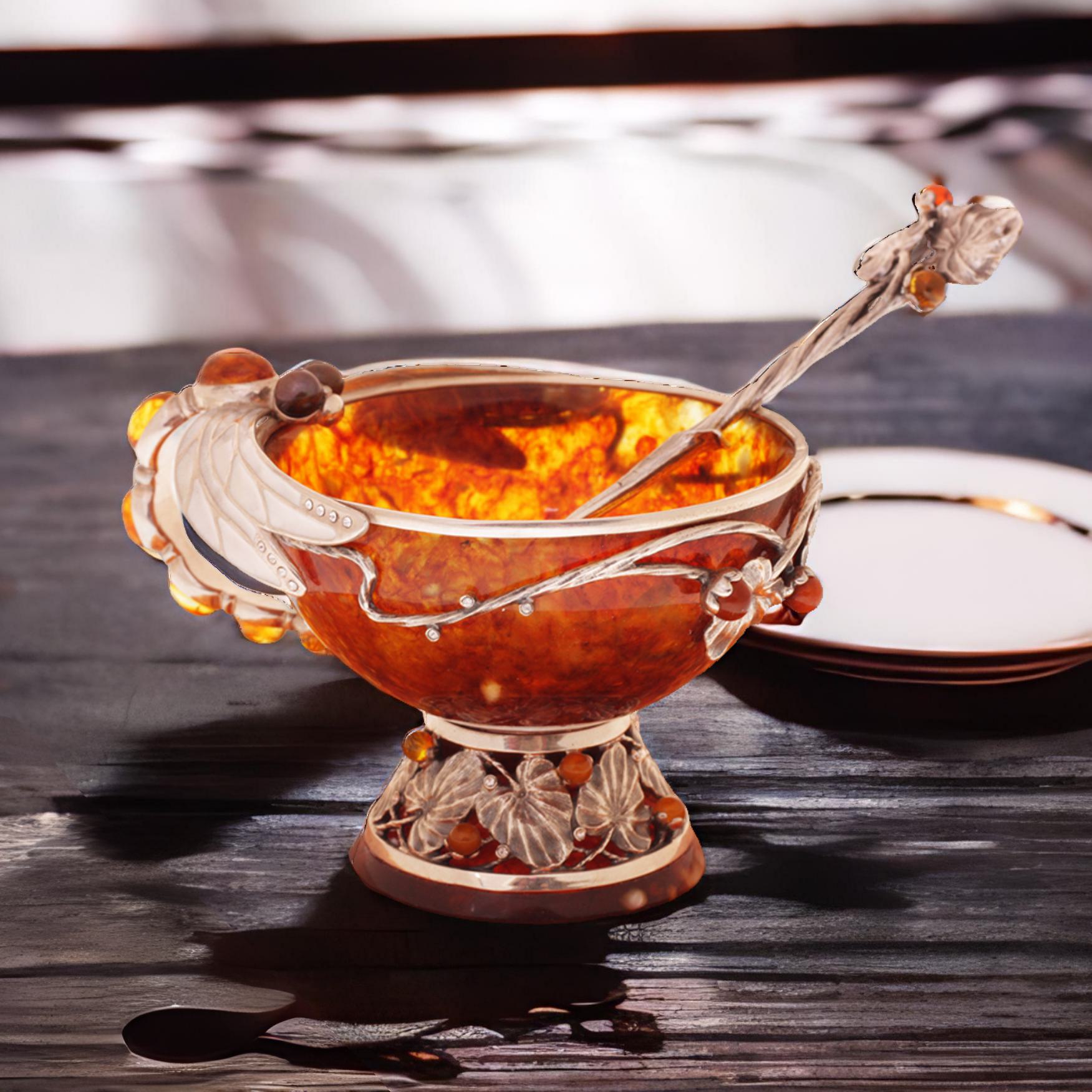 Уважаемые господа! Рады представить вам эксклюзивную новинку нашего ассортимента — чайную чашку из янтаря с ложечкой, украшенную бронзовыми элементами. Подарите себе и своим близким неповторимую возможность наслаждаться любимым чаем из этого выдающегося образца искусства. Чай в чашке из янтаря приобретает особые нотки, изысканный вкус и неповторимую терпкость. С каждым глотком вы будете ощущать настоящее наслаждение. Янтарь, используемый в производстве данной чашки, считается одним из самых уникальных и завораживающих драгоценных камней. Он дарит своему владельцу не только красоту, но и способность влиять на качество и вкус чая, раскрывая его на новый лад.