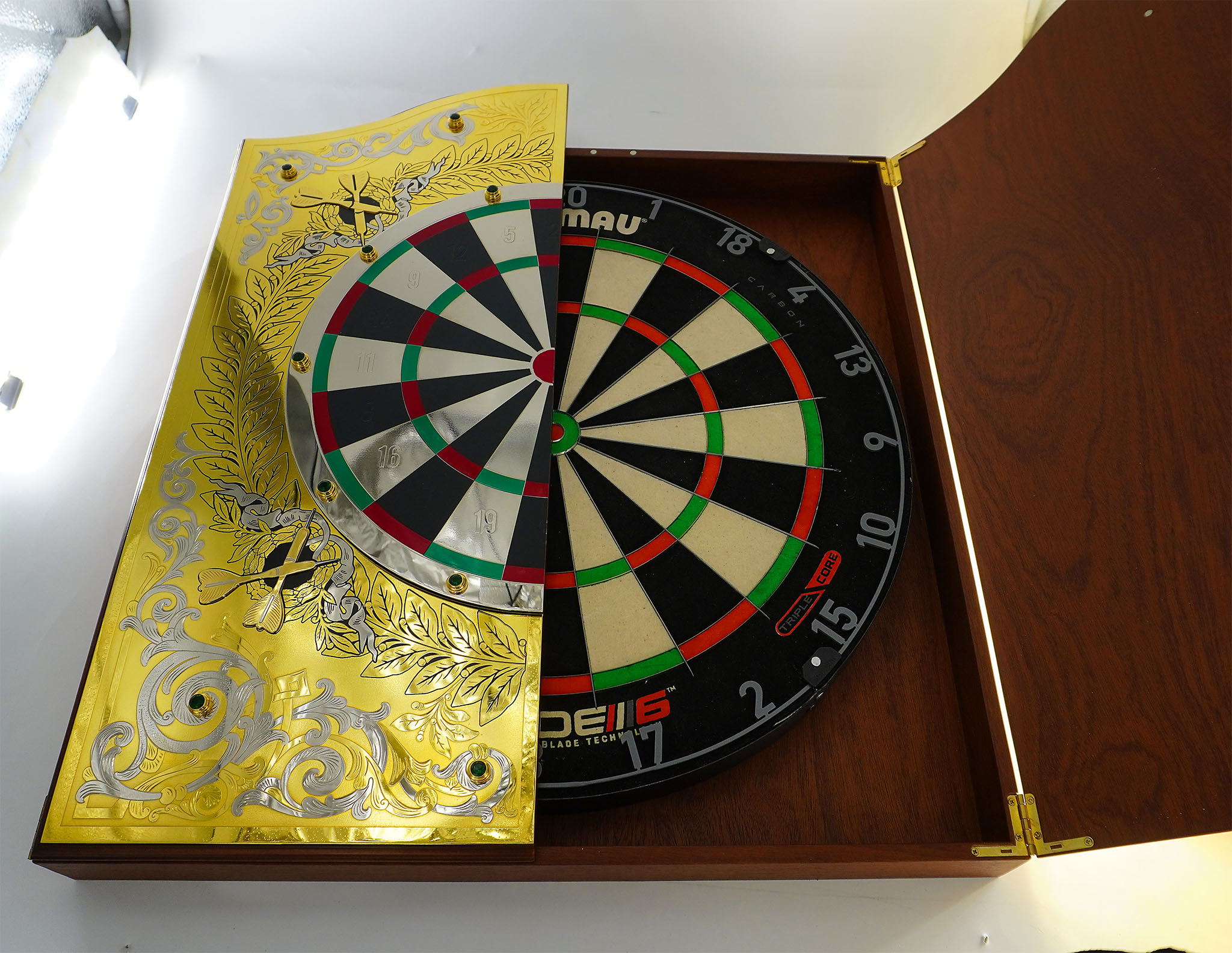 Решил себя порадовать и купил себе в банный комплекс такой дартс. Короб выполнен очень достойно, порадовало, что мишень тоже профессиональная и дротики тоже. |