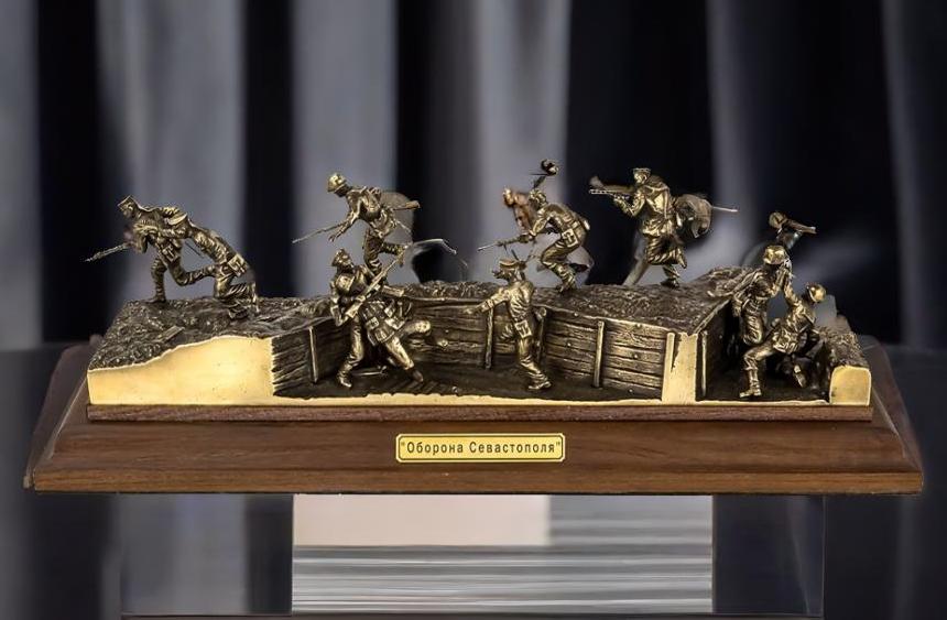 Диорама, показывающая момент ожесточенной схватки советской армии с немецкими захватчиками в Севастополе в 1941-1942 годах. 250-дневная героическая оборона стала своеобразным символом непобедимого мужества и непреклонного героизма бойцов Советской Армии. Диорама словно воспроизводит один из моментов событий того времени: герои композиции будто оживают в стремительном наступлении на врага и становится понятно, что, благодаря героизму советских солдат, исход битвы предрешен. Материал: патинированная бронза. Основание: дерево ясеня. Масштаб: 1/35. Точное повторение невозможно, каждая диорама изготавливается индивидуально. |