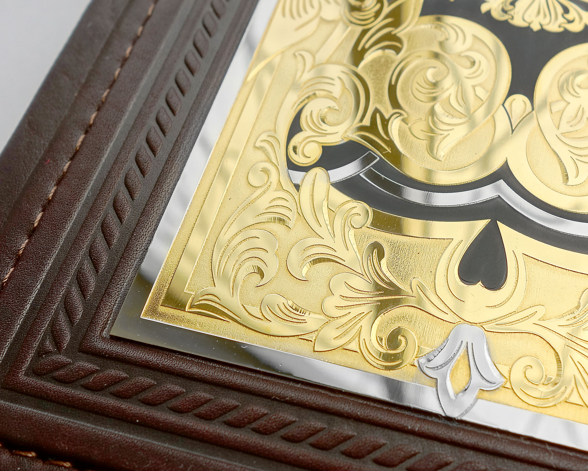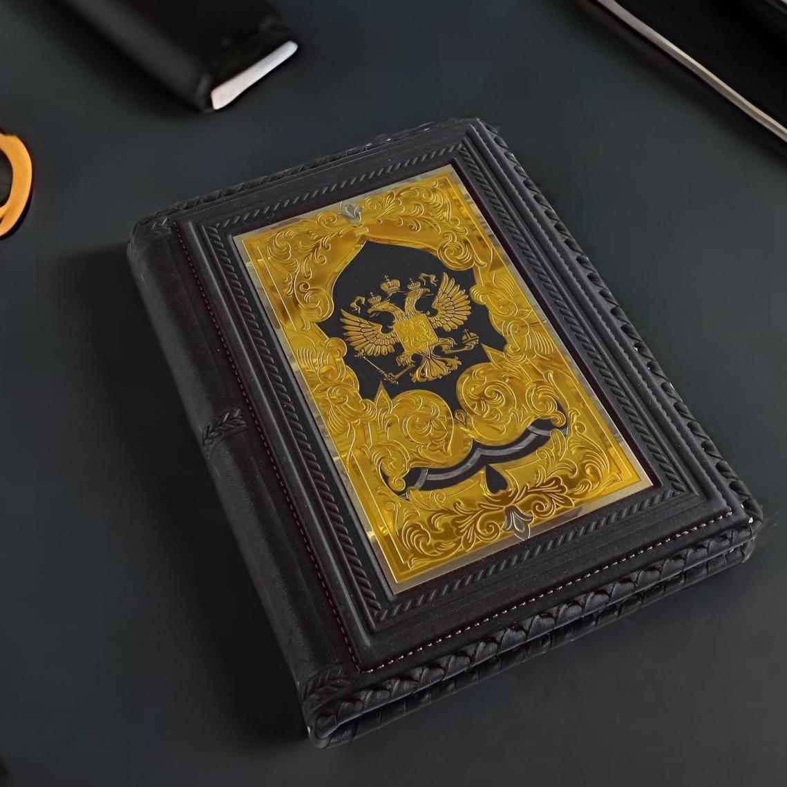 Уникальный на рынке, изысканный ежедневник — это не только практичный помощник, но и стильный аксессуар, подчеркивающий статус и прекрасный вкус своего владельца. Гербовый — работы мастеров златоустовской гравюры . Обложка ежедневника выполнена из натуральной кожи высшего качества. Украшение по технологии златоустовской гравюры с золочением придает ему несравненный респектабельный вид. Особенностью модели является изображение Герба России .