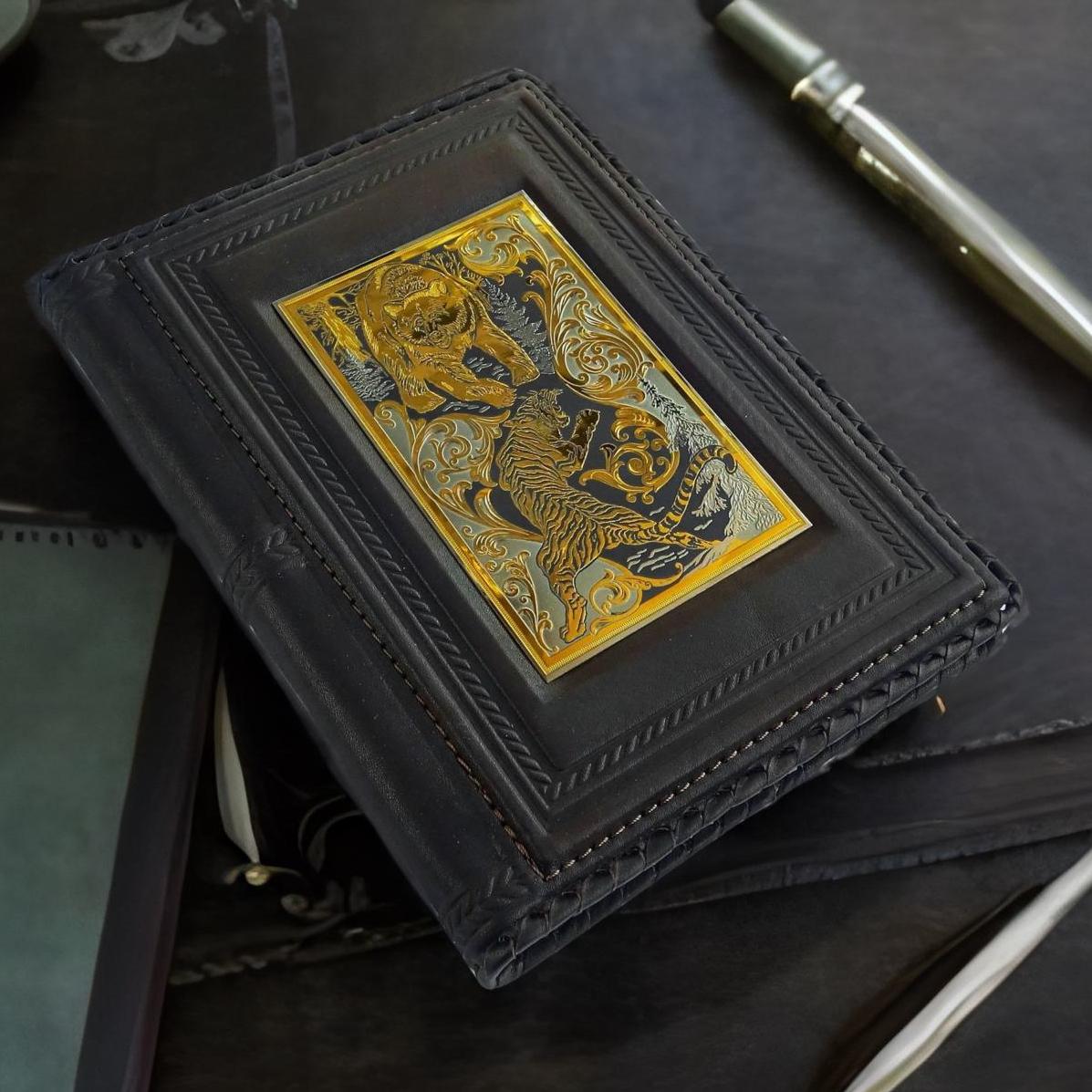 Это не просто планировщик, а произведение искусства, украшенное по технологии златоустовской гравюры с золочением. Гравировка схватка тигра и медведя — мощное изображение, символизирующее смелость и решимость в принятии решений. Ежедневник Схватка не только помогает организовать ваши дела, но и подчеркивает ваш статус и авторитет.