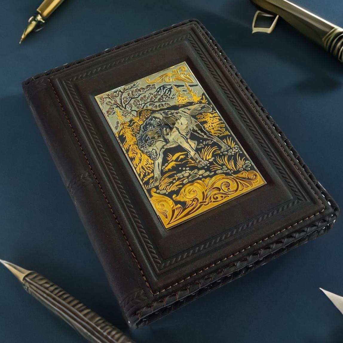 Презентуем вам эксклюзивный продукт — ежедневник из натуральной кожи Волк. Отличный подарок на любой торжественный случай или прекрасное дополнение вашего образа. Ручная работа и высококачественные материалы гарантируют долгий срок службы и сохранность всех записей. Внутри — календарь, карманы для визиток и качественный блокнот. Особенностью этого изделия является обложка, украшенная в соответствии с технологией златоустовской гравюры с золочением. Гравировка волк — символ смелости и власти, придаёт ?ежедневнику особый шарм и характер.