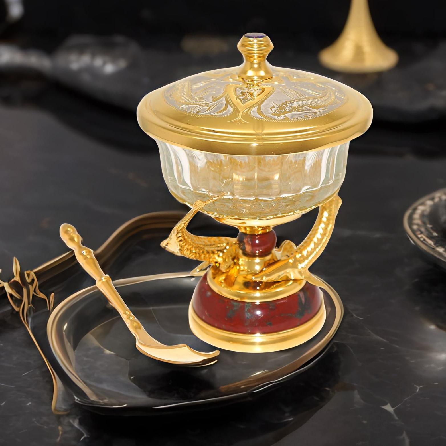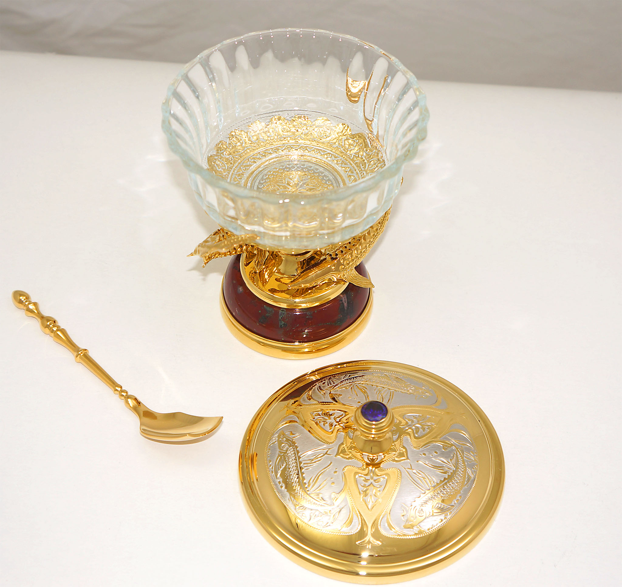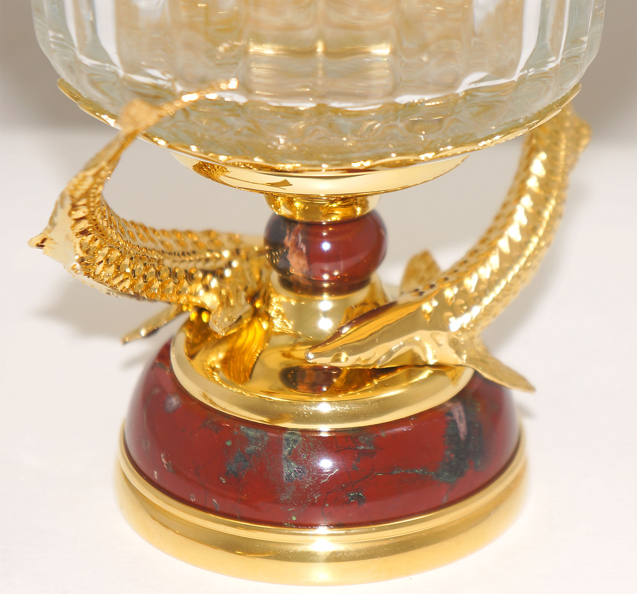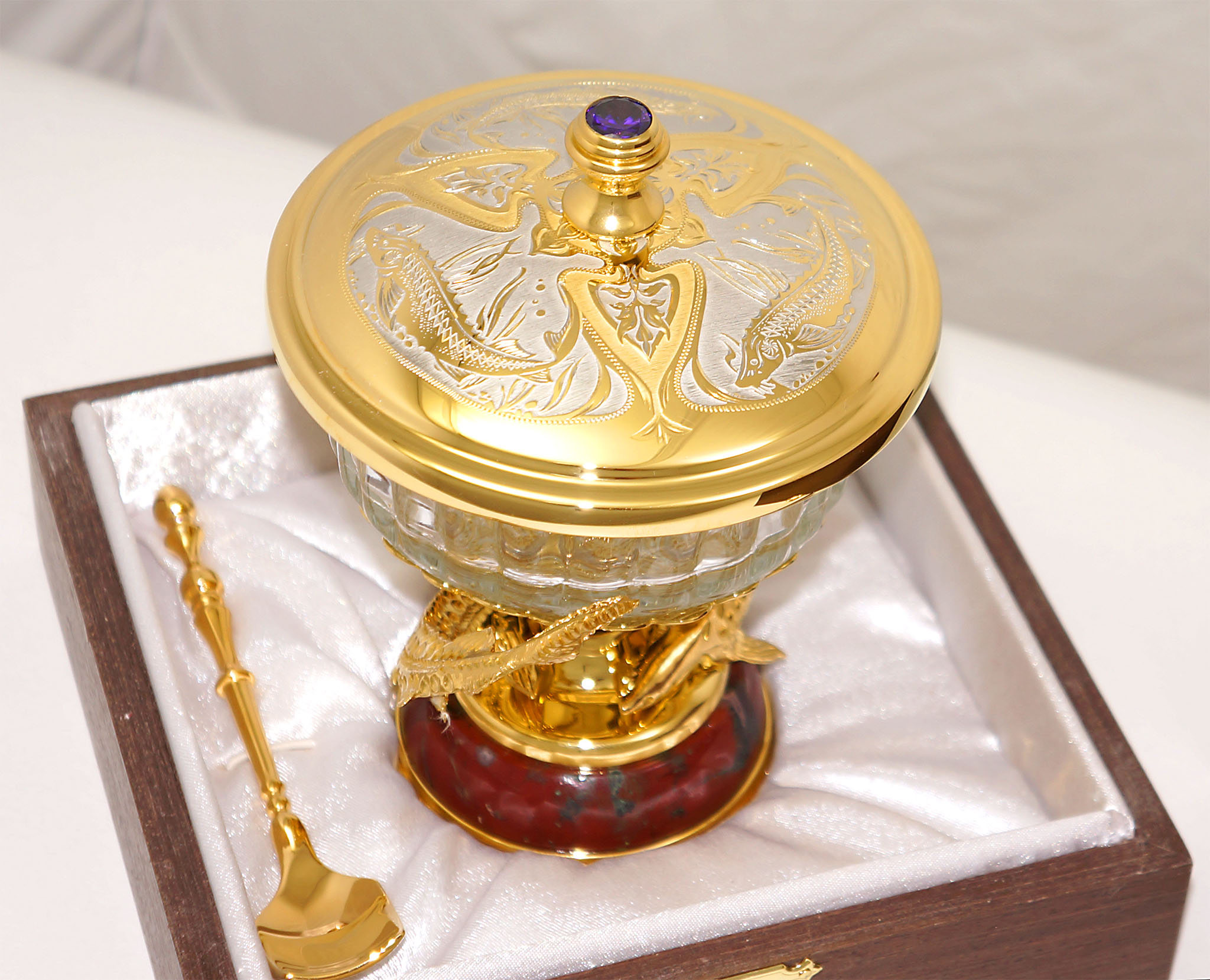 Эта изысканная икорница на яшме от мастеров Златоуста – не просто сервиз для сервировки икры, но и настоящее произведение искусства. Изготовлена на основании из натуральной яшмы, что придает ей вес и солидность. Украшена литьем в виде осетров, добавляющим нотку элегантности. Стеклянная чаша, вставка из фианита в крышке и литьевая ложка дополняют ее благородный облик. Икорница на яшме будет не только украшением стола, но и отличным подарком для любителей роскошных вещей и гурманов. Подходит как для торжественных мероприятий, так и для романтического ужина. |