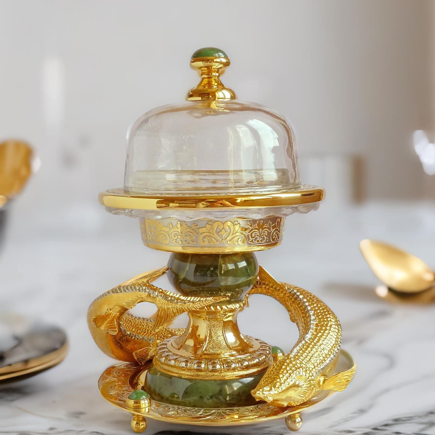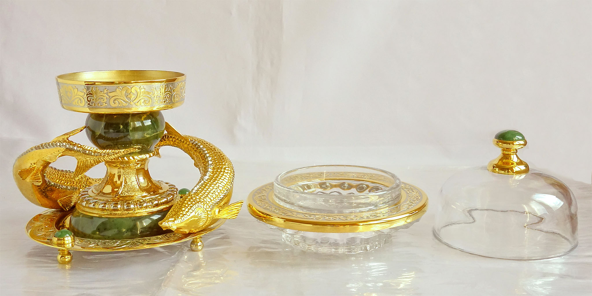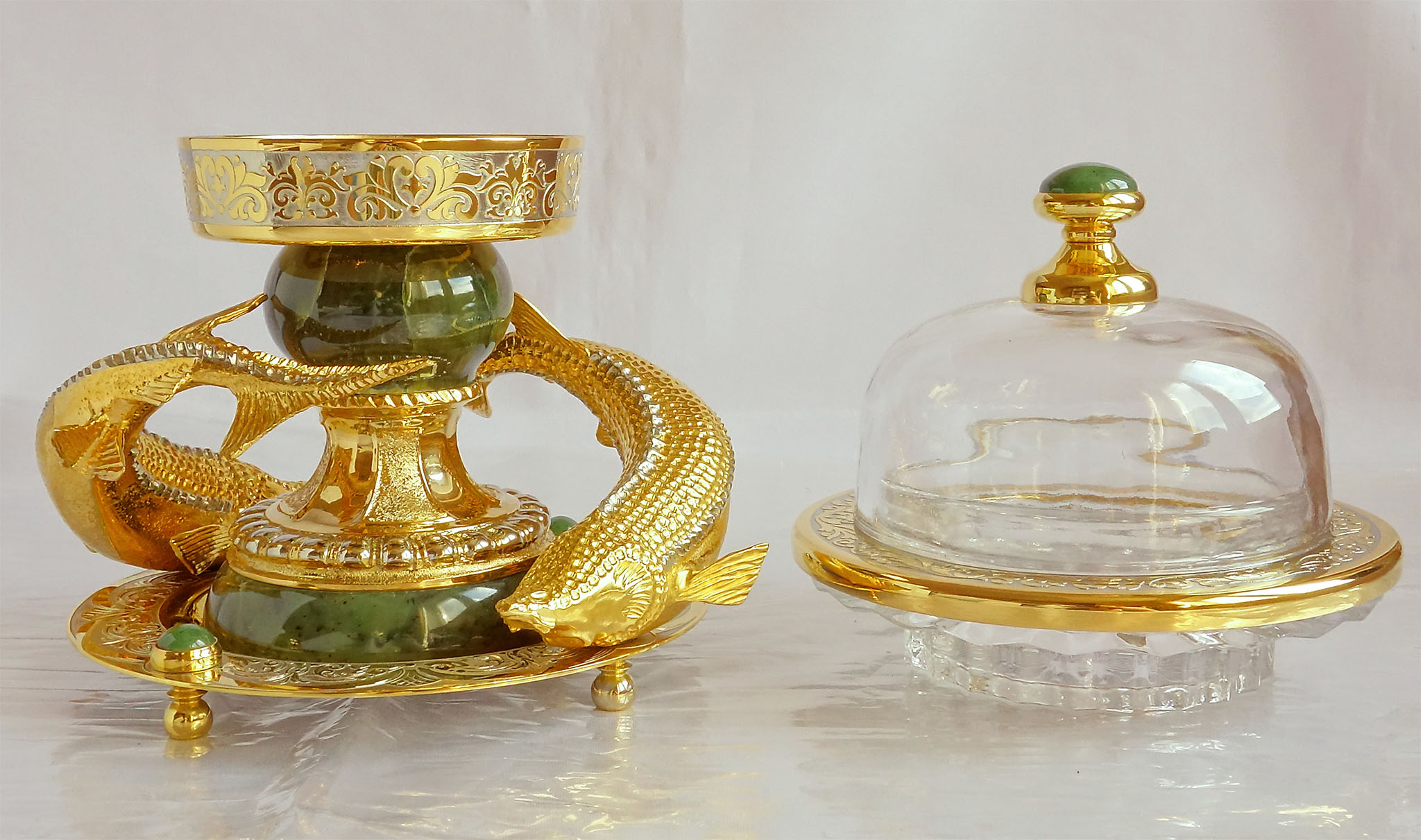 Очень массивная и основательная икорница. Она заняла почетное место в моей квартире. Прекрасное сочетание золота, стекла и нефрита. Спасибо за работу |