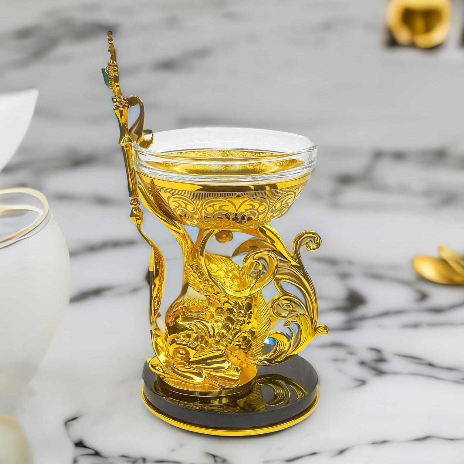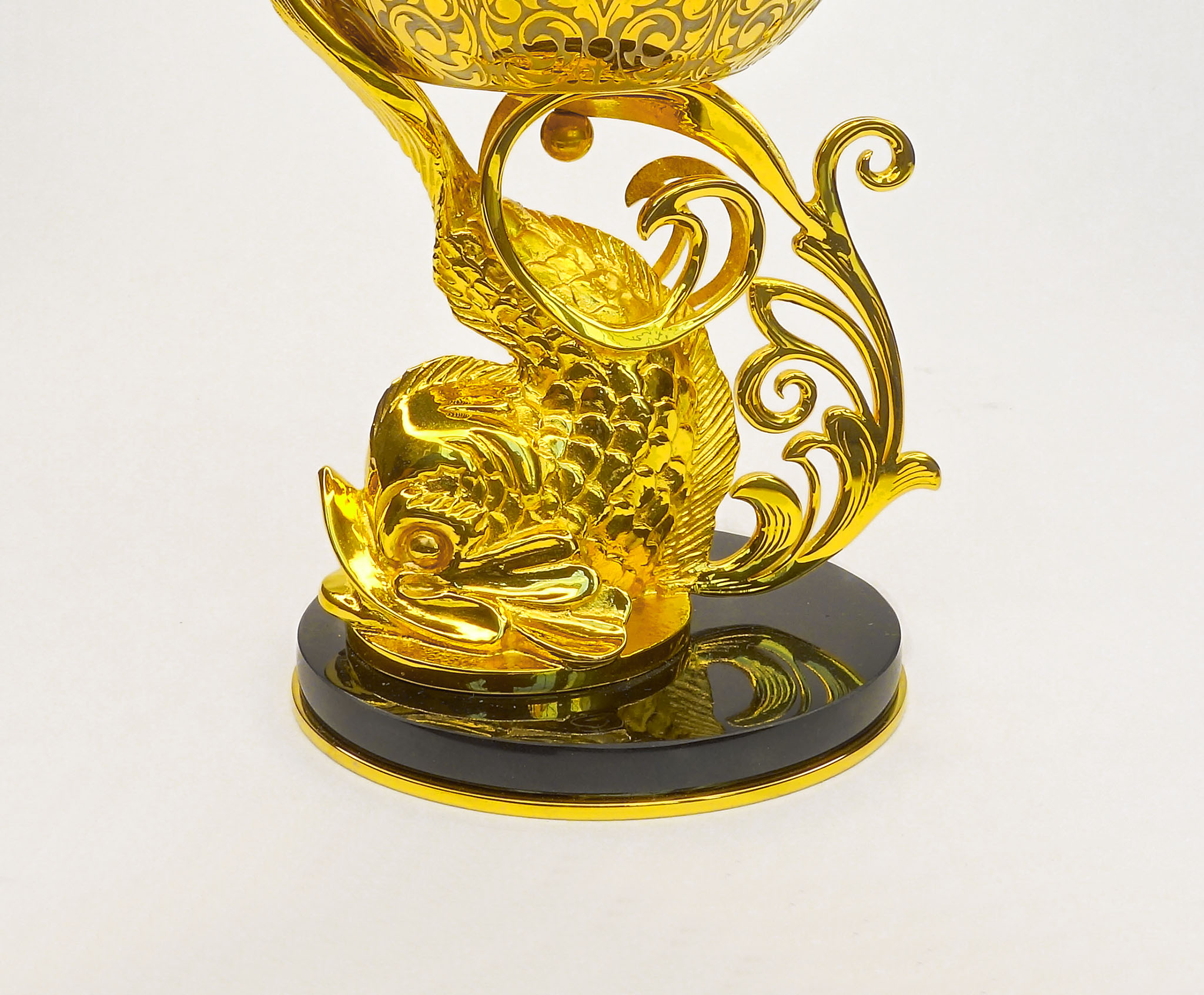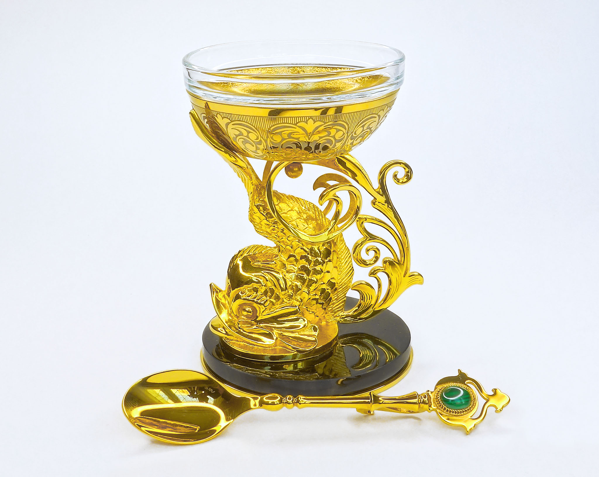 Икорница "Золотая рыбка" из Златоуста - это исключительный элемент сервировки, добавляющий роскошь и элегантность на любой стол. Художественное литье в виде золотой рыбки, держащей стеклянную чашу на хвосте, является примером мастерства и творчества златоустовских ремесленников. Подставка изготовлена из долерита и украшена сложным рельефом. Такая икорница будет выглядеть замечательно на праздничном столе и станет изысканным подарком для любителей искусства и гурманов. |