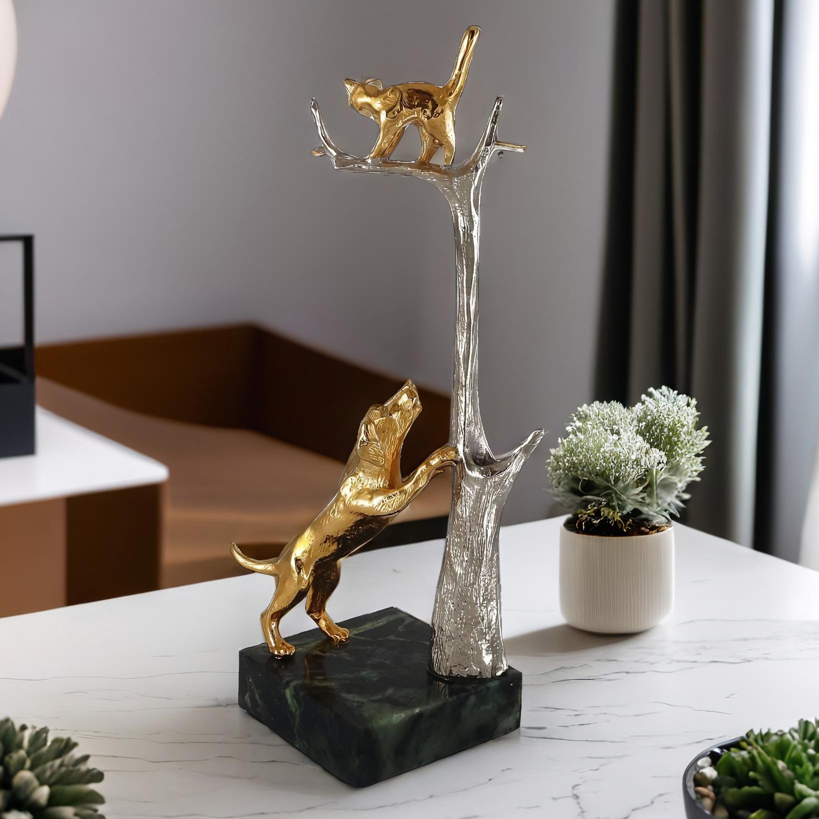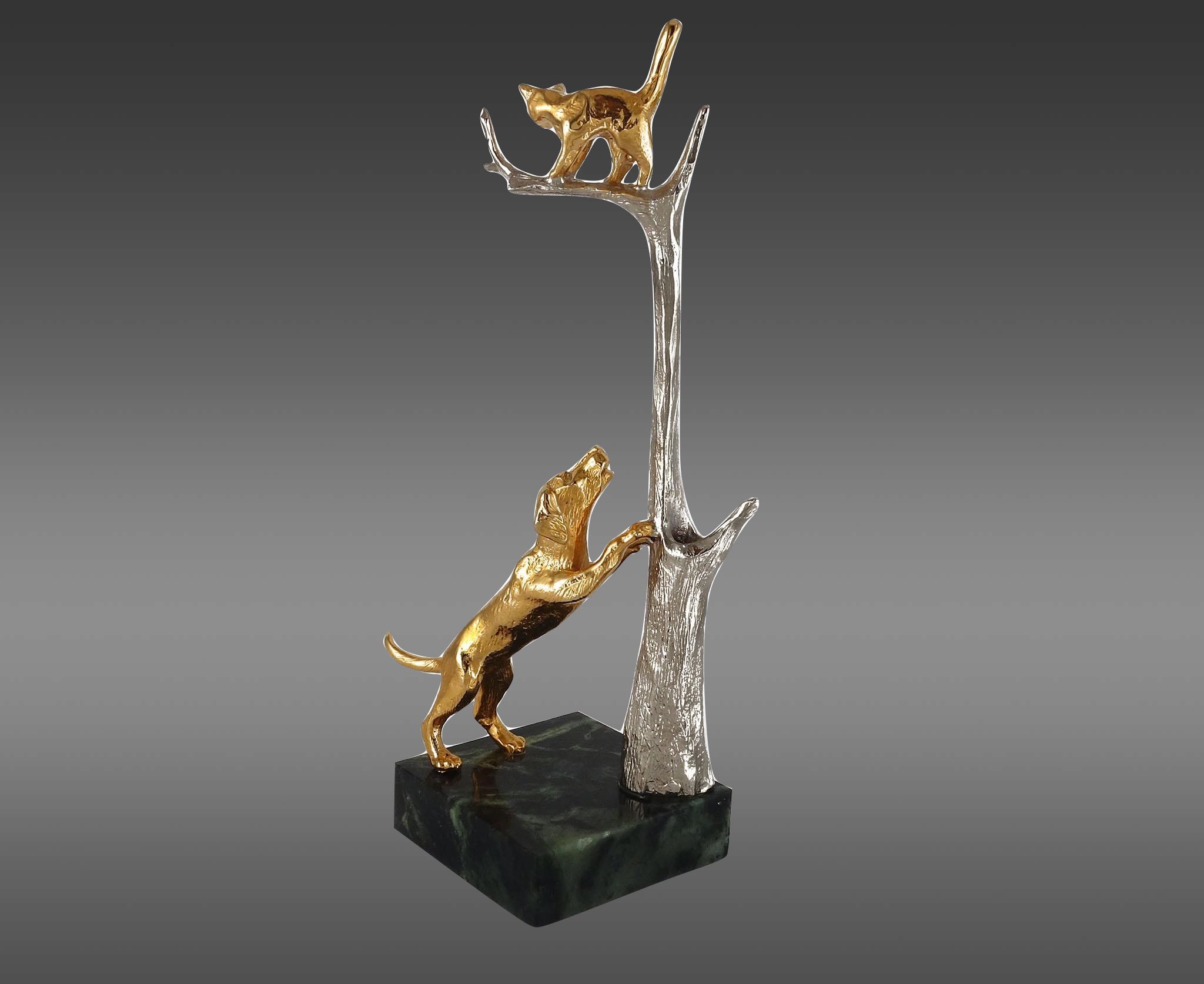 Представляем вам нашу уникальную бронзовую карандашницу Кошка с собакой. Это не просто подставка для карандаша, это произведение искусства, которое украсит ваш рабочий стол и привнесет в его обстановку нотки оригинальности и стиля. Этот позолоченная подставка для одного карандаша мастерски выполнена в форме дерева. На нем забавно спряталась кошка, бегая от собаки. Такое зрелище никого не оставит равнодушным!