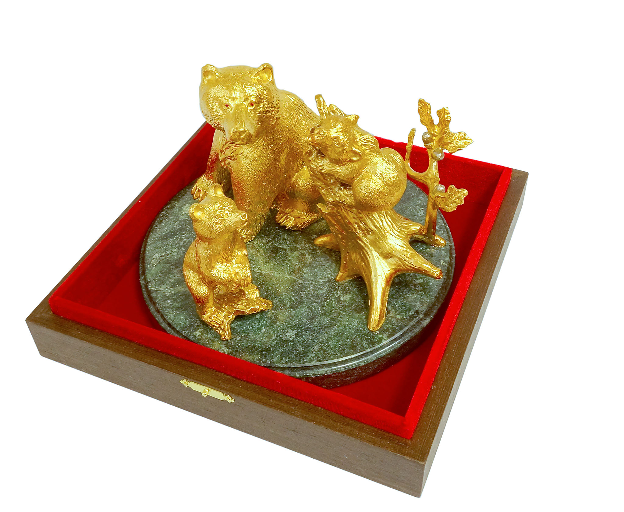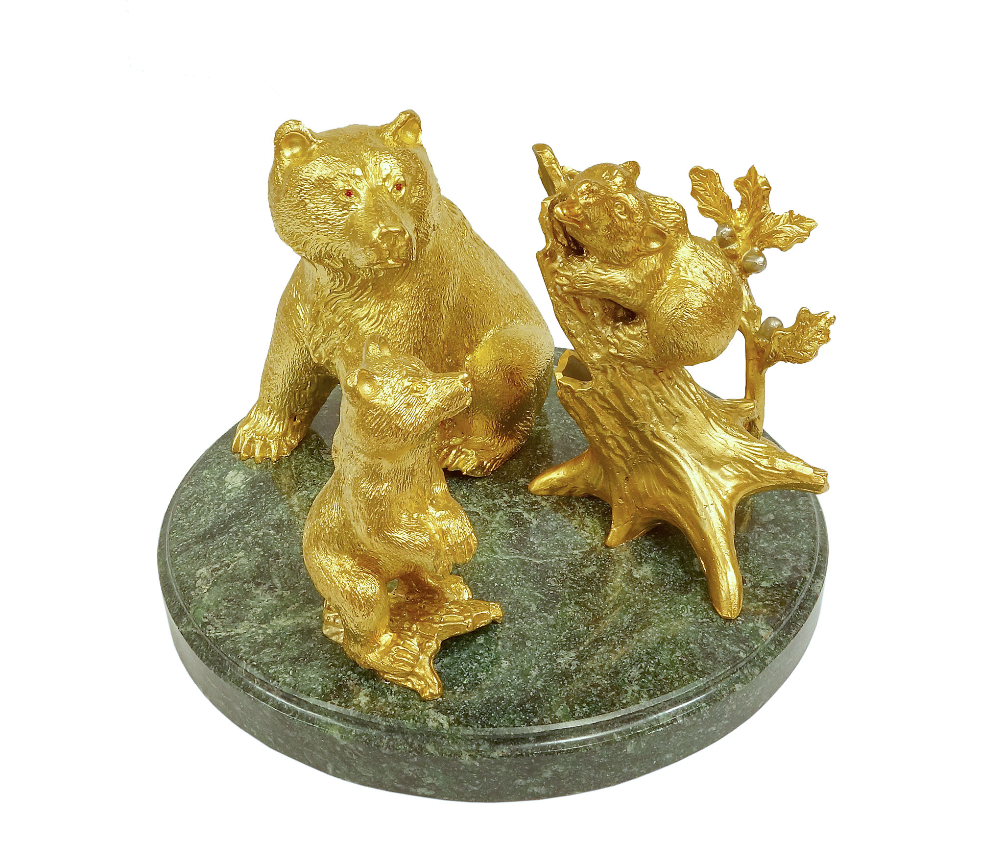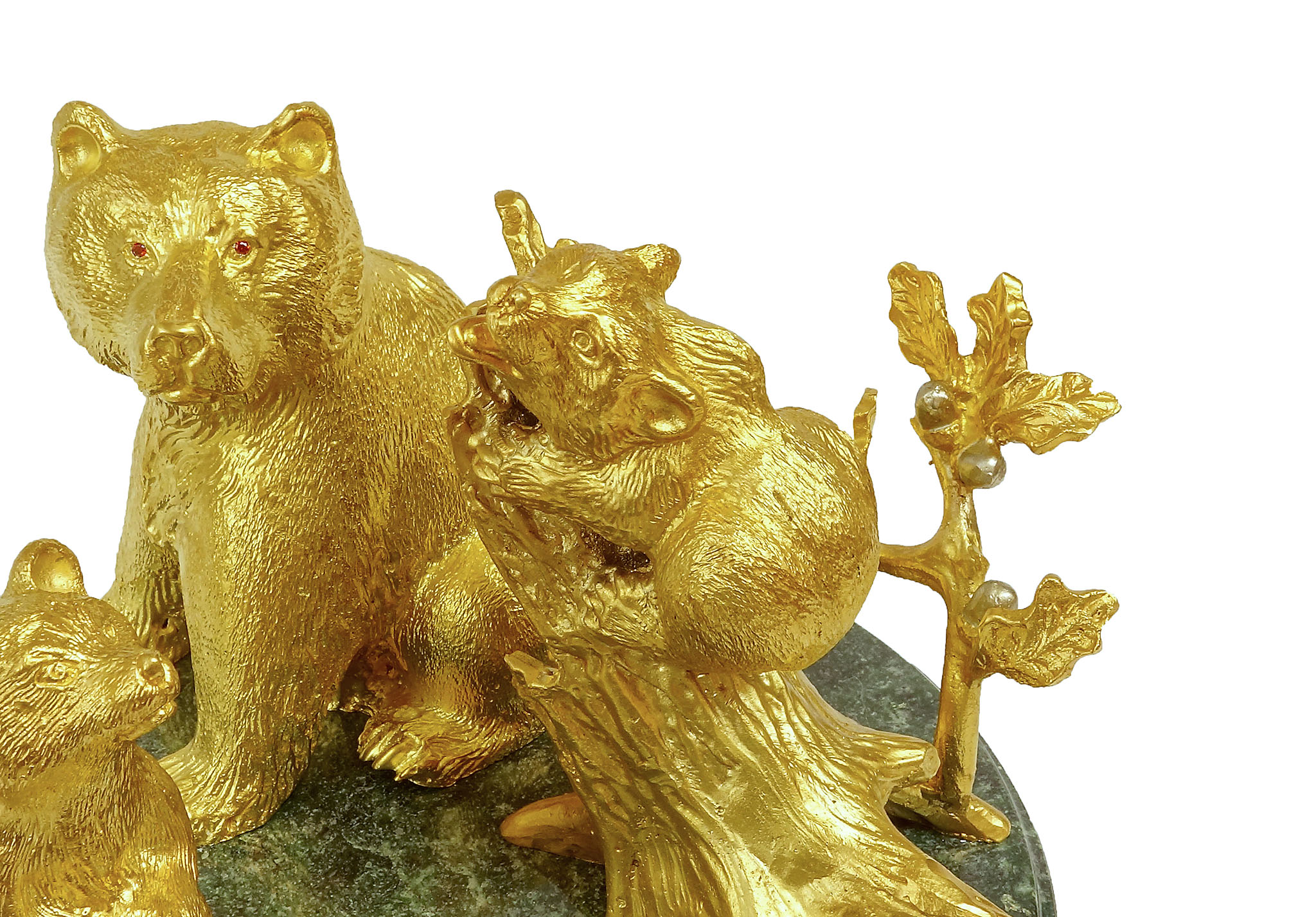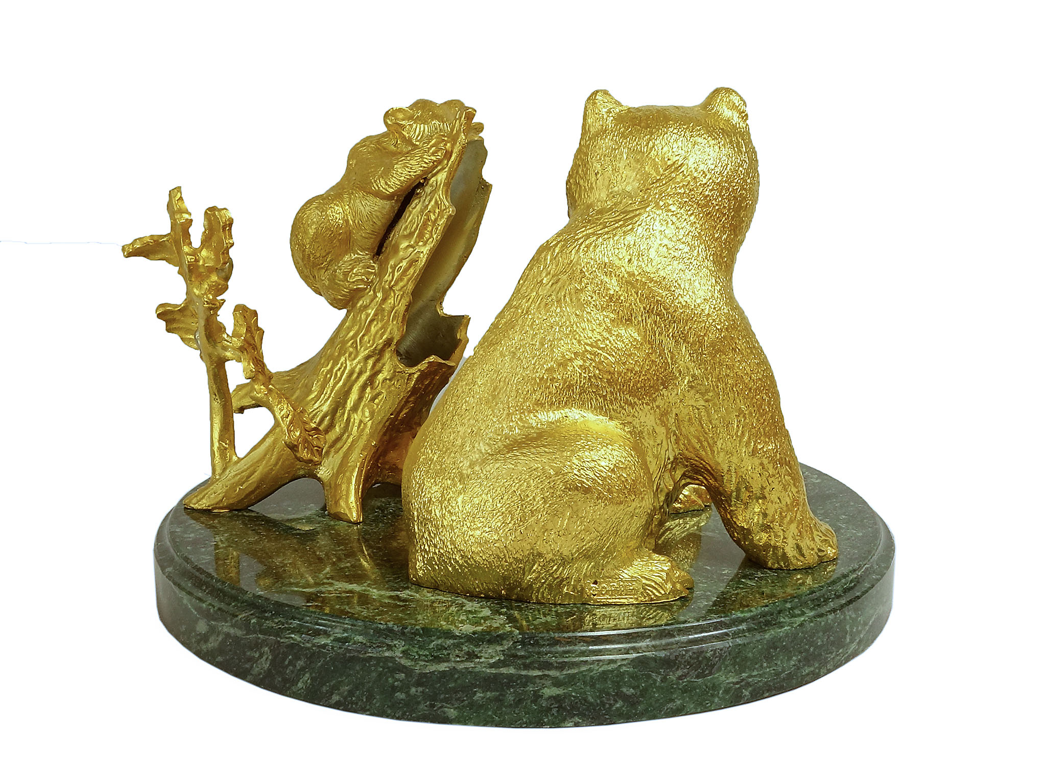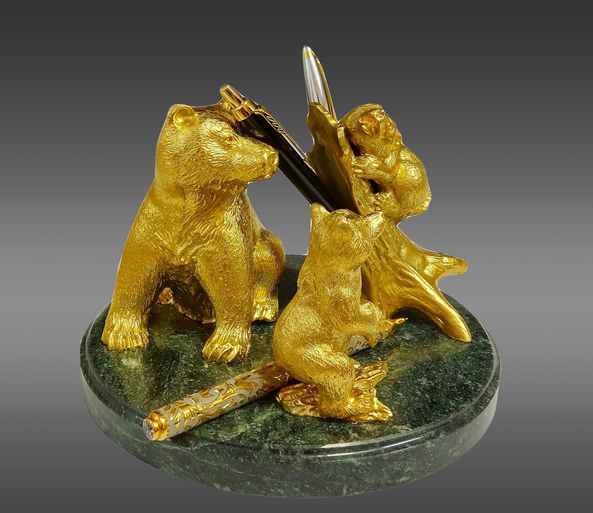 Элегантность, качество и уникальность – именно эти слова первые приходят на ум, когда рассматриваешь бронзовую карандашницу Медведи. Изготовленная из высококачественной бронзы с золочением, эта карандашница станет драгоценностью каждого рабочего стола. Но не только материалы делают её такой особенной. Её ручка украшена по уникальной технологии златоустовской гравюры с золочением, что придает изделию неповторимый, роскошный вид.