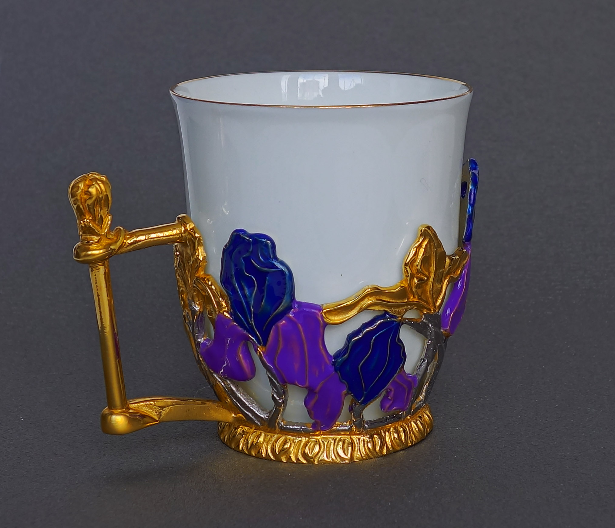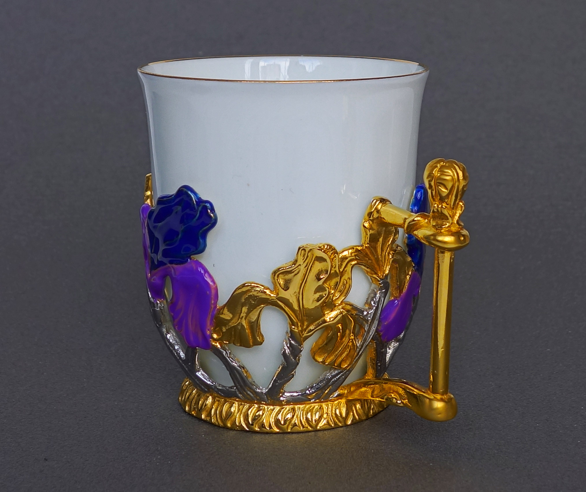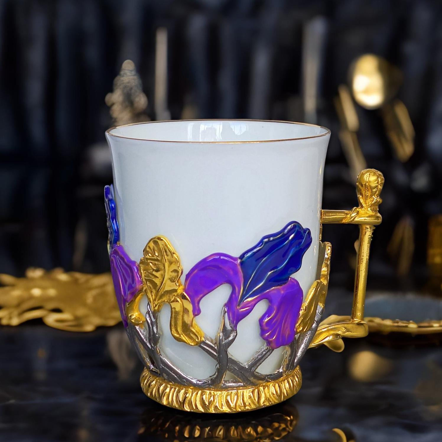 Порадуйте себя или ваших близких превосходной кофейной чашкой «Ирис». Эта фарфоровая кофейная чашка с подстаканником из позолоченной бронзы станет изысканным и стильным дополнением вашего кофейного стола. Дизайн печати вдохновлен красотой и нежностью цветов ириса. Шикарный подстаканник из позолоченной бронзы в виде цветов ириса дополняет общий стиль кофейной чашки и делает ее идеальным подарком для любого ценителя кофе и красивой посуды. Теперь каждая чашка кофе будет настоящим искусством!