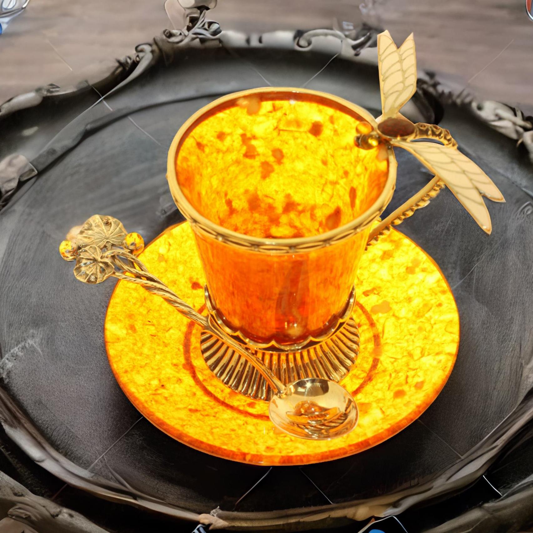 Представьте себе, как каждое утро вы обретаете особенное наслаждение, попивая кофе из янтарной кофейной чашки, декорированной бронзовыми элементами в виде стрекозы. Привнесите в свои будни нотку роскоши!