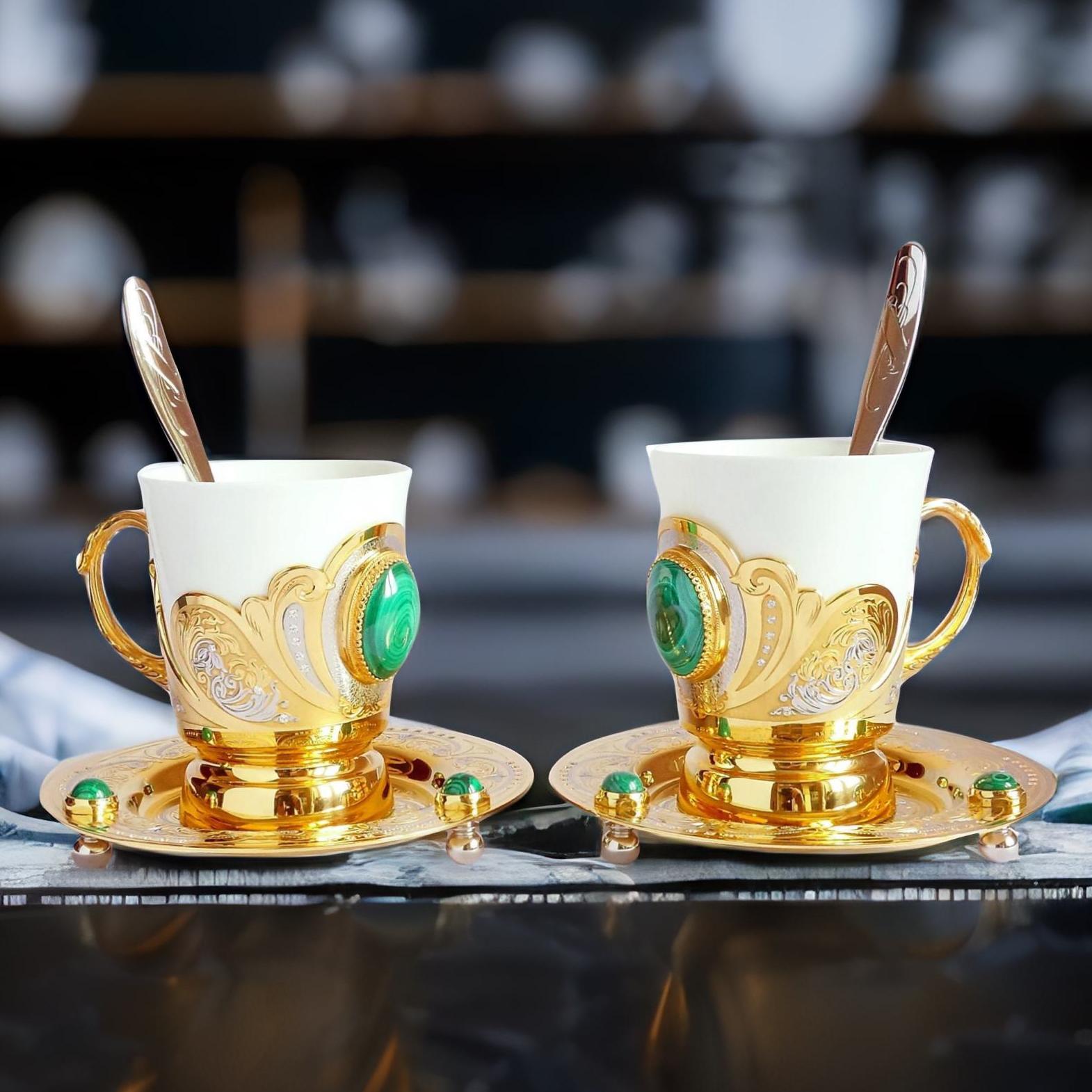 Элегантная кофейная пара "Дуэт" из Златоуста – это прекрасное дополнение для вашего стола. Набор состоит из двух фарфоровых чашек и блюдец, каждый элемент которых украшен ювелирными вставками из малахита. Благородный оттенок малахита искусно сочетается с белоснежным фарфором, делая каждую чашку настоящим произведением искусства. Идеально подходит для утреннего кофе или вечернего чая. Прекрасный выбор в качестве свадебного подарка, подарка на новоселье или для праздничного стола. |