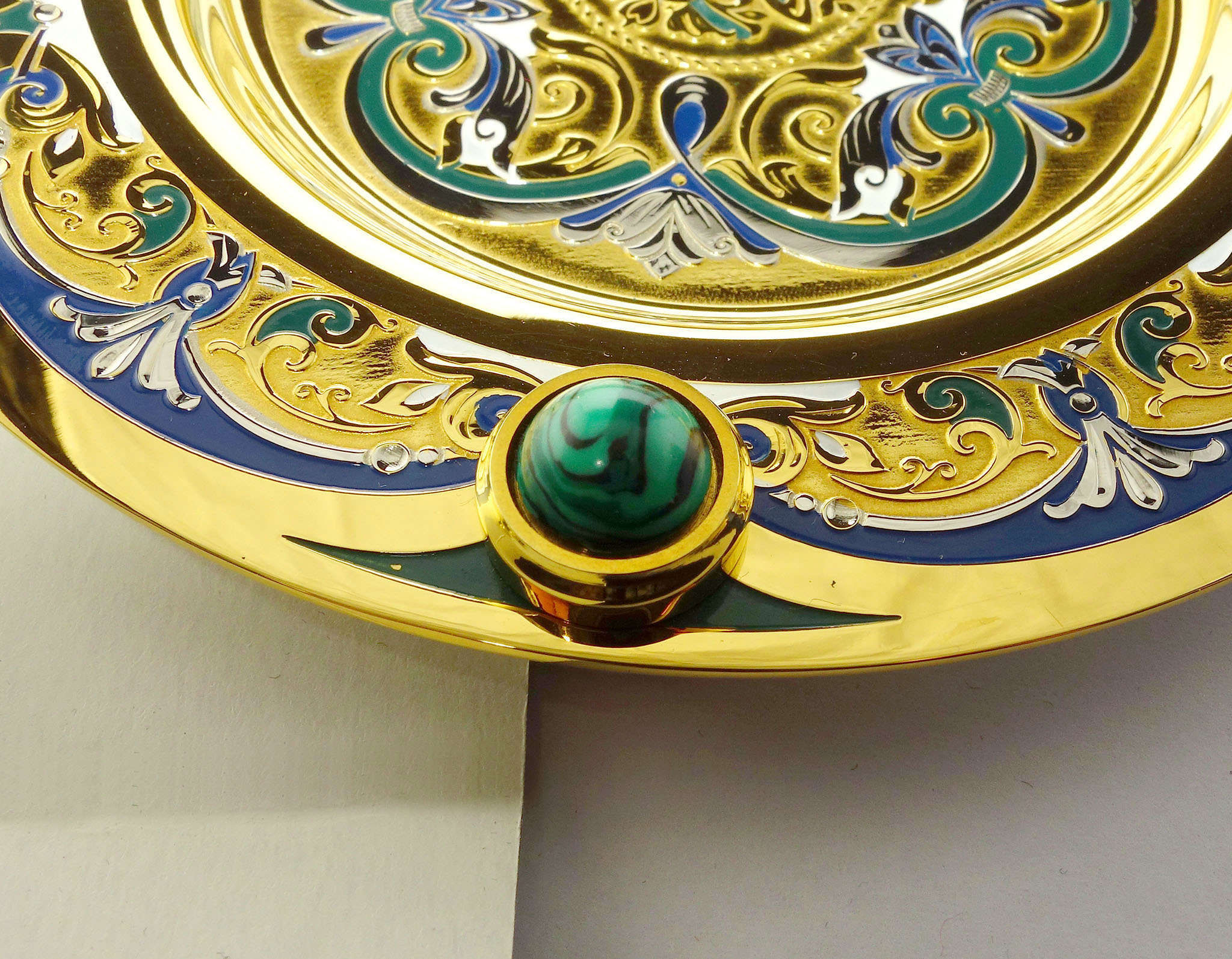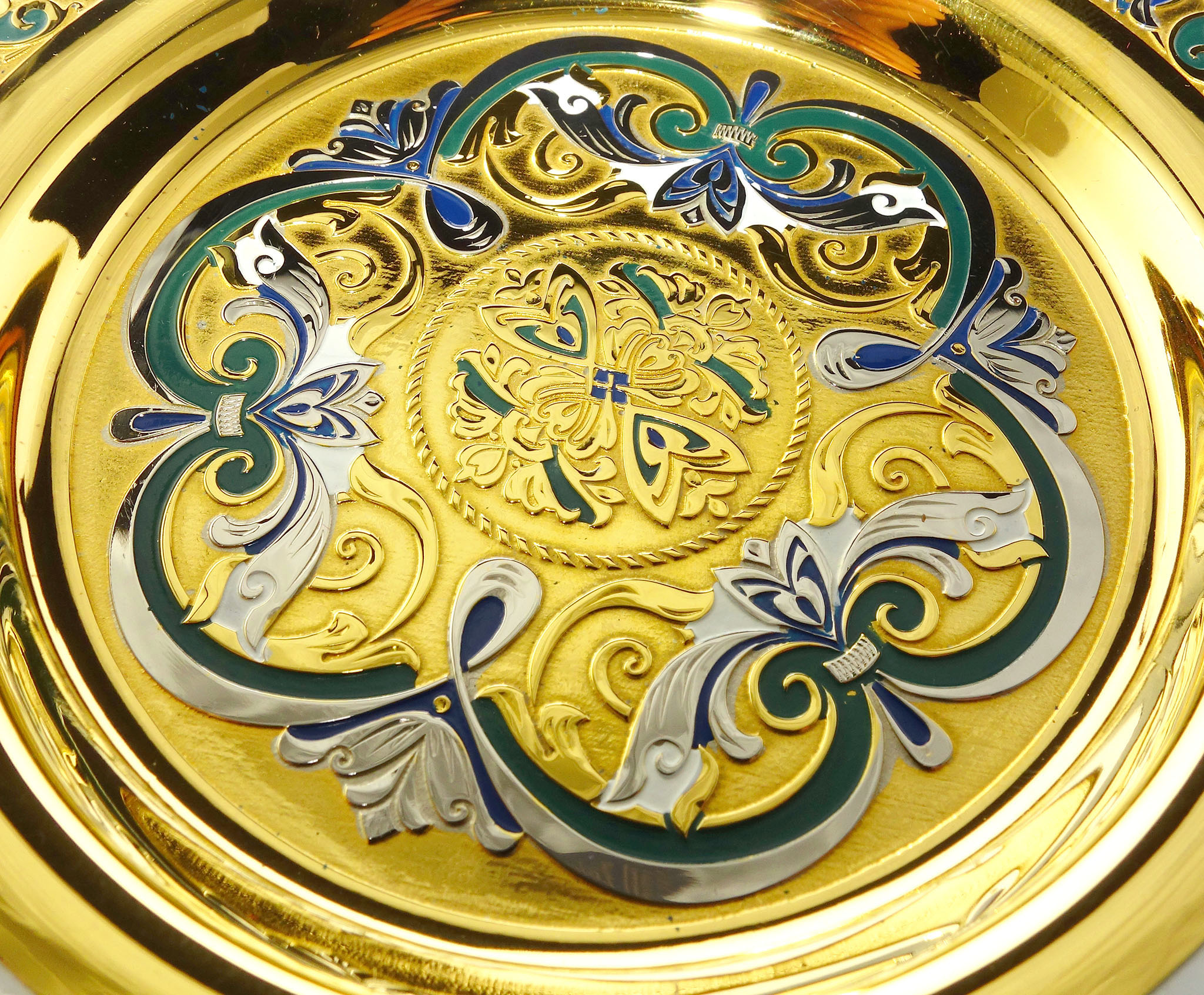 В основе оформления историческая техника Златоустовской Гравюры по металлу. Все этапы работы над изделием: от авторского эскиза до нанесения драгоценного покрытия и ювелирных эмалей, производятся ручным способом, что полностью исключает возможность точного повтора.
