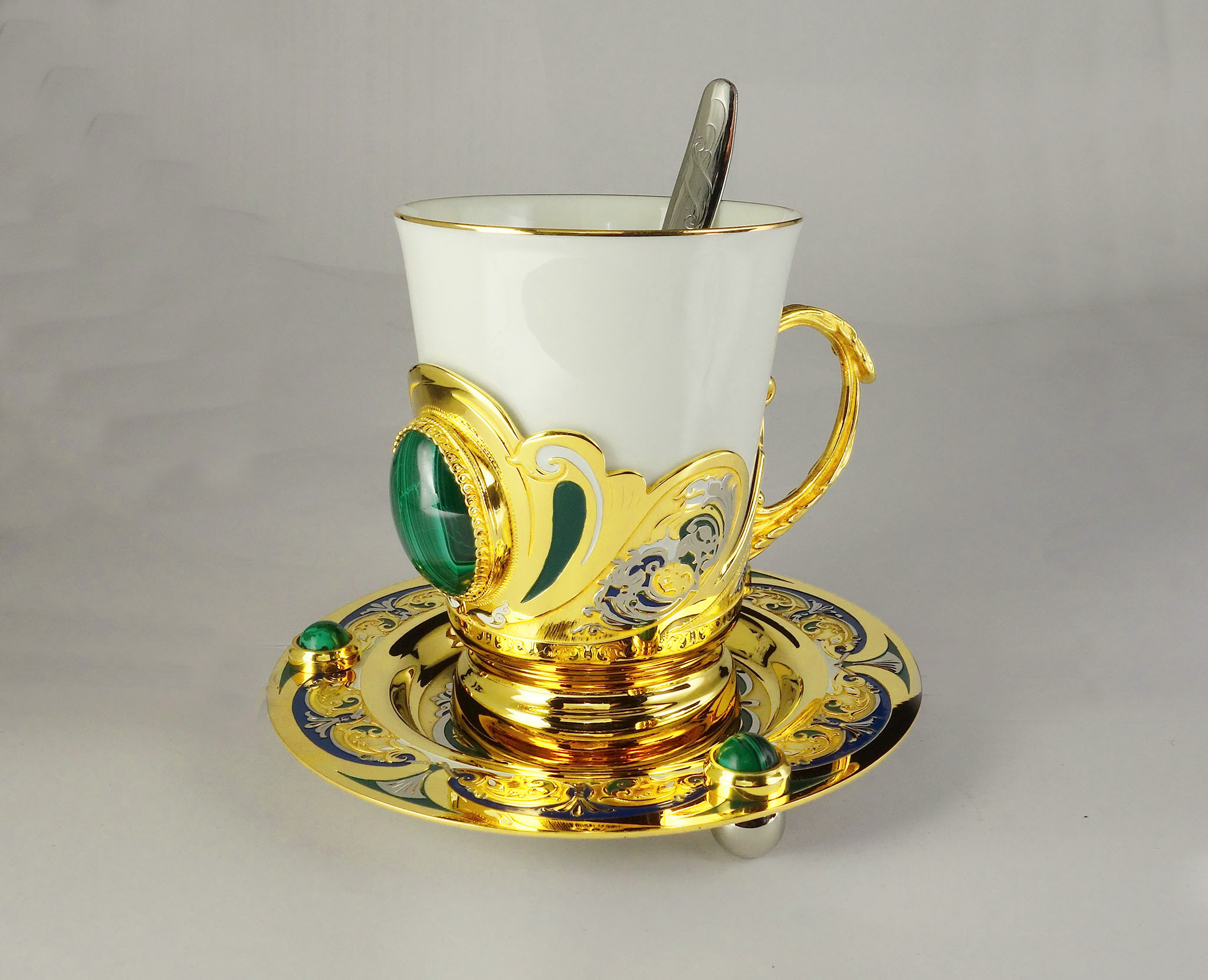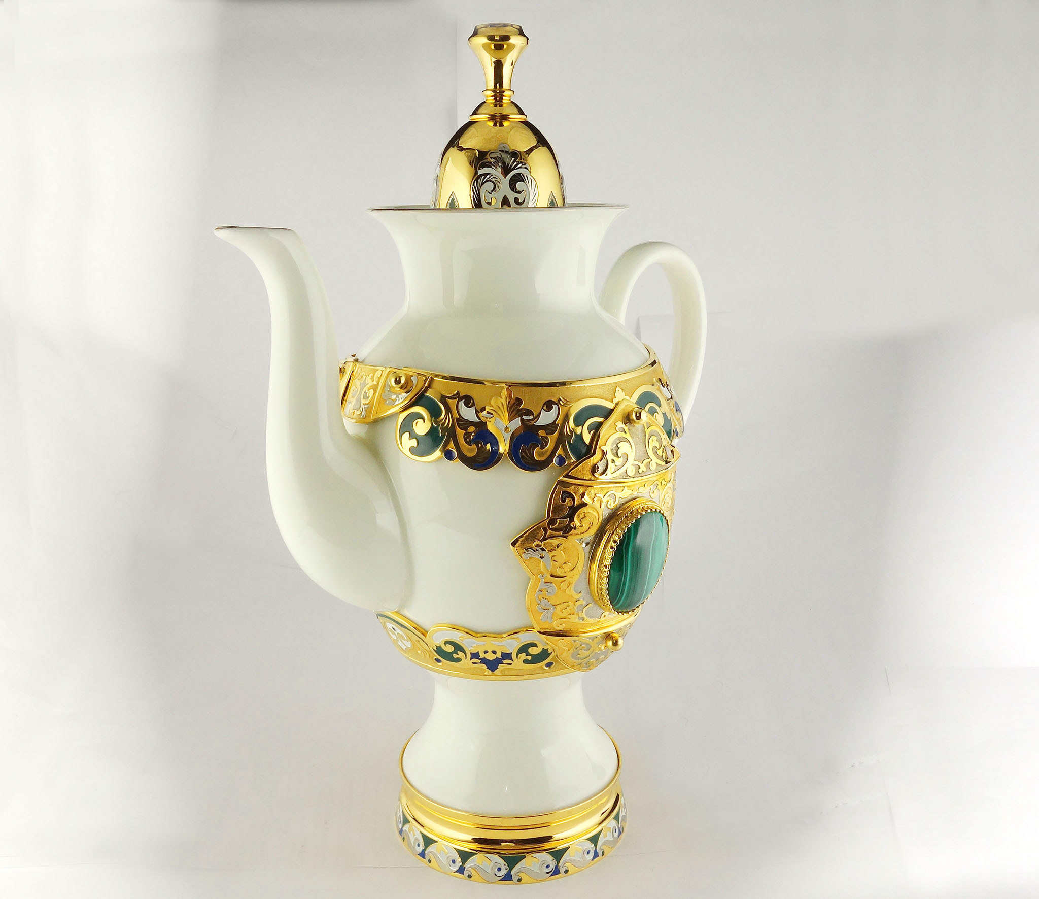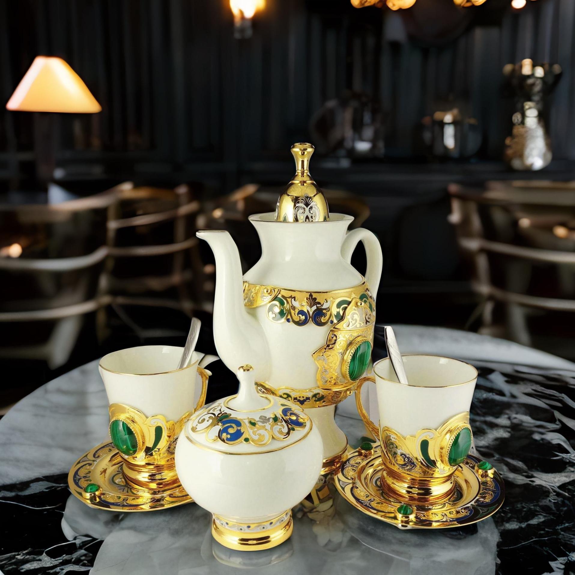 Кофейный набор состоит из чайника, сахарницы и двух чайных пар из фарфора украшен малахитом и дополнен позолоченными чайными ложками из нержавеющей стали, чашками и блюдцами. Уникальная техника изготовления делает подарок эксклюзивным, наделяя его повышенным статусом и коллекционной ценностью.
