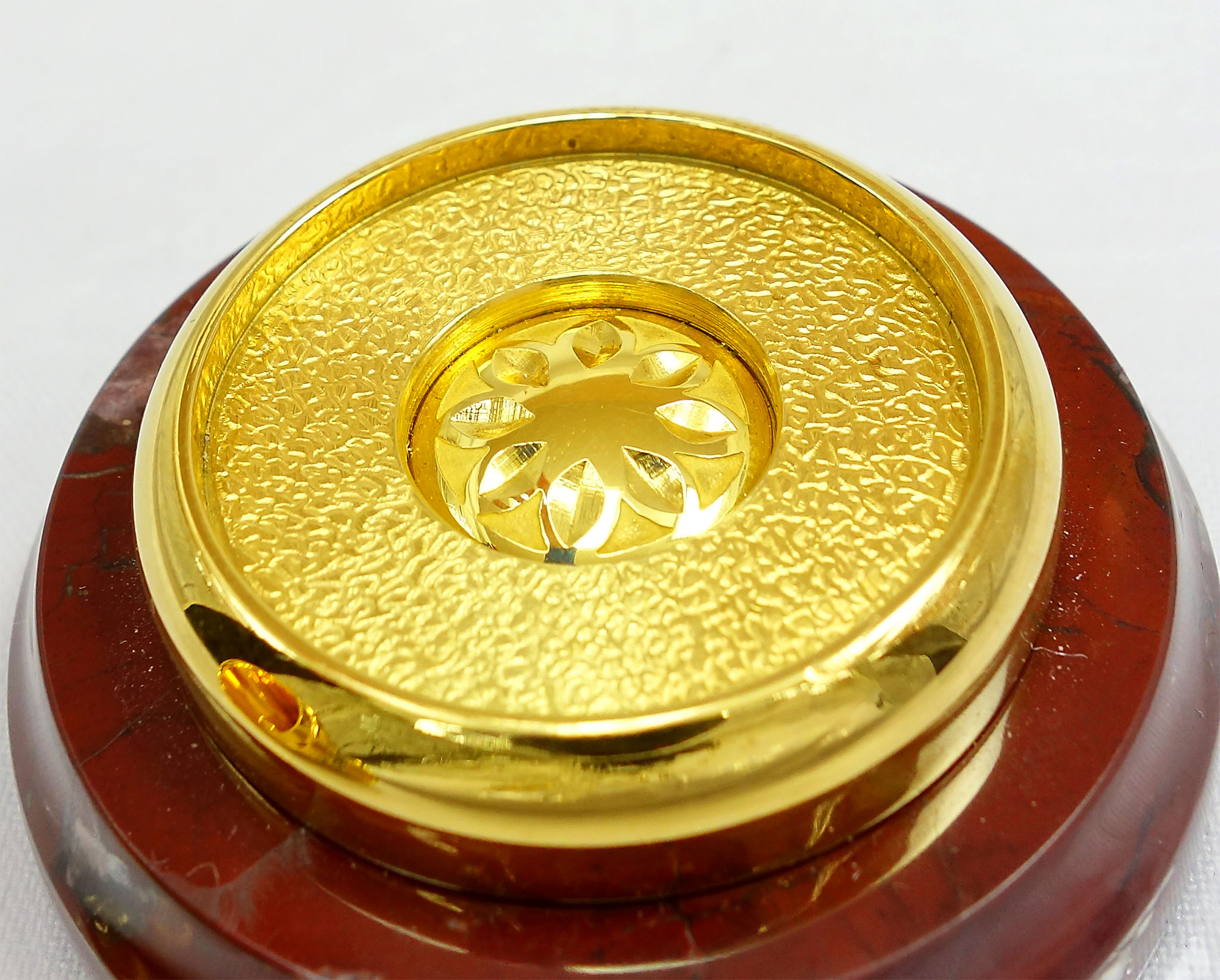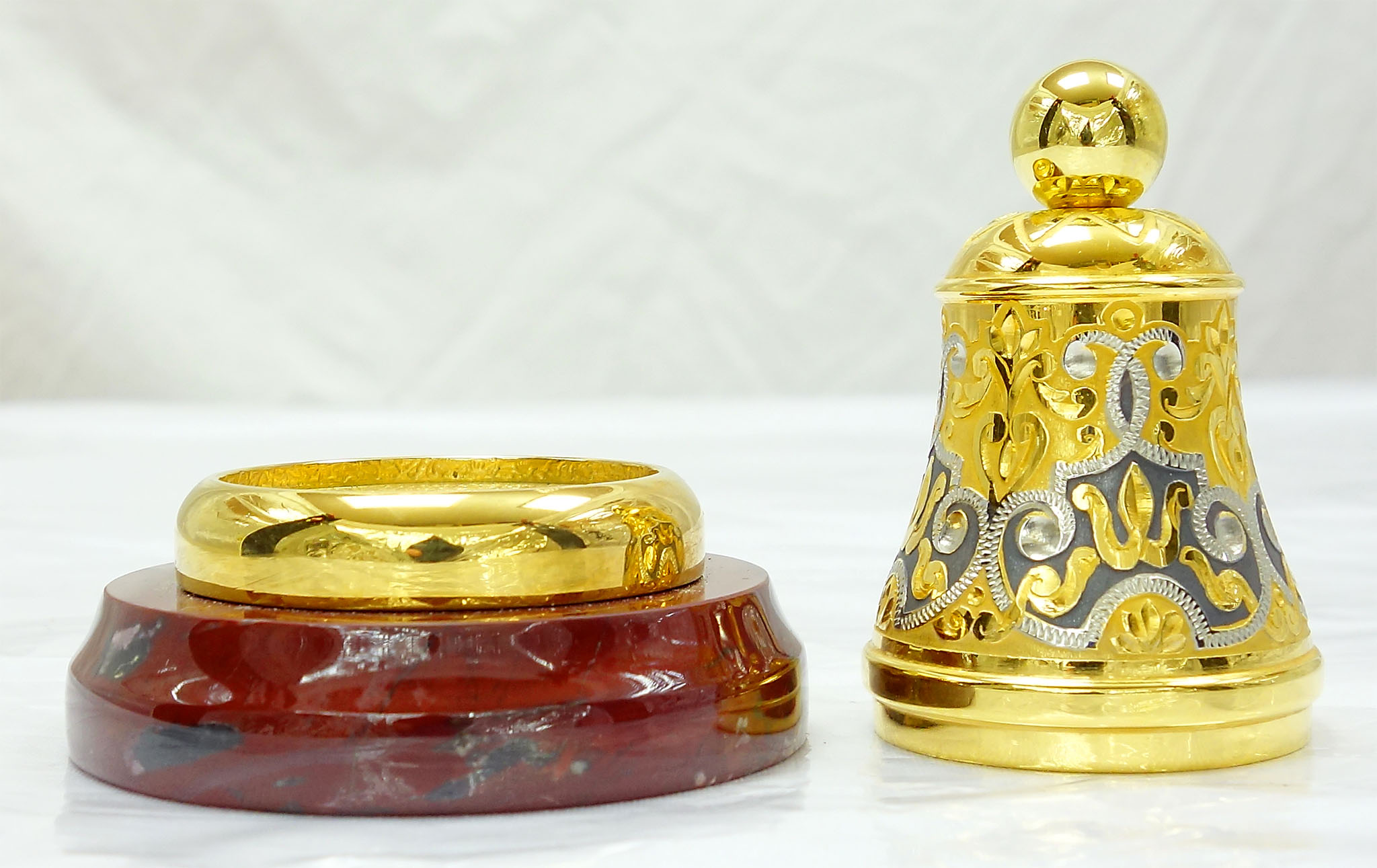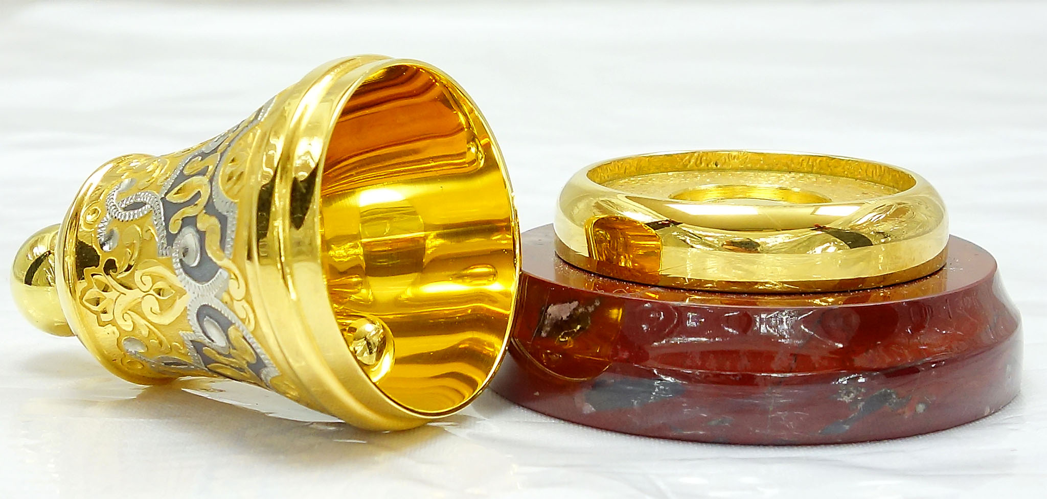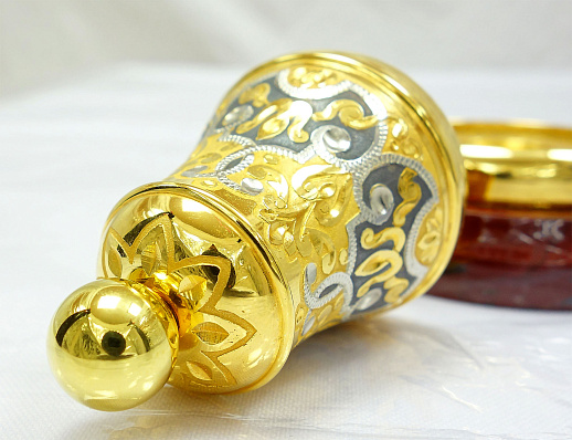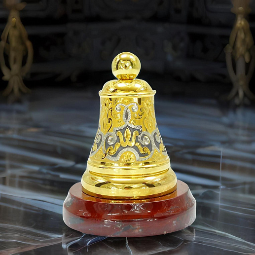 Элегантный колокольчик "Узорный" - прекрасный предмет интерьера и подарка. Выполнен из качественного металла и украшен сложными узорами, выгравированными вручную. Колокольчик установлен на подставке из натуральной яшмы, что добавляет ему благородства и элегантности. В звоне этого колокольчика слышится особая музыка, наполненная теплом и уютом. Подарок, который придется по душе любителю красивых и оригинальных вещей. |