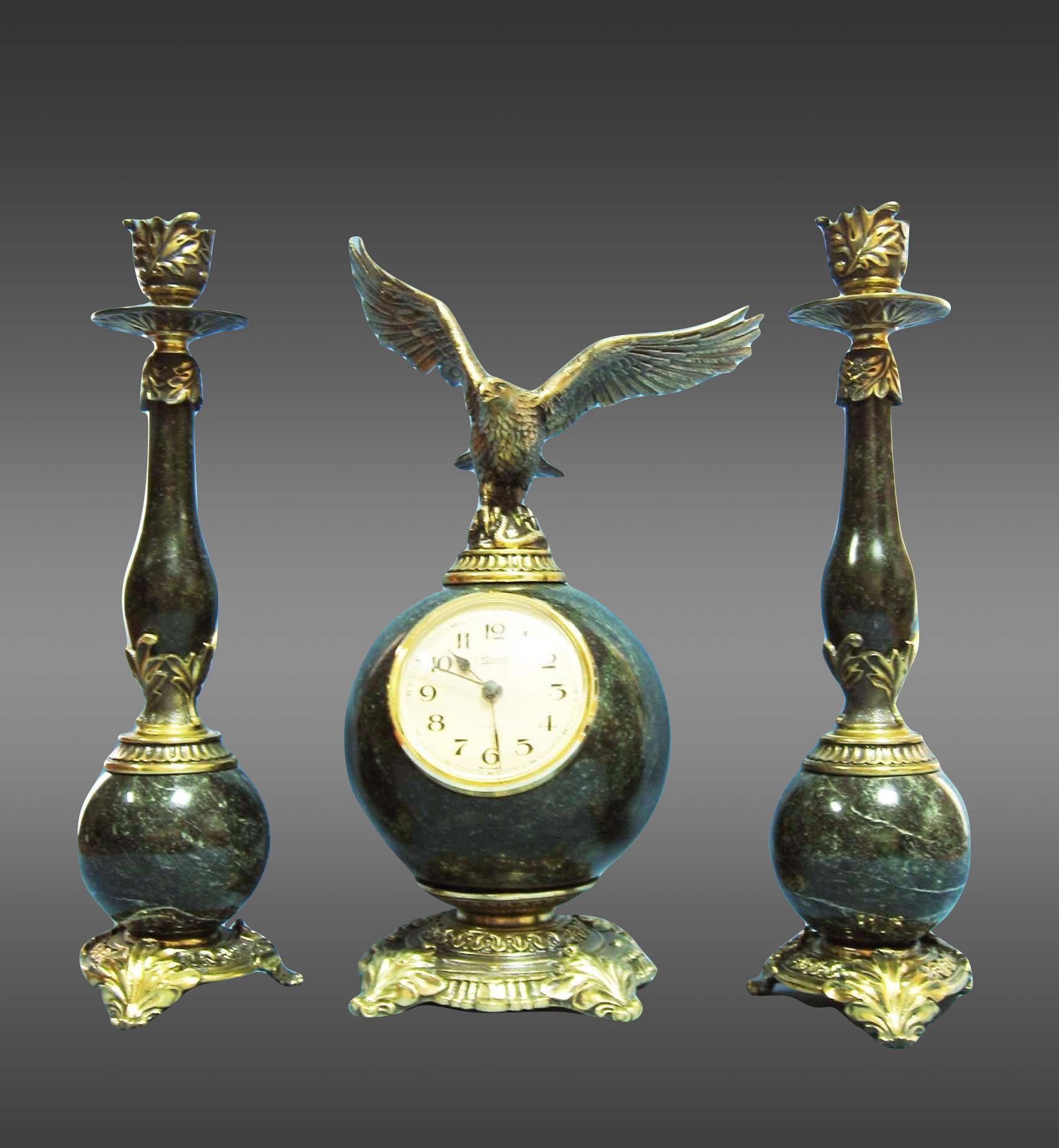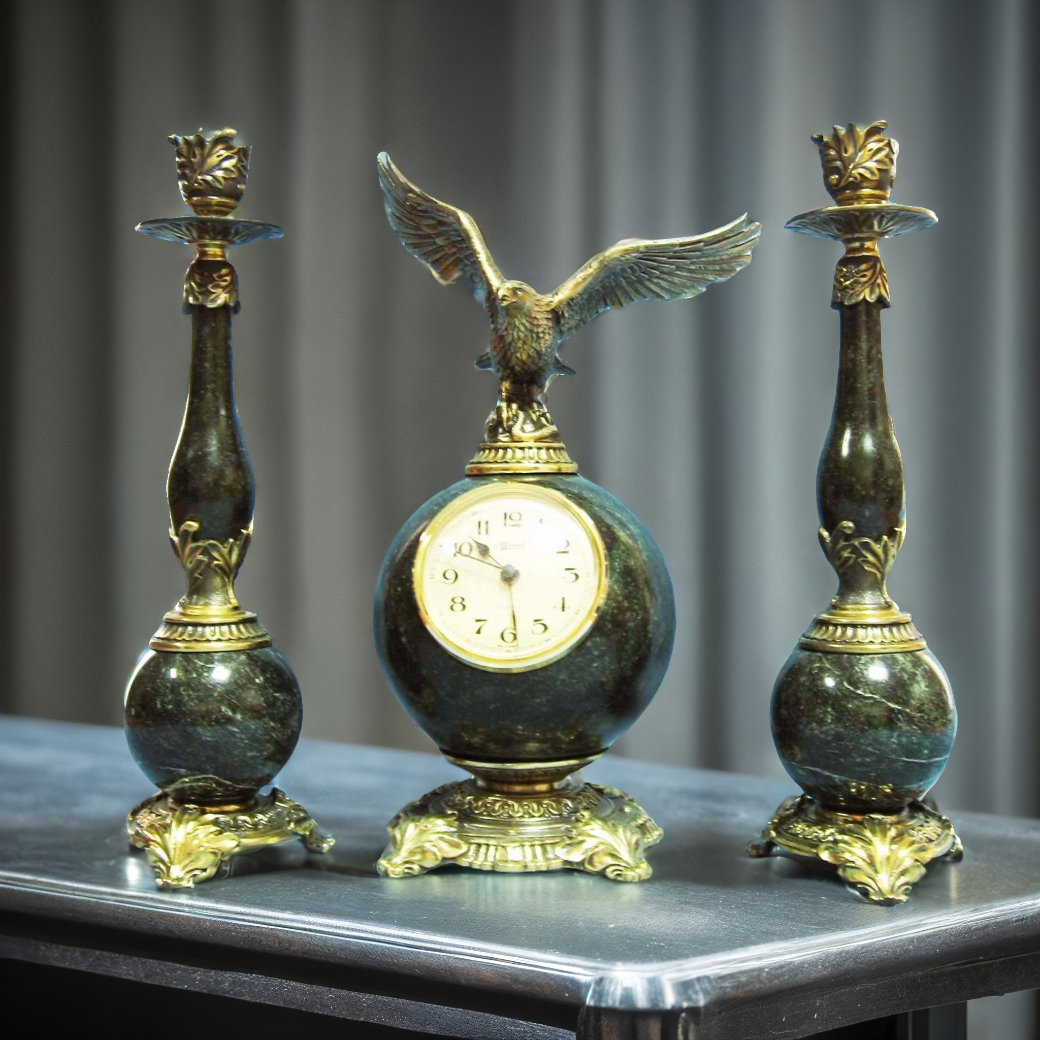 Удивите своих близких и родных уникальным подарком! Представляем вам наши новые настольные часы. Но это не просто часы, а удивительный набор из часов и двух подсвечников, выполненных в едином стиле. Каждый элемент набора изготовлен из редкого материала – змеевика, который украшен бронзовыми элементами. Причем сама статуэтка часов, исполнена в форме гордого орла, также выполнена из бронзы. Вы не только будете отслеживать время с помощью этих часов, но и наслаждаться этим произведением искусства каждый день.