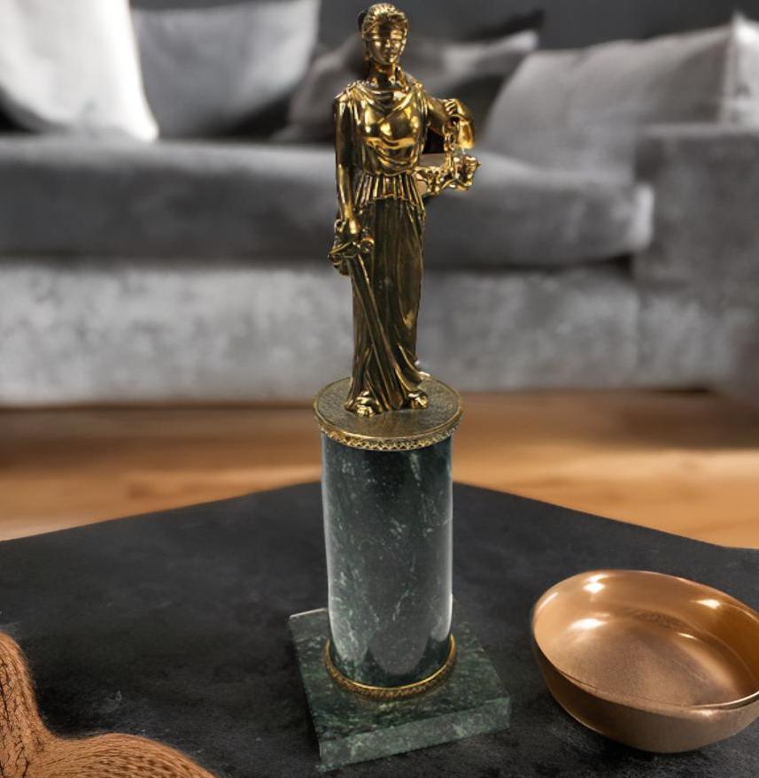 Предлагаем Вашему вниманию уникальную бронзовую композицию «Фемида», выполненную в лучших традициях искусства ковки. Этот изысканный предмет декора гарантированно привнесет в Ваш интерьер нотки элегантности и благородства. Фемида — символ справедливости, представленный в виде богини с весами в руках. Этот образ воспет и узнаваем в культурах всего мира. На нашем сайте Вы можете приобрести эту эффектную композицию по доступной цене! Оцените безупречное качество бронзовой работы, рождающее изящные формы и мелкие детали в этом уникальном искусстве. Отличное дополнение к интерьеру для тех, кто ценит выдержанный стиль и хочет подчеркнуть свою любовь к искусству. |
