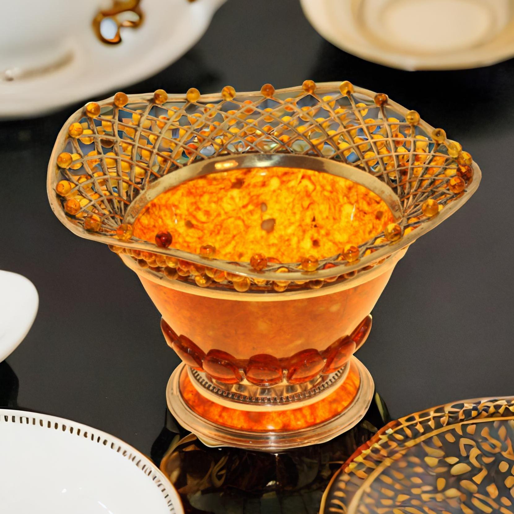 Представляем Вашему вниманию конфетницу ручной работы из янтаря, украшенную бронзовыми элементами. Это не просто удобная вещь для хранения конфет, но и настоящее произведение искусства, которое придаст особенный шик и стиль Вашему интерьеру.