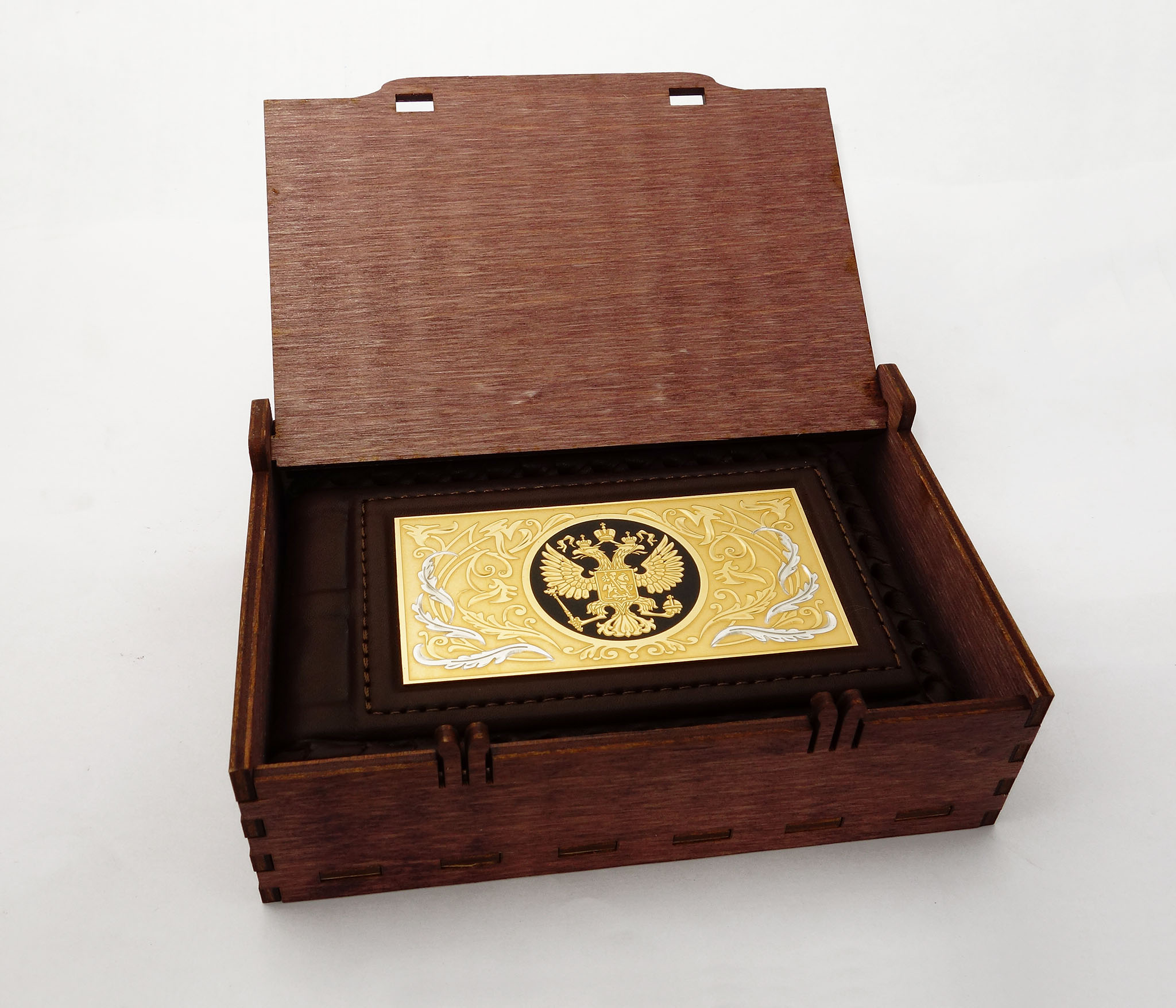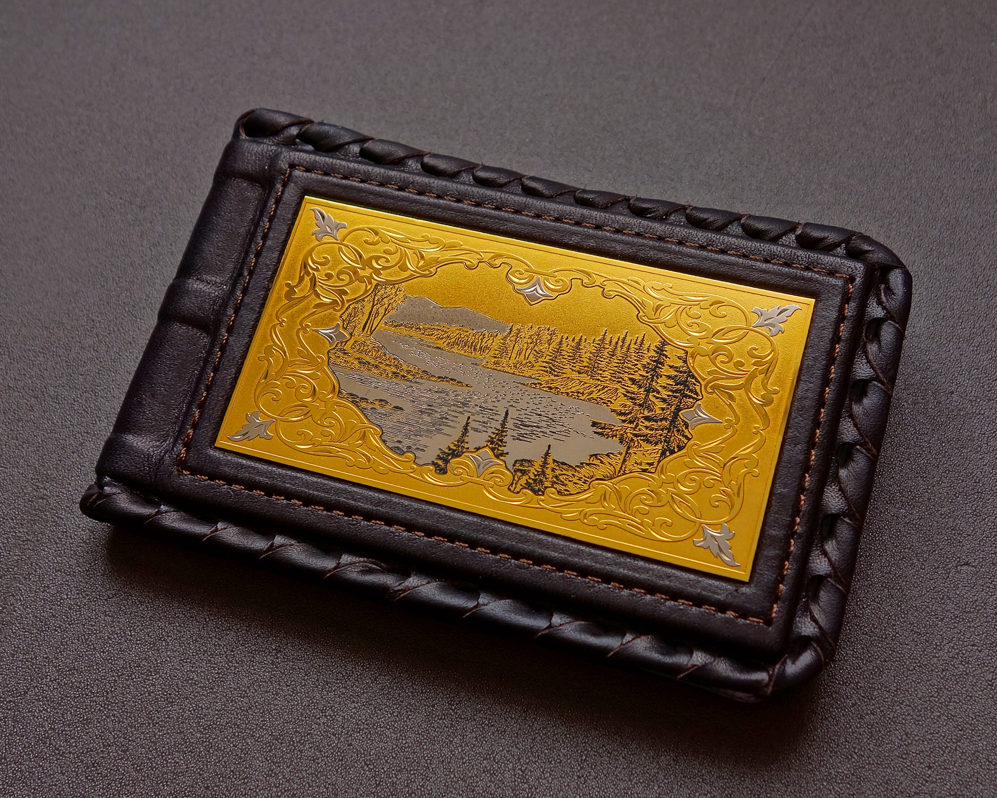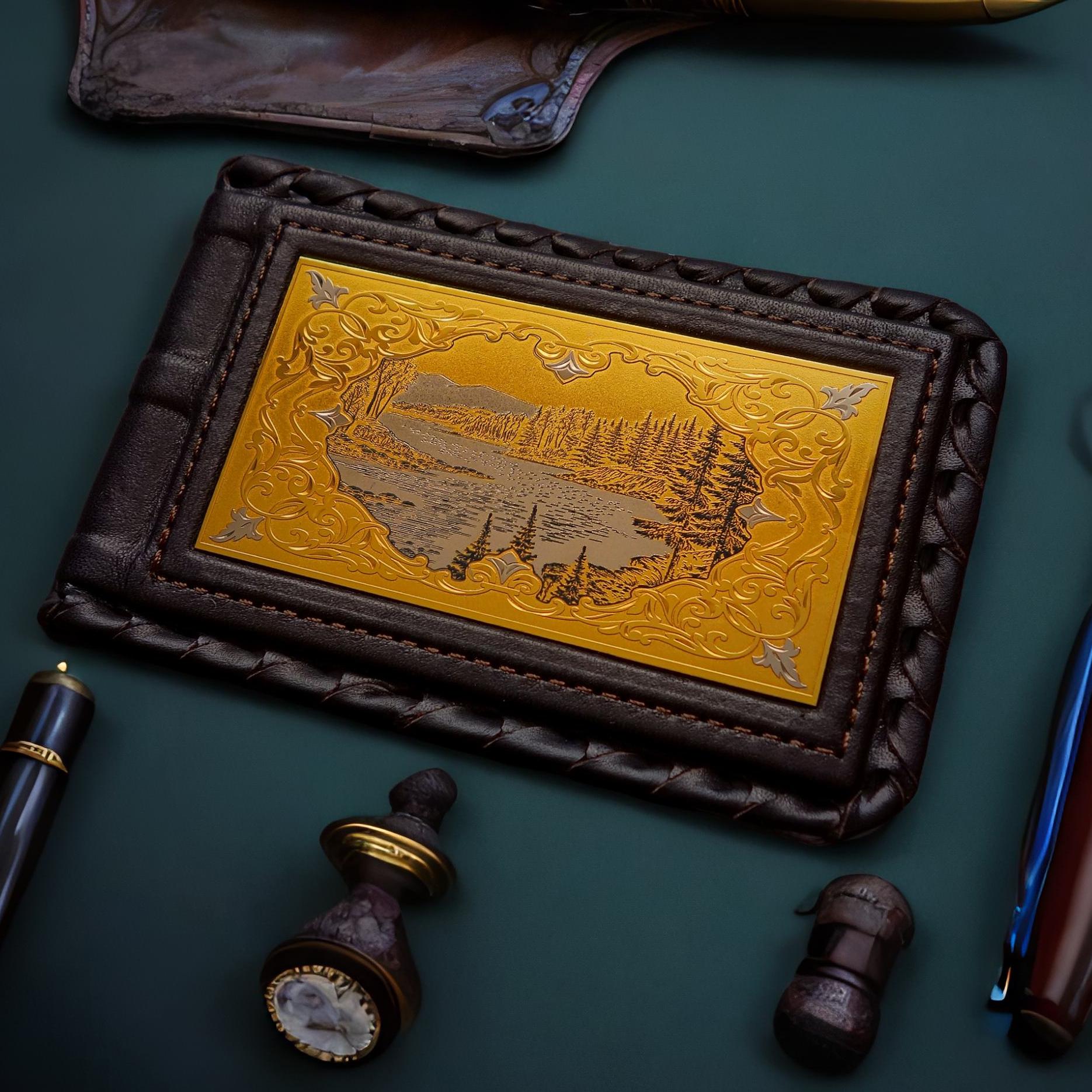 Уникальная и стильная кожаная визитница Природа России станет отличным подарком для деловых людей. Изготовлена из натуральной кожи и роскошно украшена в духе златоустовской гравюры с использованием метода золочения.