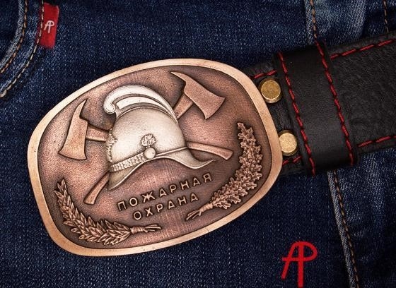 Кожаный ремень "Пожарная охрана" пряжка отлита из сплава бронзы, обработка производится в ручную мастерами чеканки и полировки. Полоса изготовлена из натуральной кожи , прошита лавсановой красной нитью |