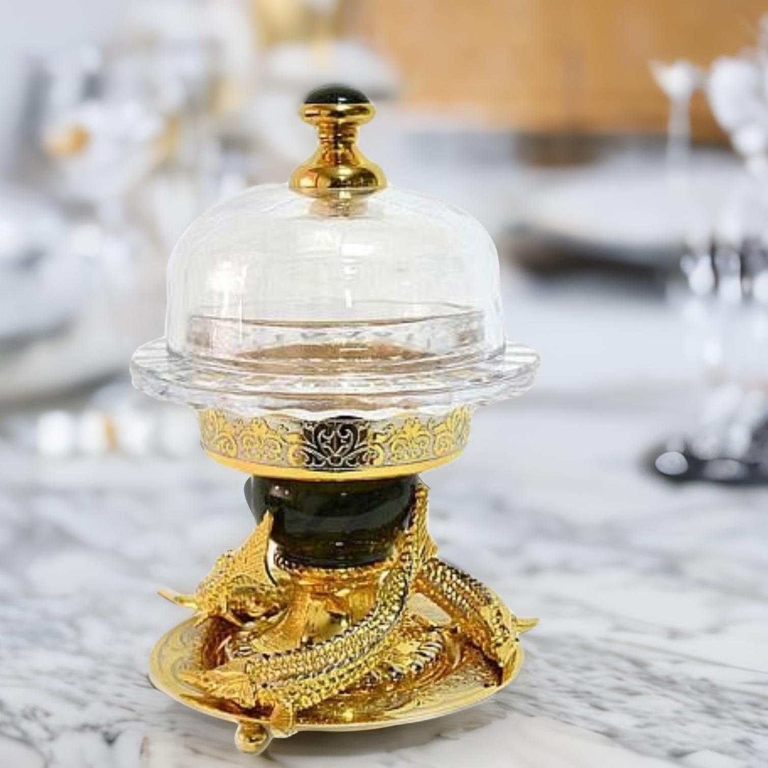 Красивая подарочная икорница из Златоуста является воплощением элегантности и роскоши. Изделие декорировано вставками из натурального нефрита и тремя статуэтками осетров, выполненными в технологии литья. Это подчеркивает его высокое качество и изысканность. Форма и размер икорницы идеально подходят для сервировки стола на торжественных мероприятиях. Икорница также подойдет в качестве подарка для гурманов и любителей роскошного стиля. Ее практичность и долговечность делают ее еще более привлекательной для покупки. |