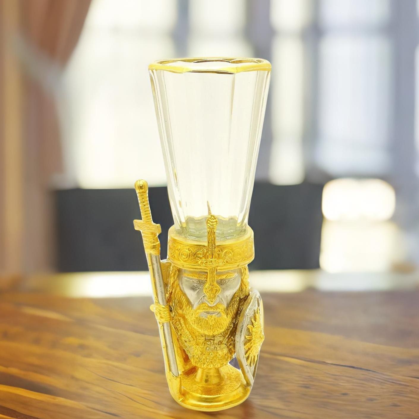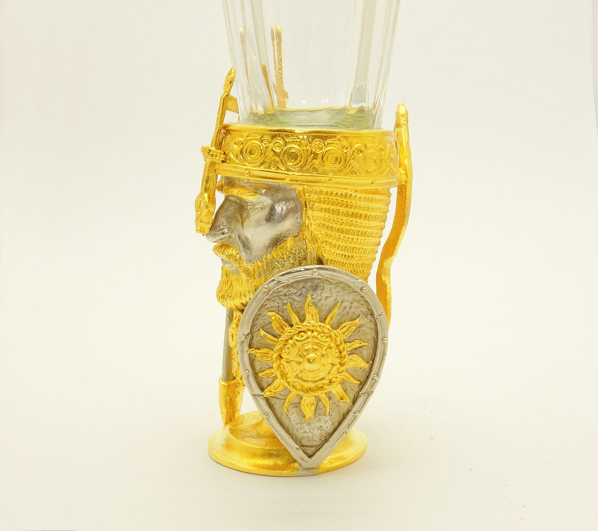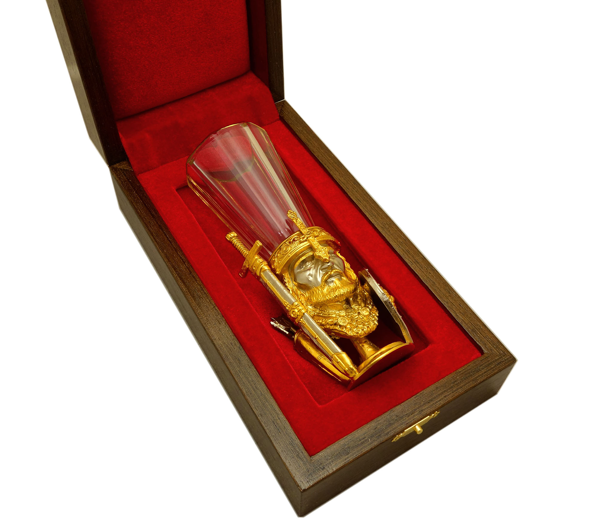 Лафитник "Богатырь" сочетает в себе истинное искусство и оригинальность дизайна. Основание в виде головы богатыря из бронзы с позолоченными элементами и стеклянная стопка создают удивительный образ. Это идеальный подарок для тех, кто ценит русскую культуру и историю, а также для коллекционеров или просто ценителей необычных и красивых вещей. |