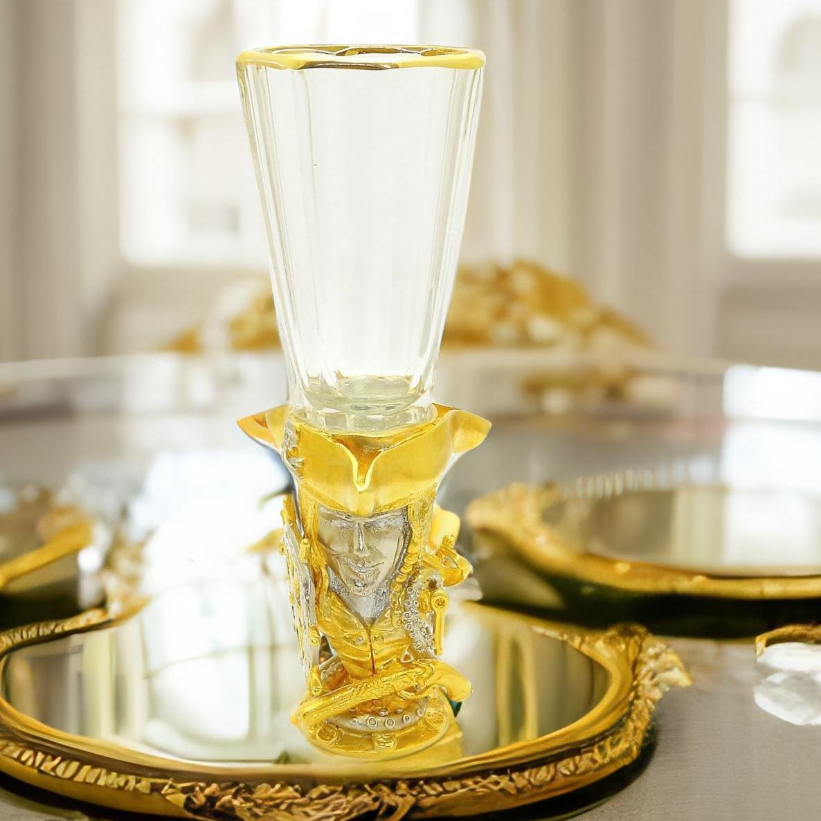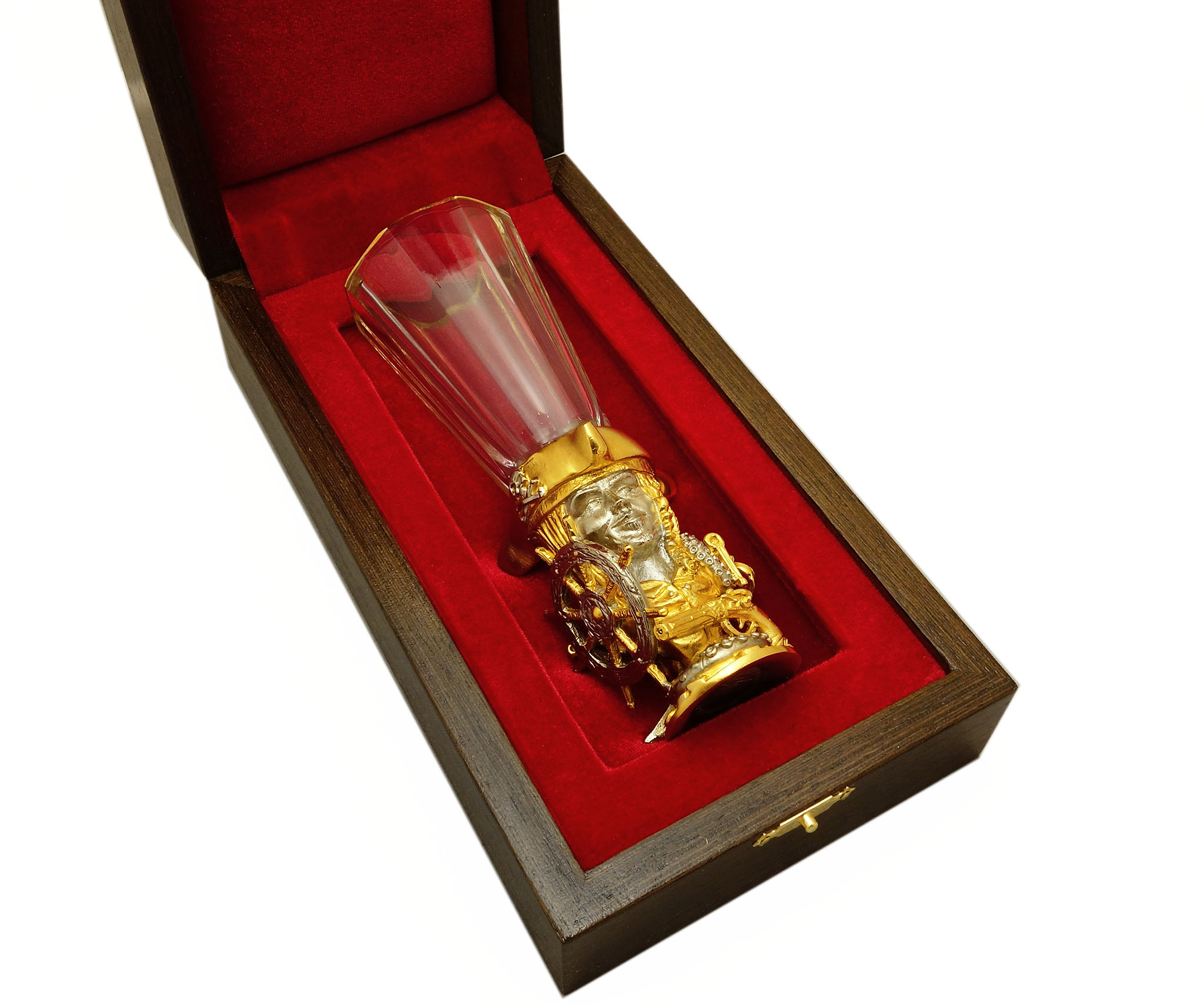 Лафитник "Пират" выполнен в оригинальном дизайне, вдохновленном морскими приключениями и пиратской романтикой. Сочетание позолоченных элементов и детализированных декоративных отделок создает неповторимый образ. Это идеальный выбор для тех, кто ценит необычные и красивые вещи или хочет добавить в свою коллекцию что-то действительно особенное и запоминающееся. |