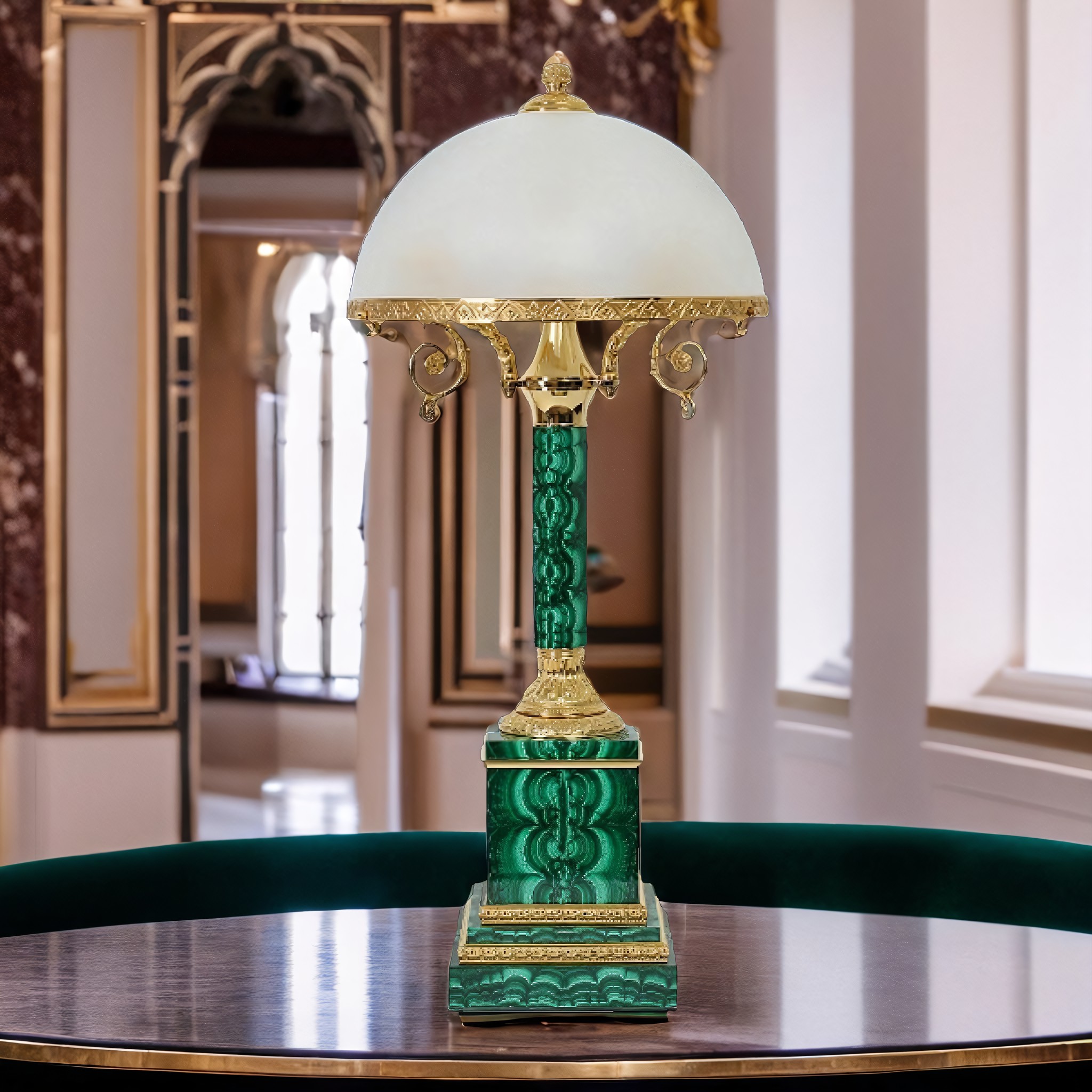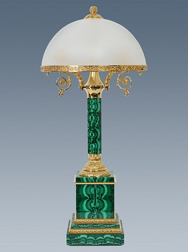 Впечатляющим дополнением для вашего интерьера станет настольная лампа Премьер-М. Изготовленная вручную из натурального малахита и позолоченной бронзы, лампа представляет собой не только функциональный предмет, но и ценное искусство. С основанием и элементами из позолоченной бронзы, она внесет в ваше пространство утонченность и благородство вместе с прекрасным освещением.