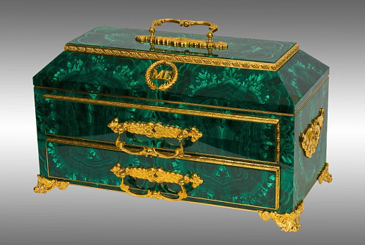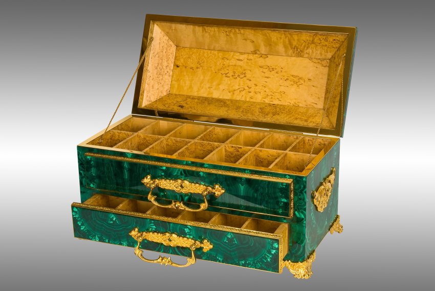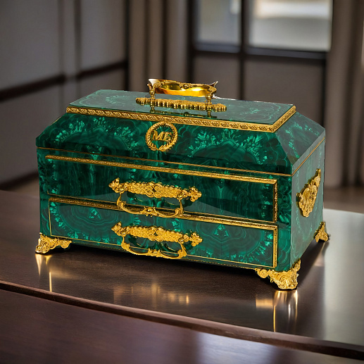 Превратите свой дом в место непревзойденного великолепия с нашим эксклюзивным ларцом под наручные часы, выполненным из изысканного малахита и элегантной позолоченной бронзы.