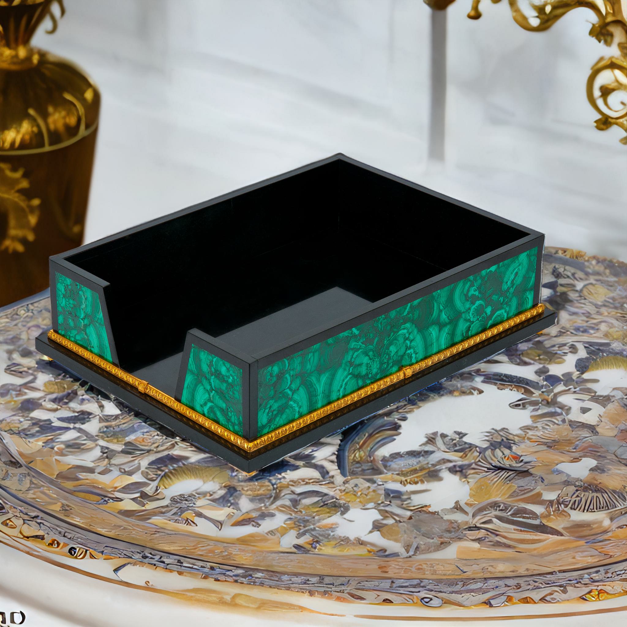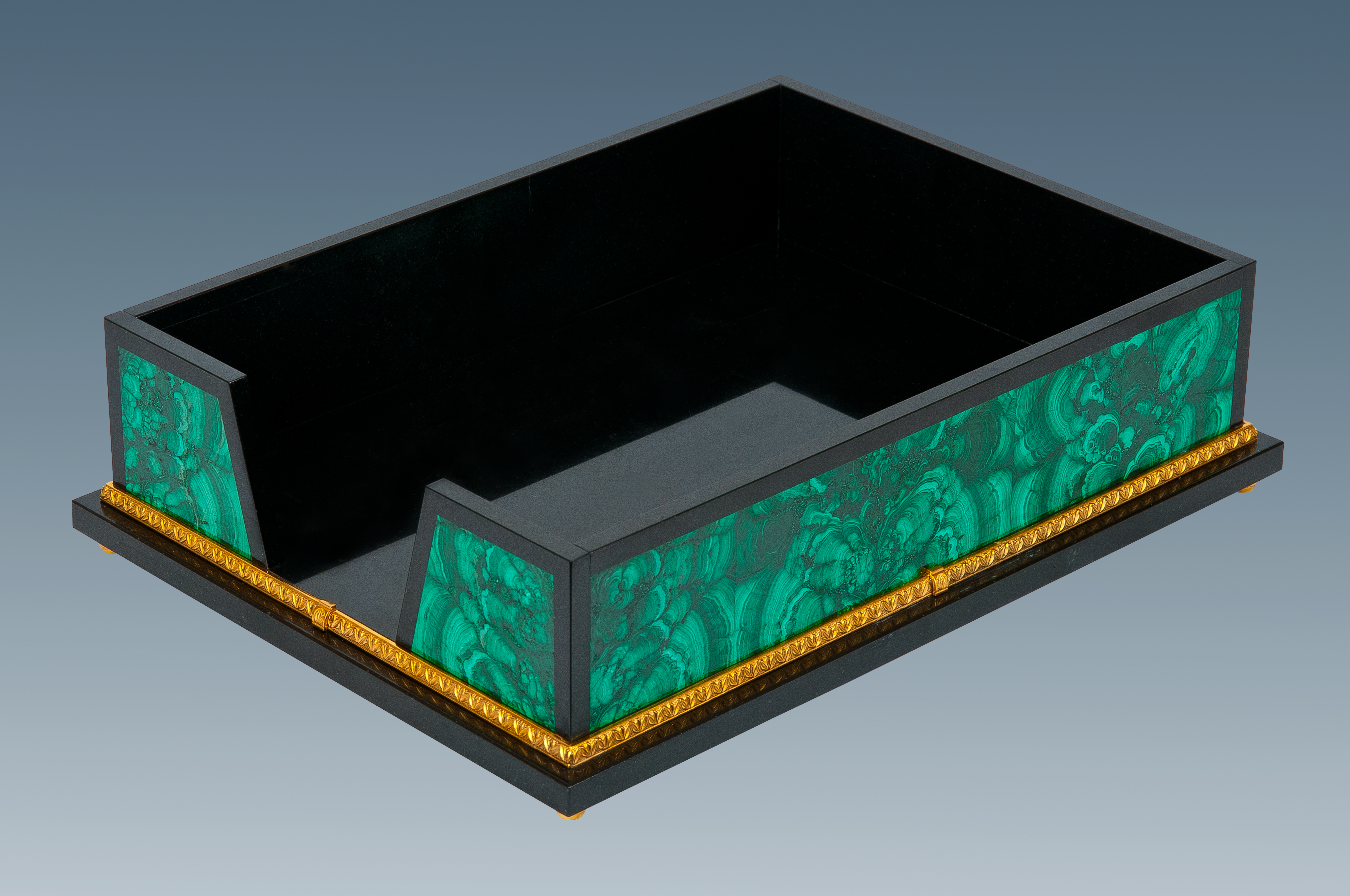 Наполните свой рабочий стол изысканной элегантностью с нашим эксклюзивным лотком под бумаги, выполненым из качественного малахита. Этот продукт является идеальным сочетанием практичности и декора, создавая особую атмосферу на вашем рабочем месте. Лоток под бумаги из малахита открытый, украшенный элементами из позолоченной бронзы, добавит в ваше пространство нотки роскоши. Малахит — это полудрагоценный камень, известный своей великолепной насыщенной зеленой расцветкой и уникальными вихревыми узорами. Это сочетание с благородной позолоченной бронзой делает каждый лоток абсолютно уникальным.