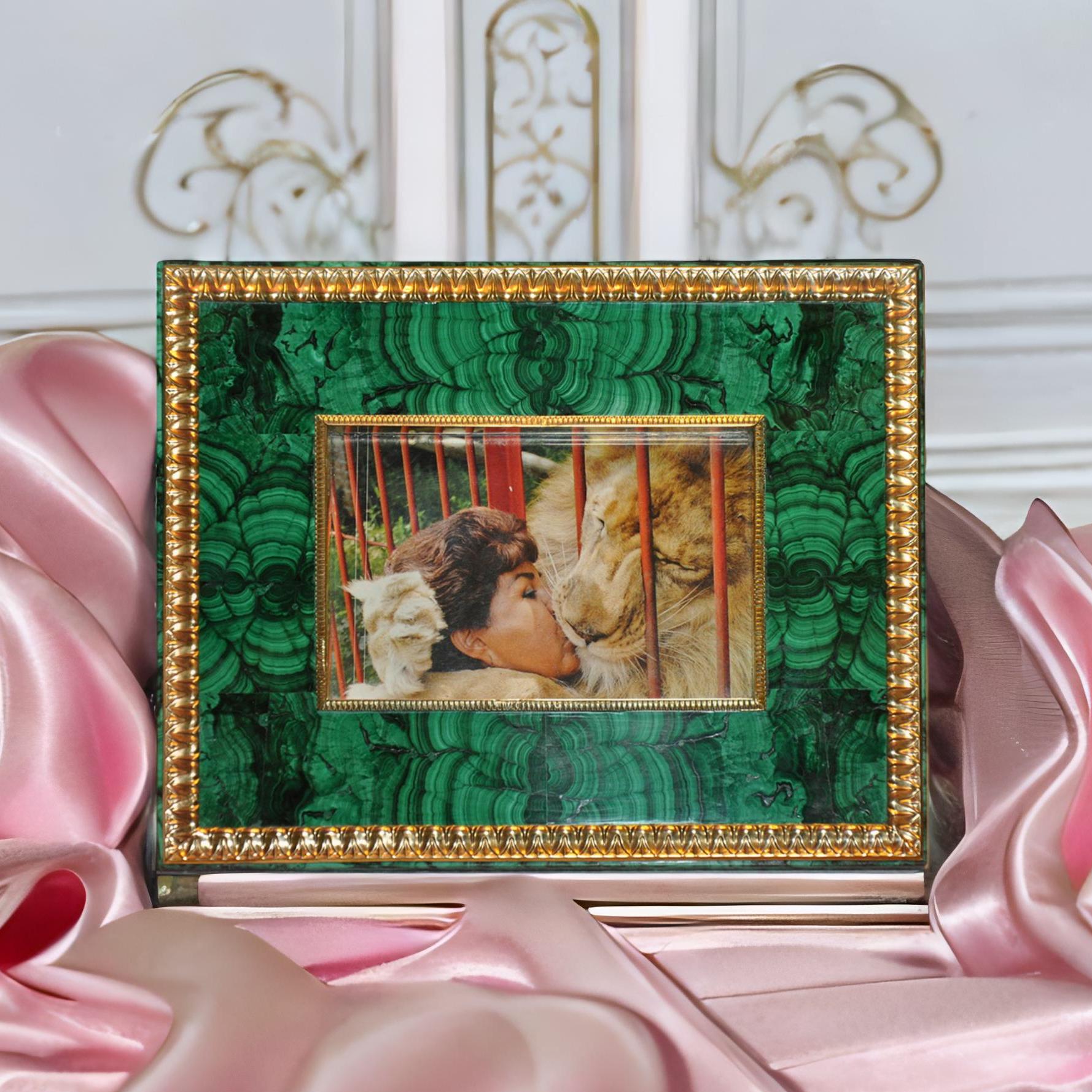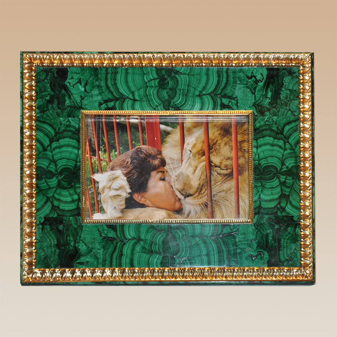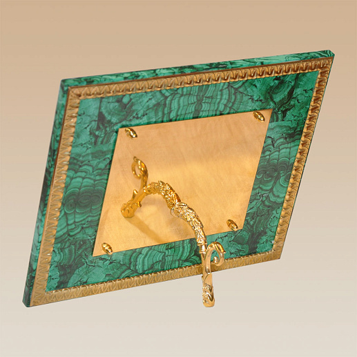 Изысканная фоторамка привлекает внимание с первого взгляда. Багет выполнен из великолепного малахита; по краям украшен бронзовой кромкой. Оборотная сторона выглядит не менее эффектно: фоторамка опирается на элегантную резную ножку из бронзы. Рамка может стать универсальным подарком на любое торжественное событие. ь
