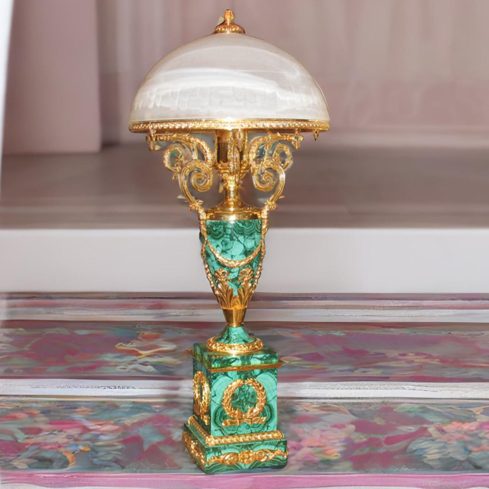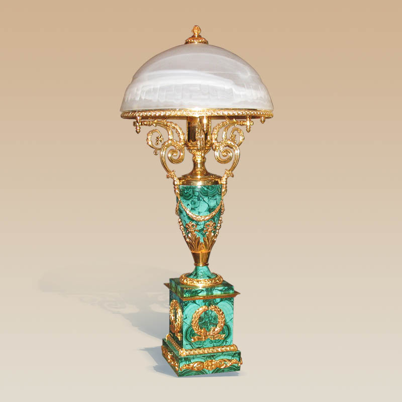 Роскошь, благородство и солидность – эти понятия лучшим образом характеризуют настольную лампу в стиле «ампир». Переливающиеся золотом бронзовые детали и восхитительный рисунок малахита создают эффектное сочетание, способное украсить любой интерьер. Плафон – классический, полукруглый, оформлен в белом цвете. Прибору характерен I класс изоляционной защиты (предотвратит поражение током в случае нарушения изоляции).