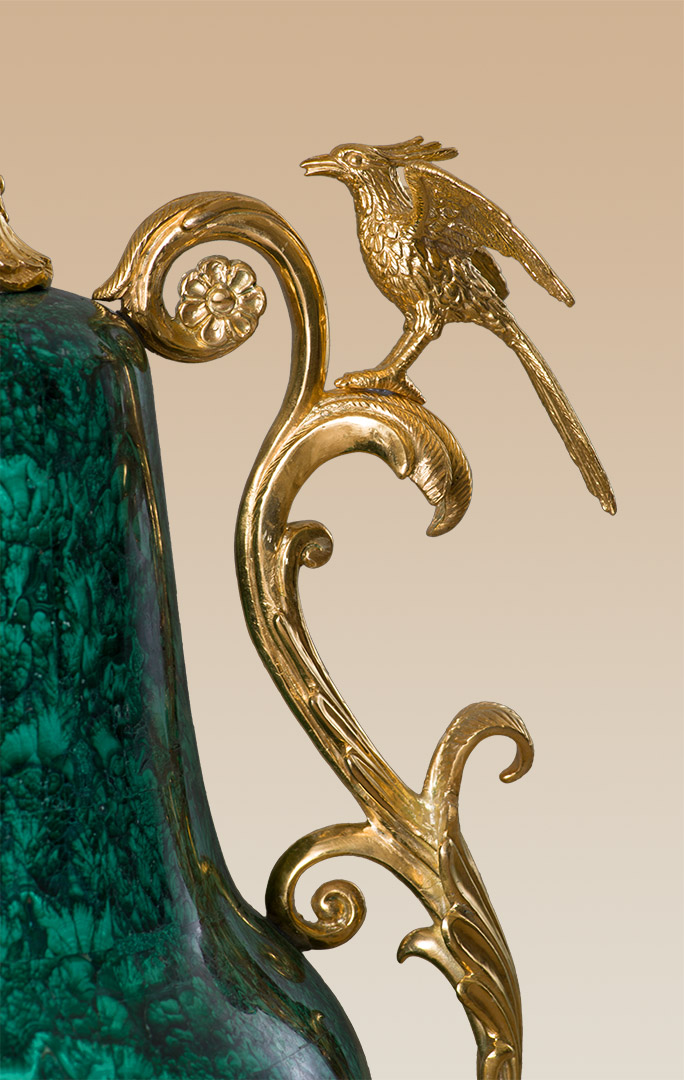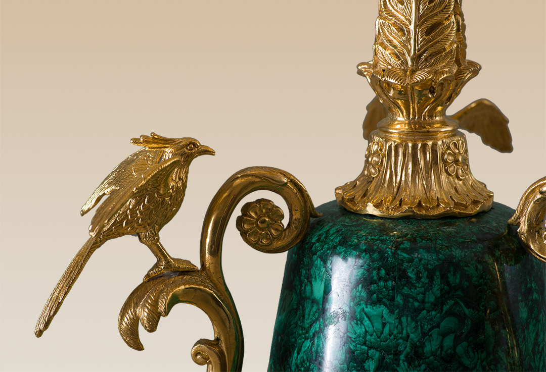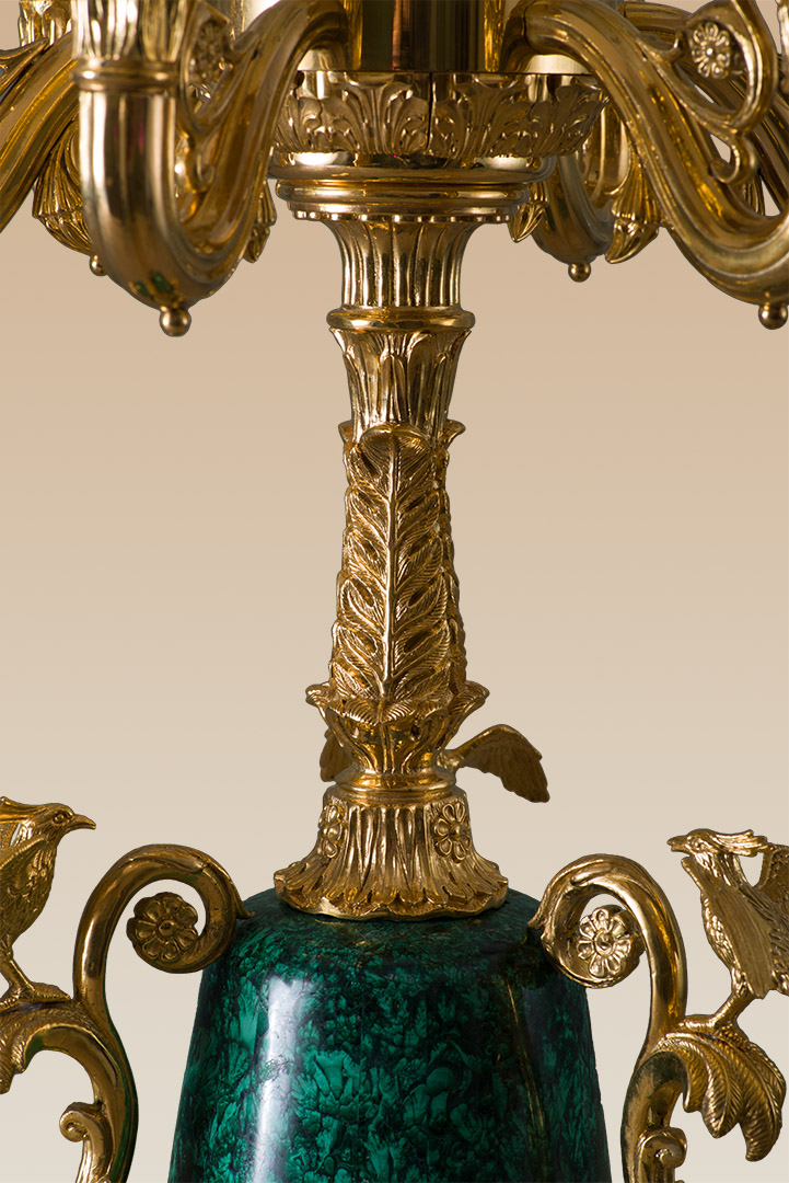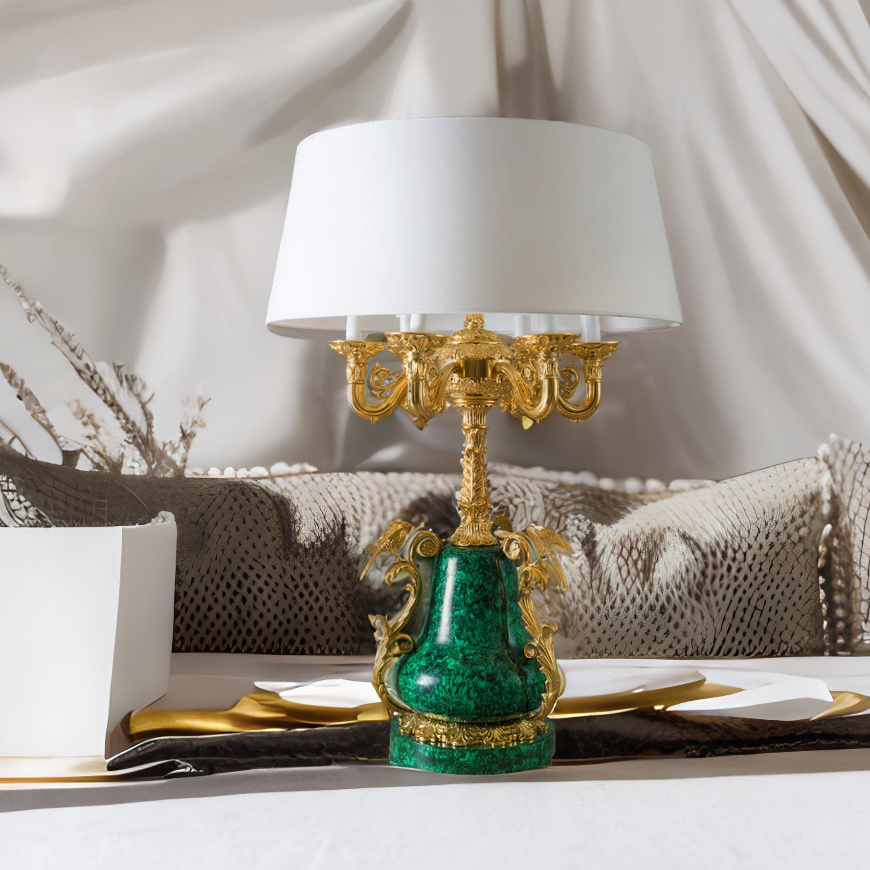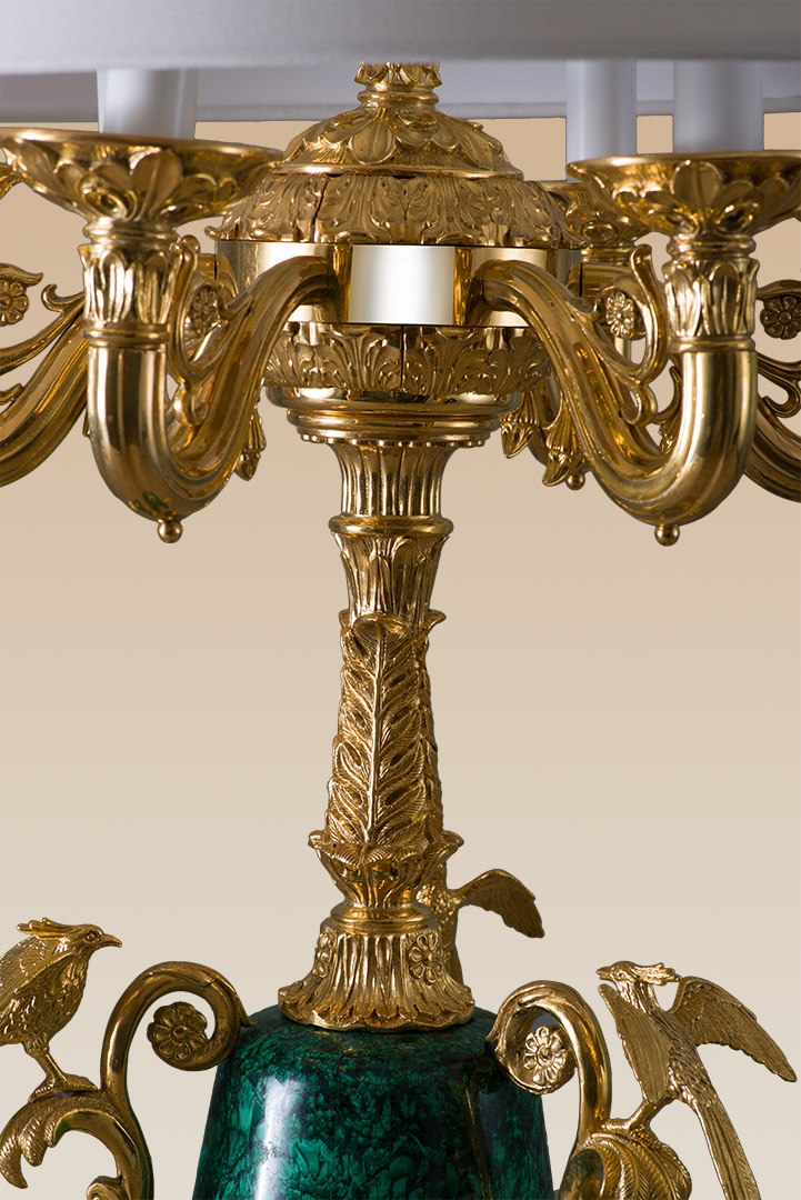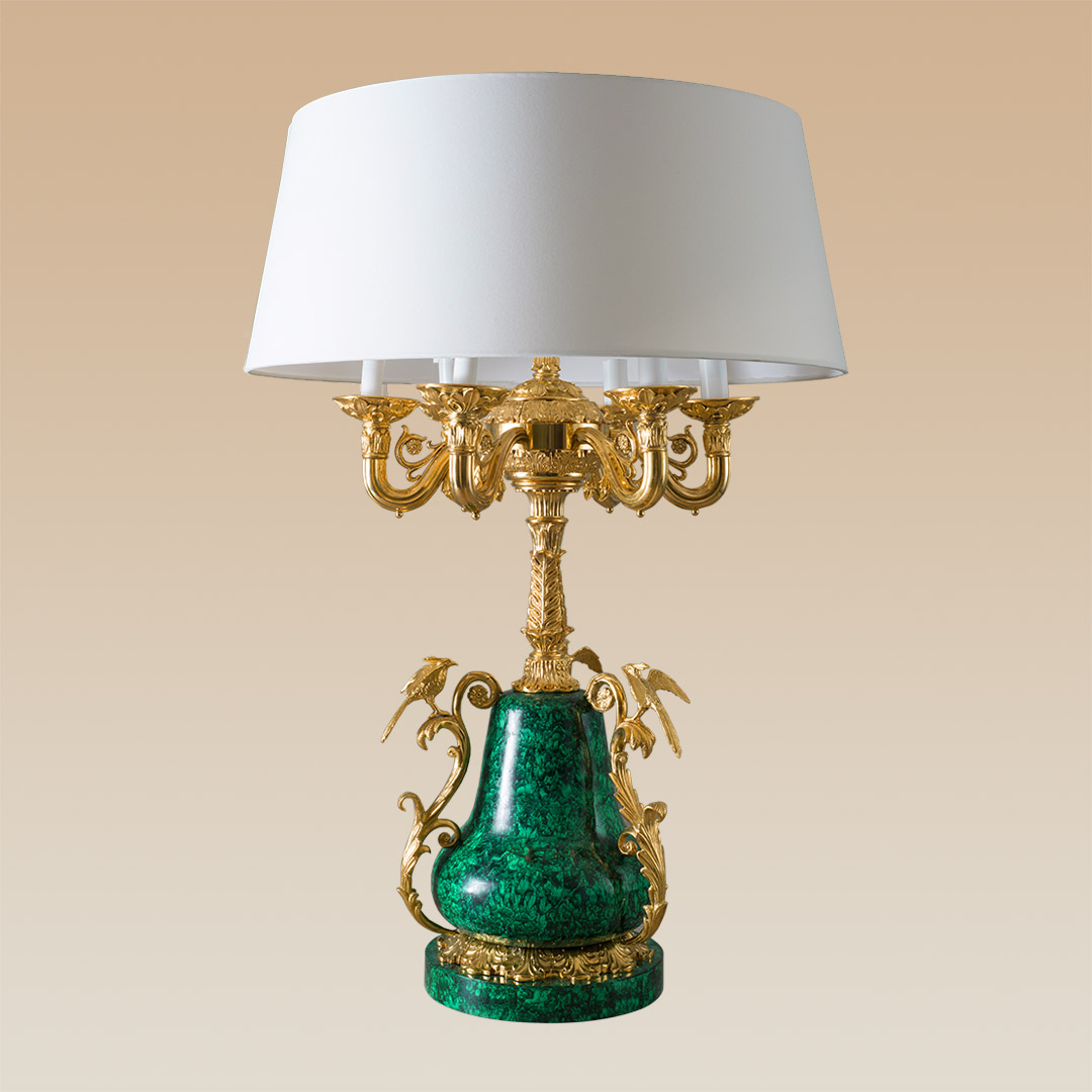 Великолепная настольная лампа станет украшением любого интерьера. Белый абажур роскошно сочетается с подставкой, выполненной из малахита и бронзы. Бронза анодирована в золото, что повышает эстетическую привлекательность изделия. Изюминкой лампы являются миниатюрные фигурки птичек.