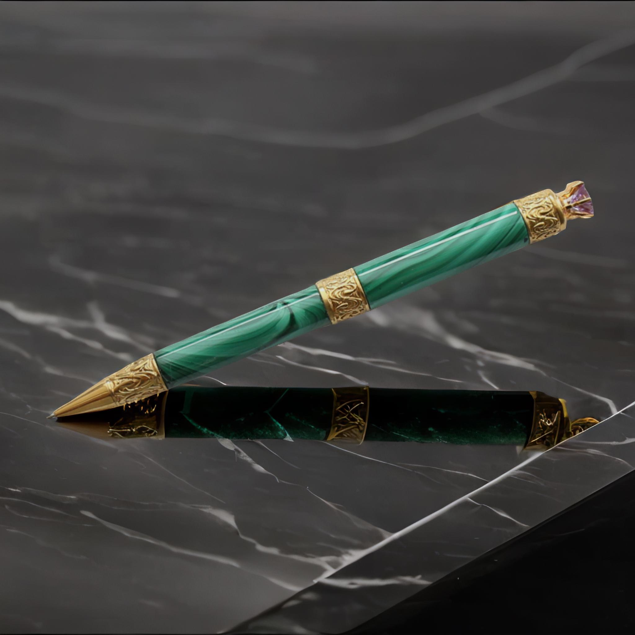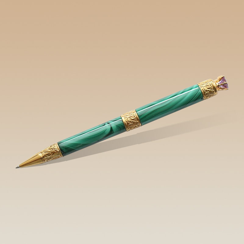 Изумительной красоты ручка из малахита не оставит равнодушными даже самых искушенных натур. Природный минерал отшлифован художниками-ювелирами с максимальной тщательностью, чтобы на поверхности не осталось ни одного изъяна. Элементы из чистой бронзы добавляют образцу солидности и презентабельности.