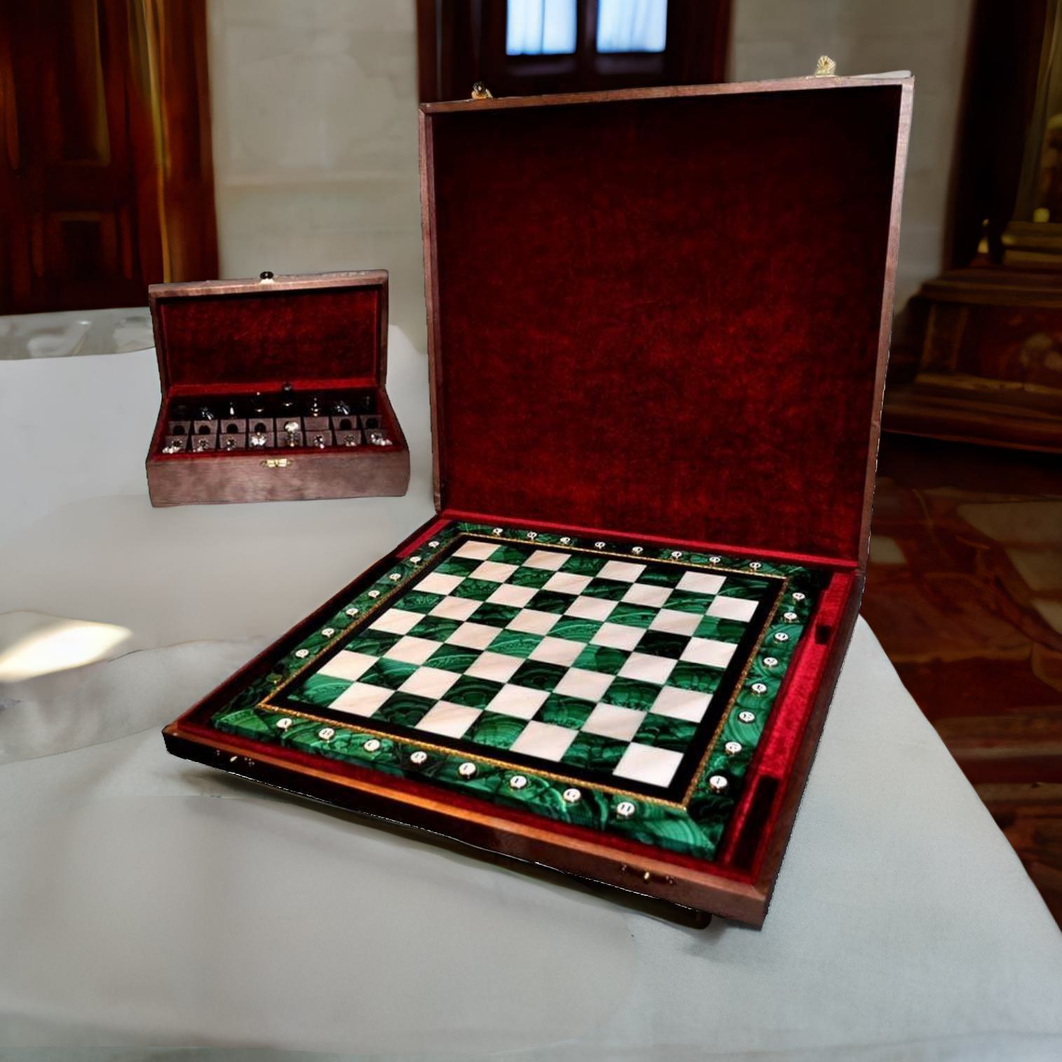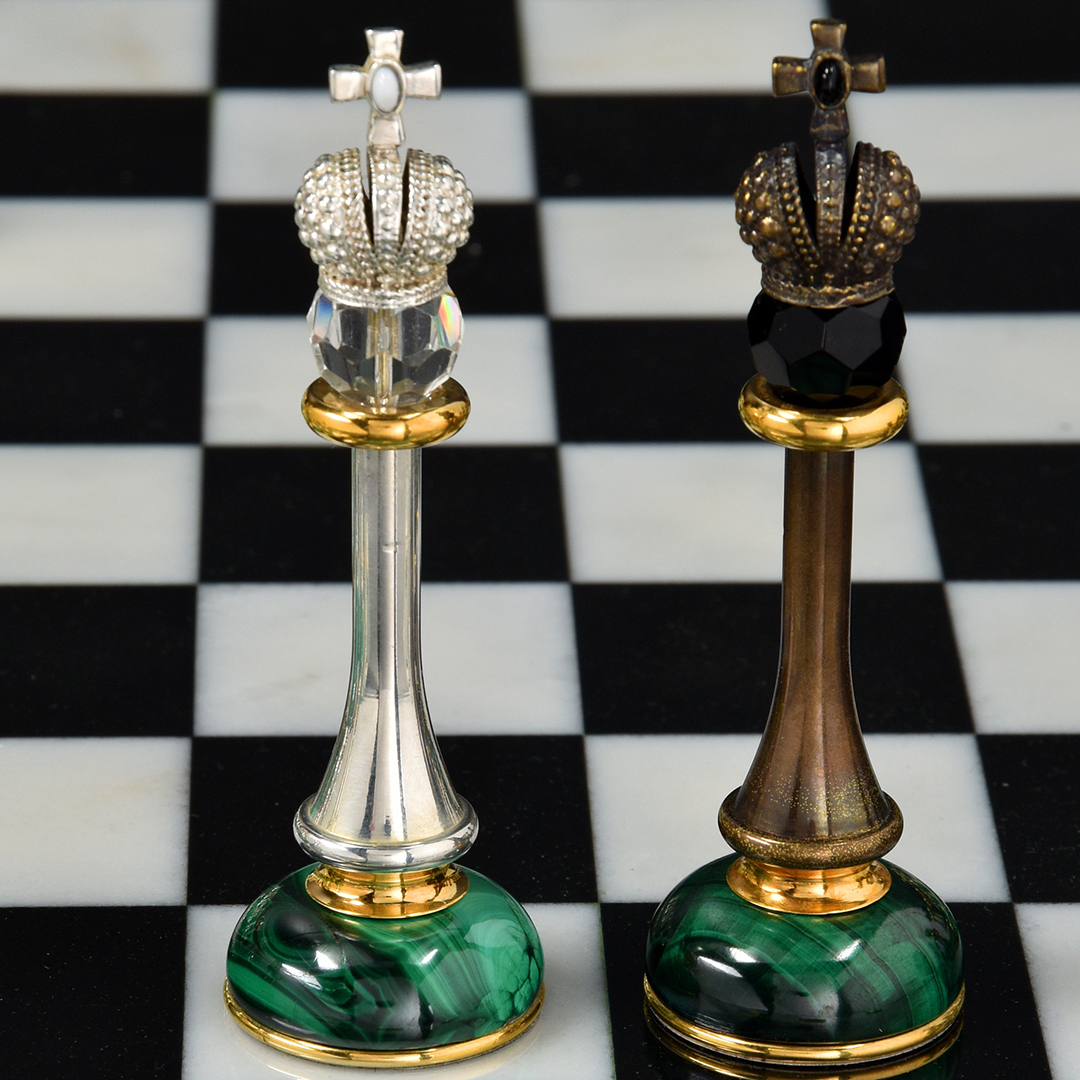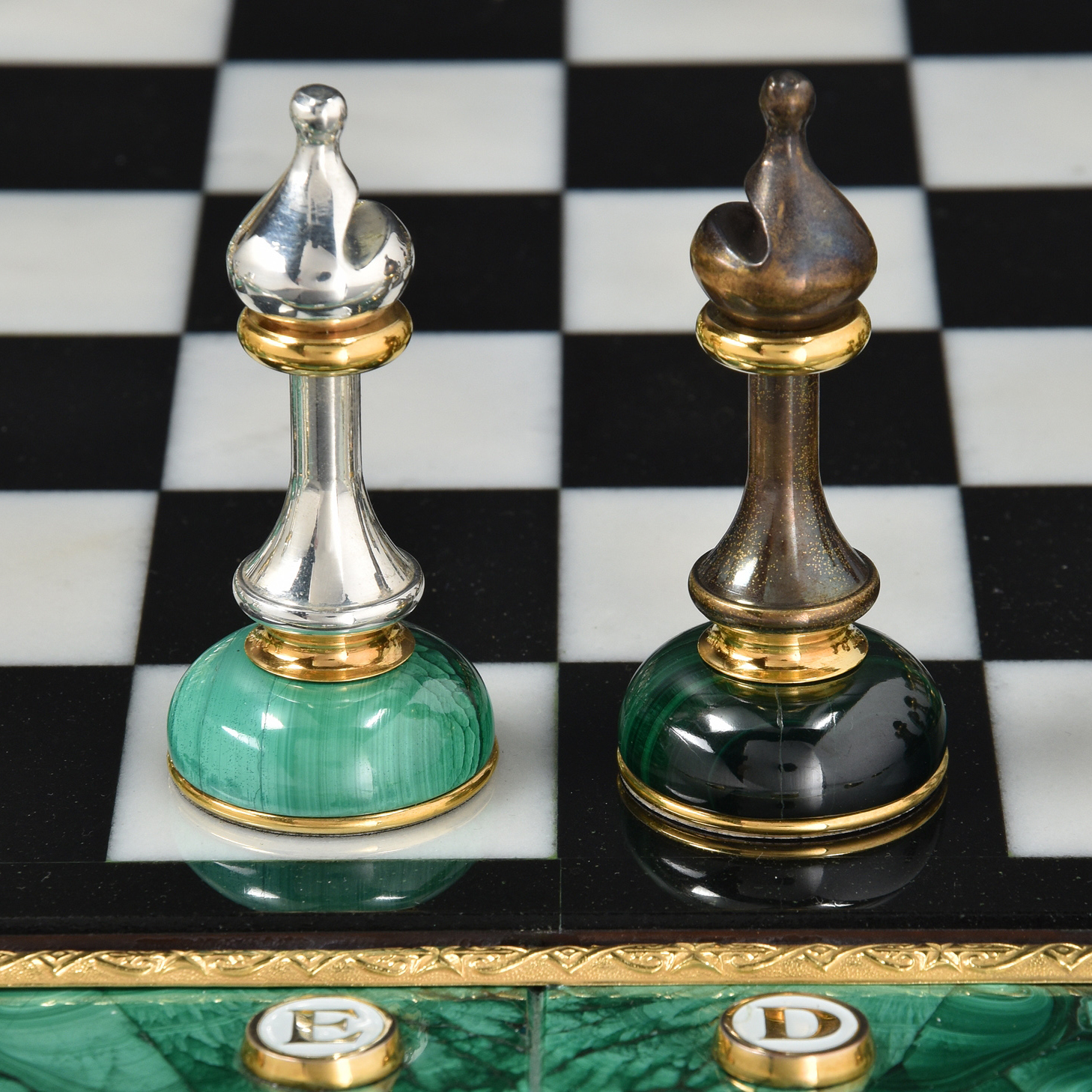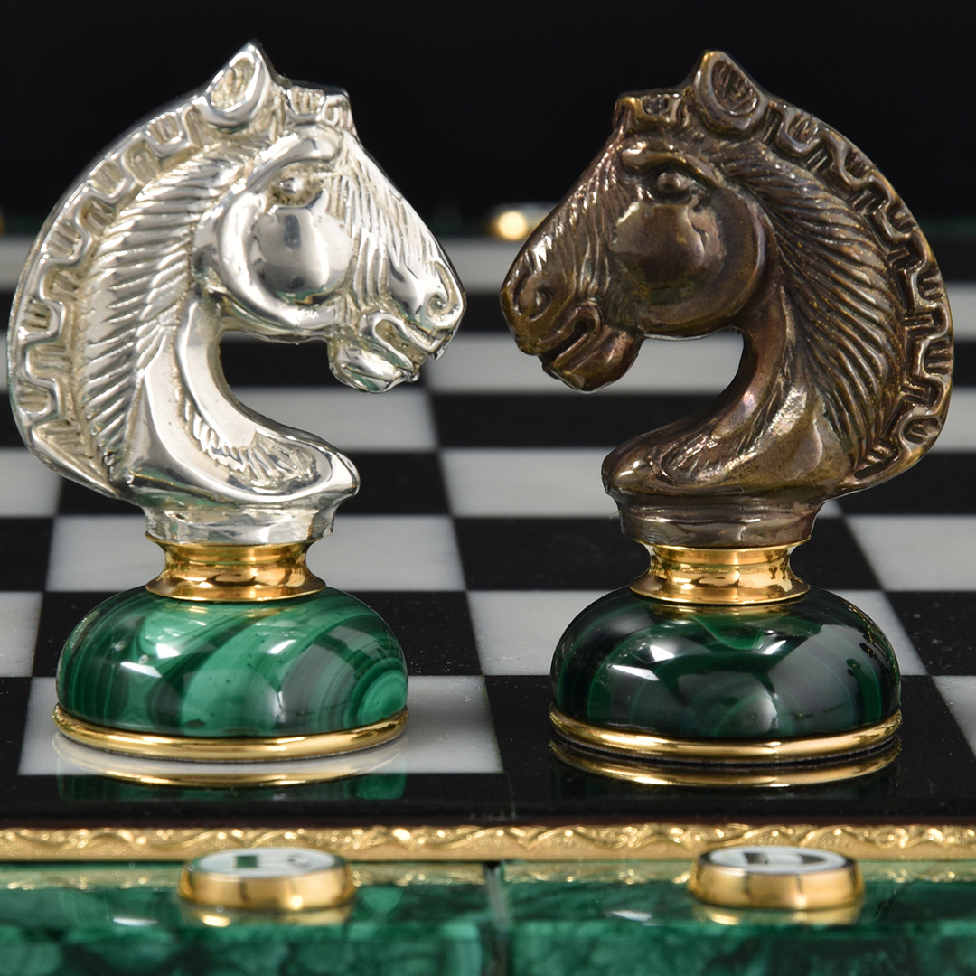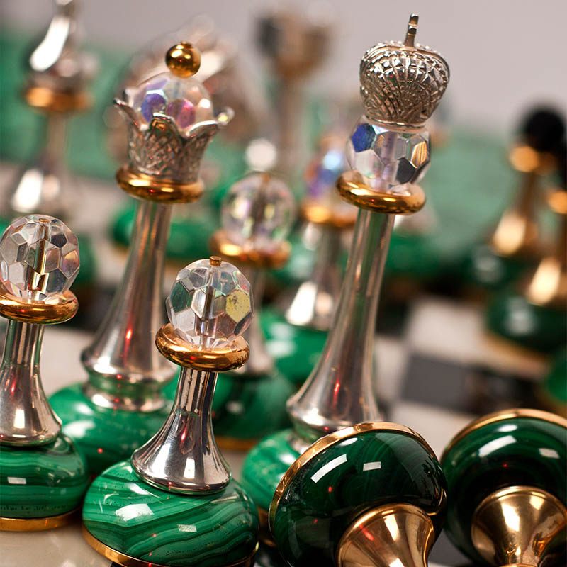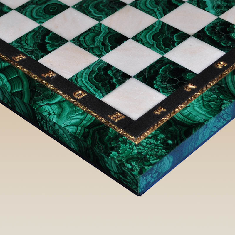 Великолепная шахматная доска с фигурами – настоящий шедевр ювелирного искусства. Три натуральных природных материала – мрамор, бронза и малахит – создают уникальный ансамбль, радуя тщательно проработанным дизайном и безупречным исполнением элементов.