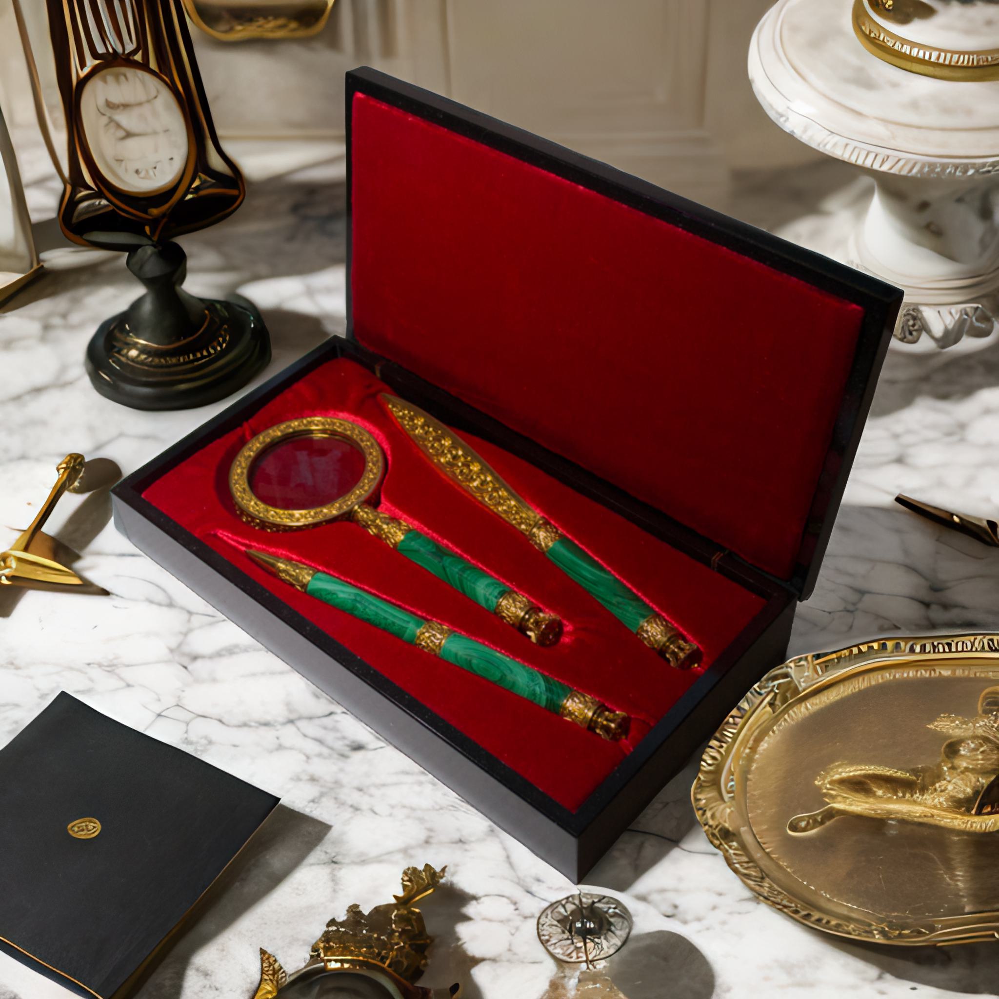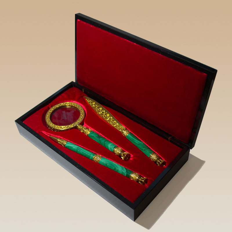 Подарочный набор: ручка, лупа, нож для резки бумаги в футляре.