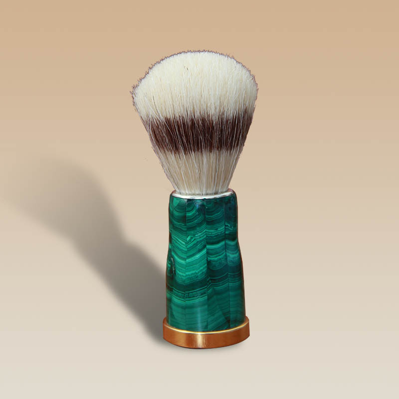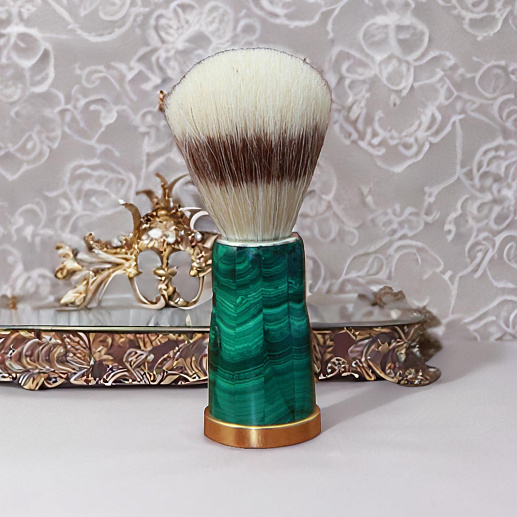 Стильный бритвенный помазок станет настоящим предметом восхищения для каждого представителя сильного пола. Помазок полностью функционален, выполнен из изысканного сочетания чистой бронзы и природного малахита.