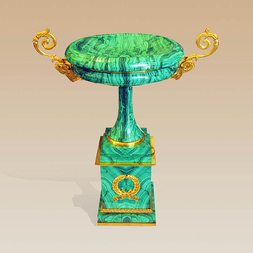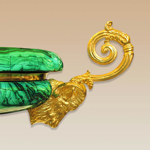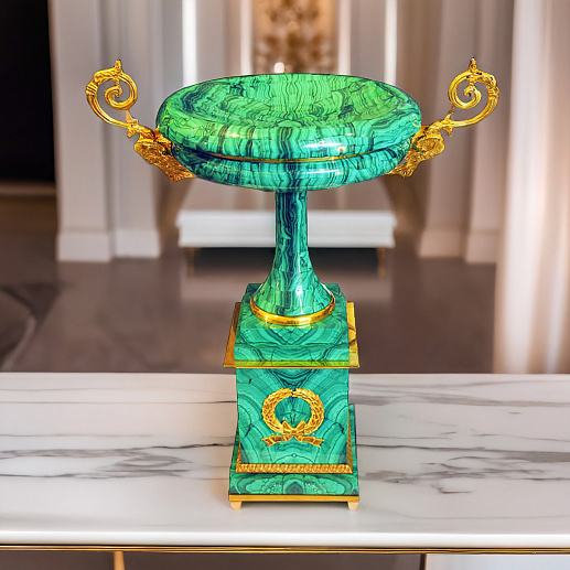 Придать жилому или офисному пространству особенной роскоши поможет стильная малая чаша из благородного малахита. Натуральный, природный материал обработан таким образом, что представляет собой настоящее произведение искусства. Детали из бронзы по дизайну и исполнению могут смело конкурировать с дорогостоящими драгоценными металлами.