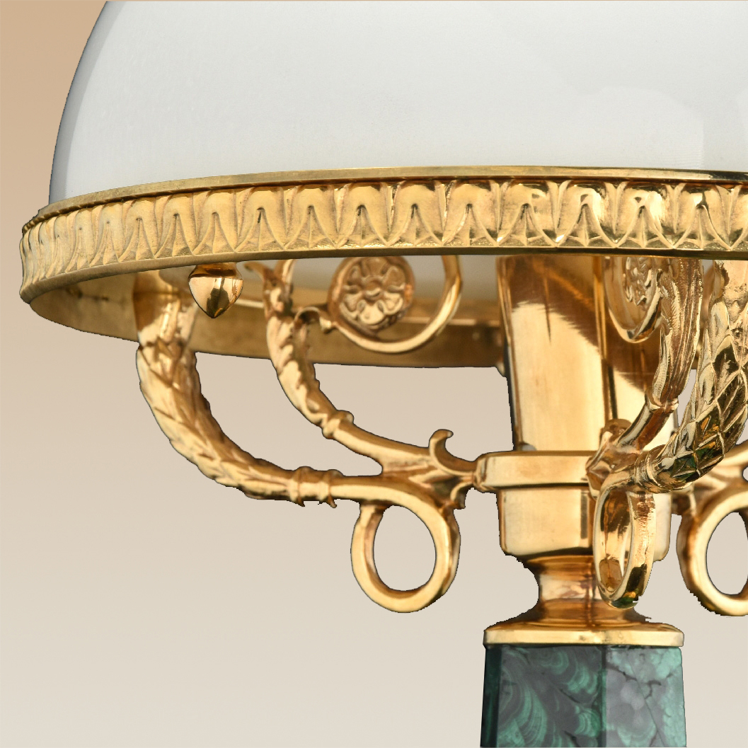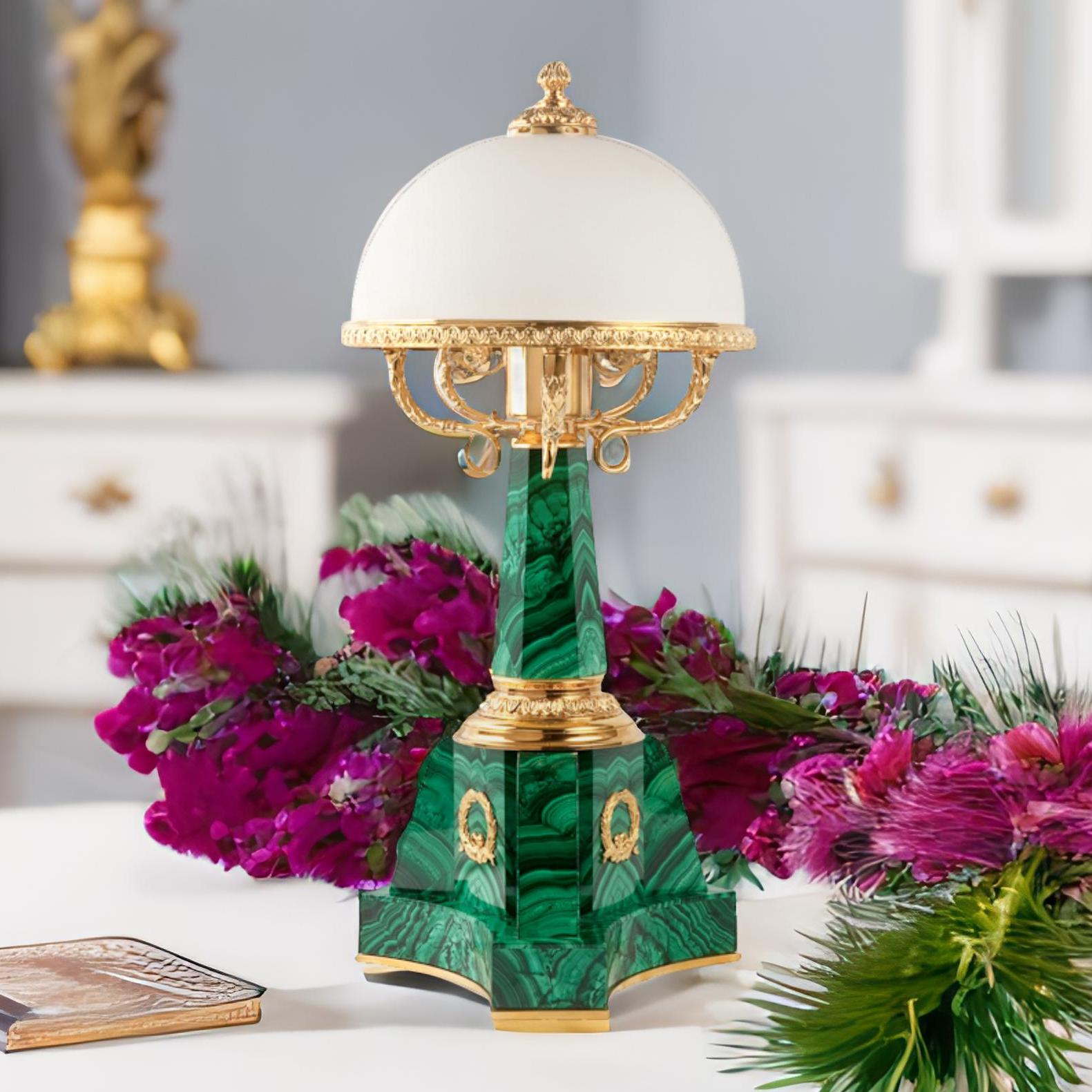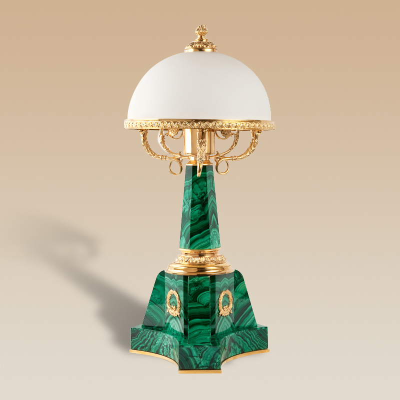 Небольшая, но очень эффектная настольная лампа, способна занять достойное место в интерьере уютного дома или солидного офиса. Основание выполнено из сочетания благородного малахита и дорогой бронзы, которая по блеску ничуть не уступает настоящему золоту. Дополнительное впечатление производят безупречность линий и строгое соблюдение пропорций. Благодаря I классу изоляционной защиты, прибор не ударит током при прикосновении даже в случае нарушения изоляции.