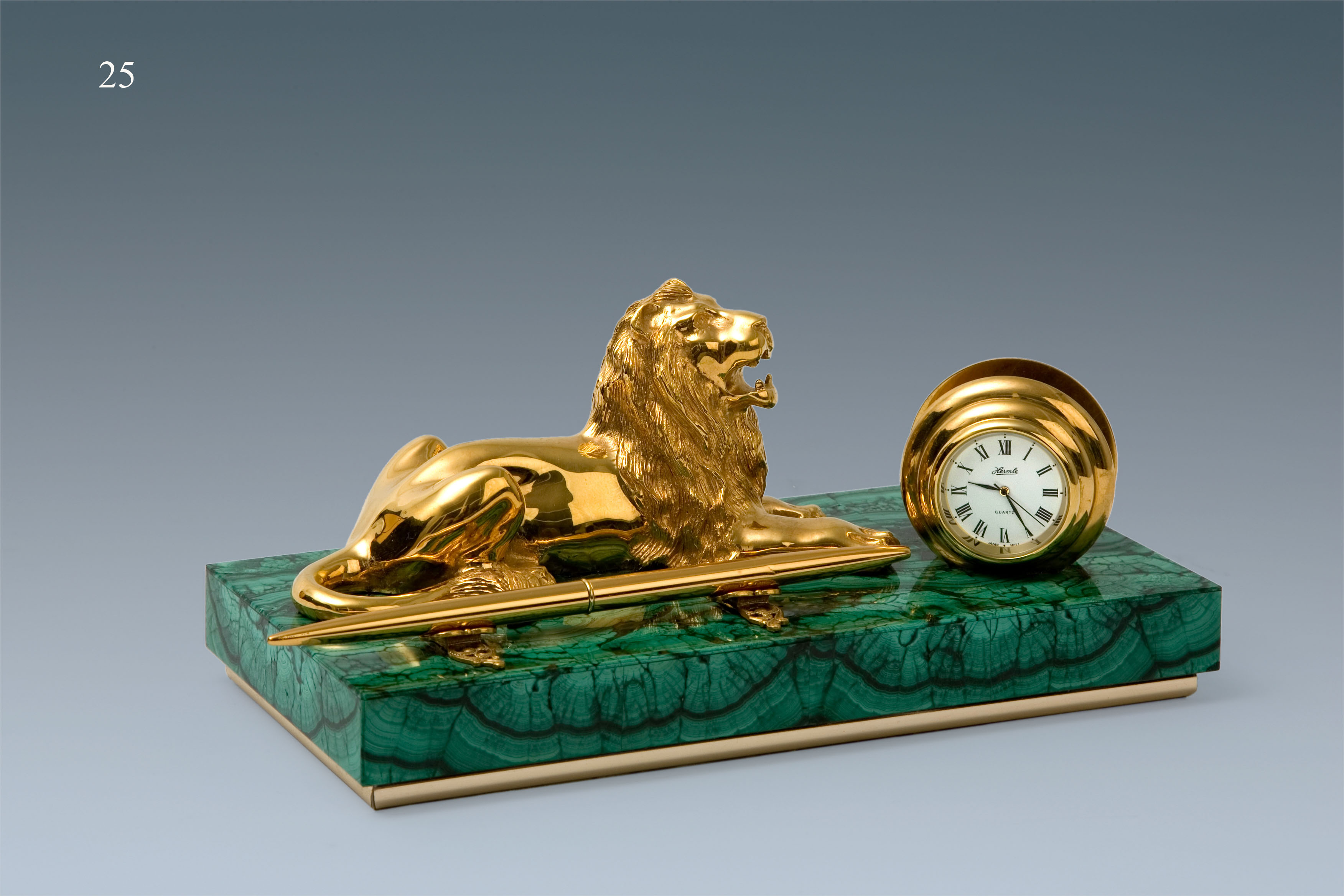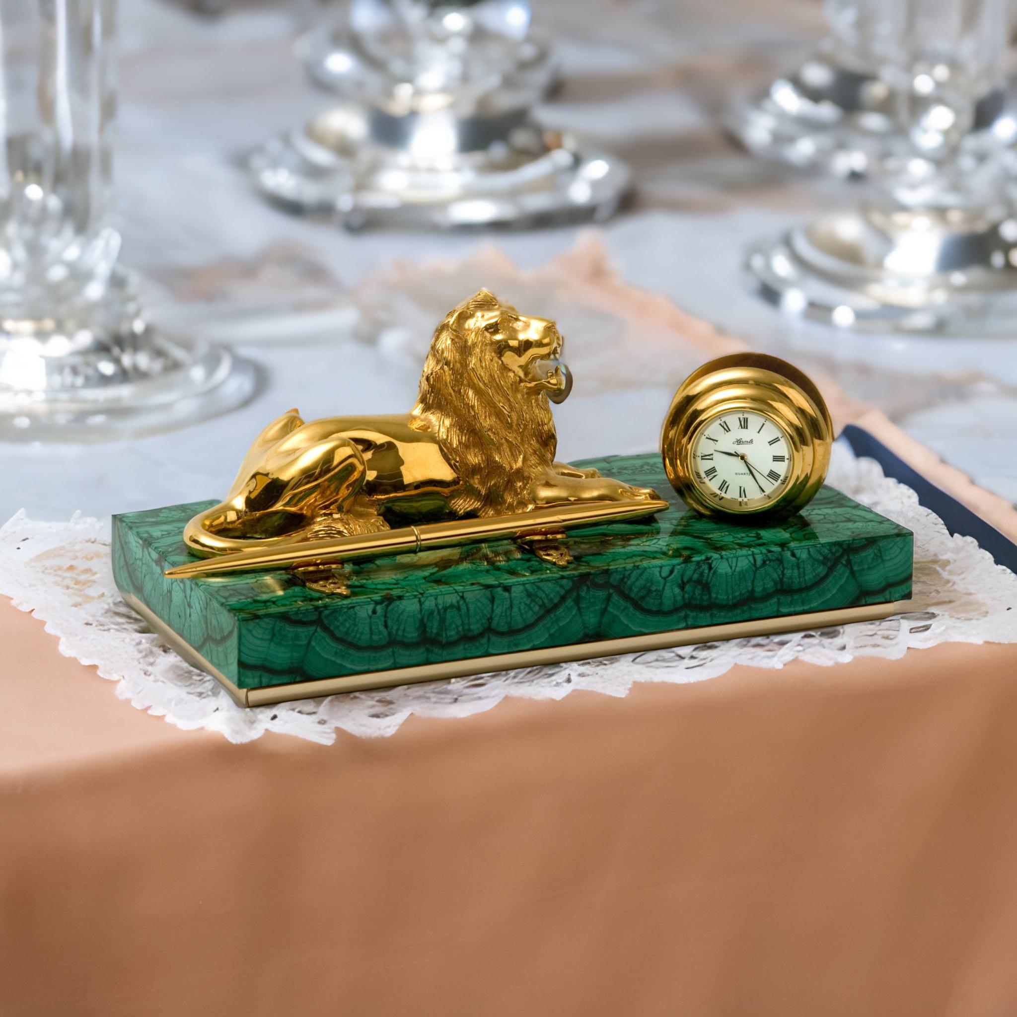 Предлагаем Вашему вниманию эксклюзивный письменный прибор «Лев» – уникальное декоративное украшение рабочего стола. Изделие выполнено из натурального малахита, а часы и фигура льва — из позолоченной бронзы.