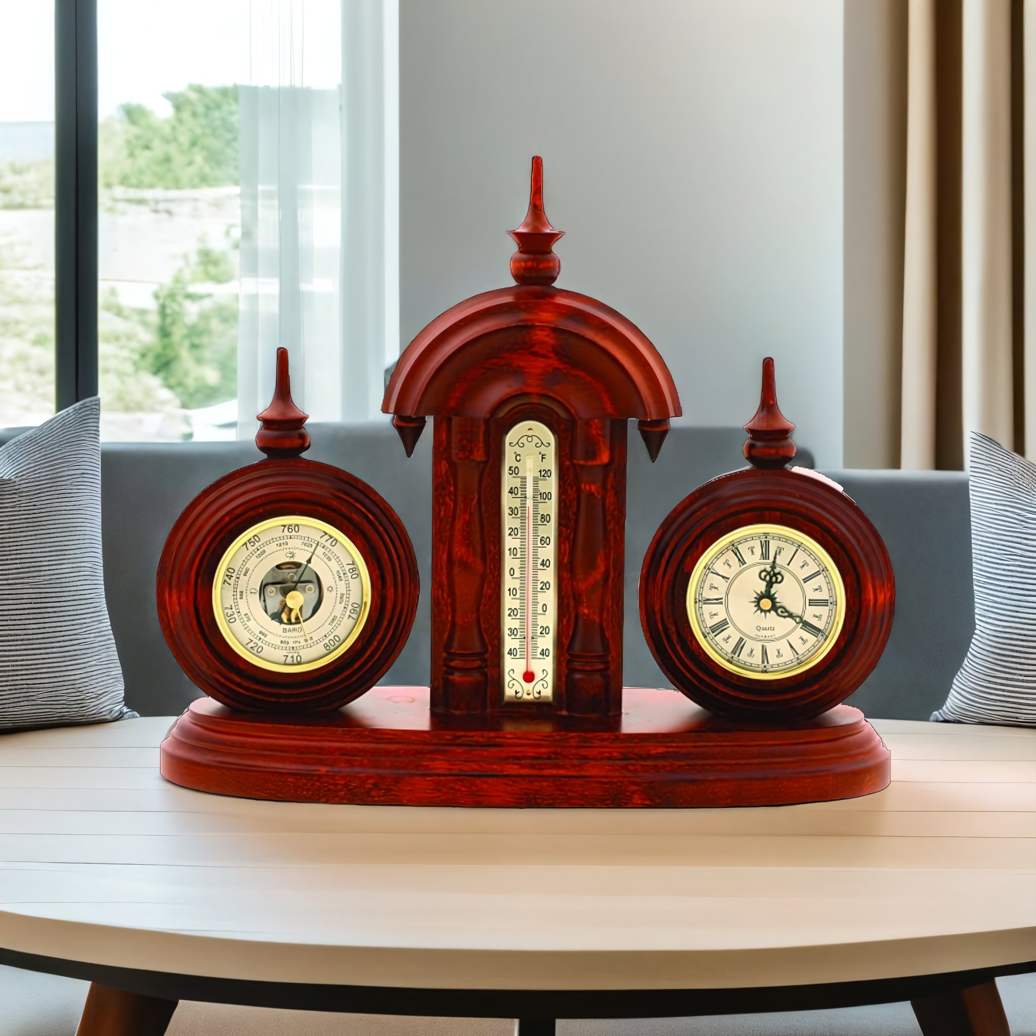 Сделанную из высококачественного массива дерева, наша метеостанция настольная не только предоставит вам точные сведения о погодных условиях, но и станет изысканным дополнением к вашему интерьеру. Погода за окном не важна, когда у вас под рукой есть все нужные данные: температура воздуха, атмосферное давление и точное время. Встроенный в метеостанцию термометр позволяет в режиме реального времени отслеживать показатели температуры в вашем доме или офисе. Также устройство оснащено барометром, благодаря которому вы всегда будете в курсе изменений атмосферного давления.