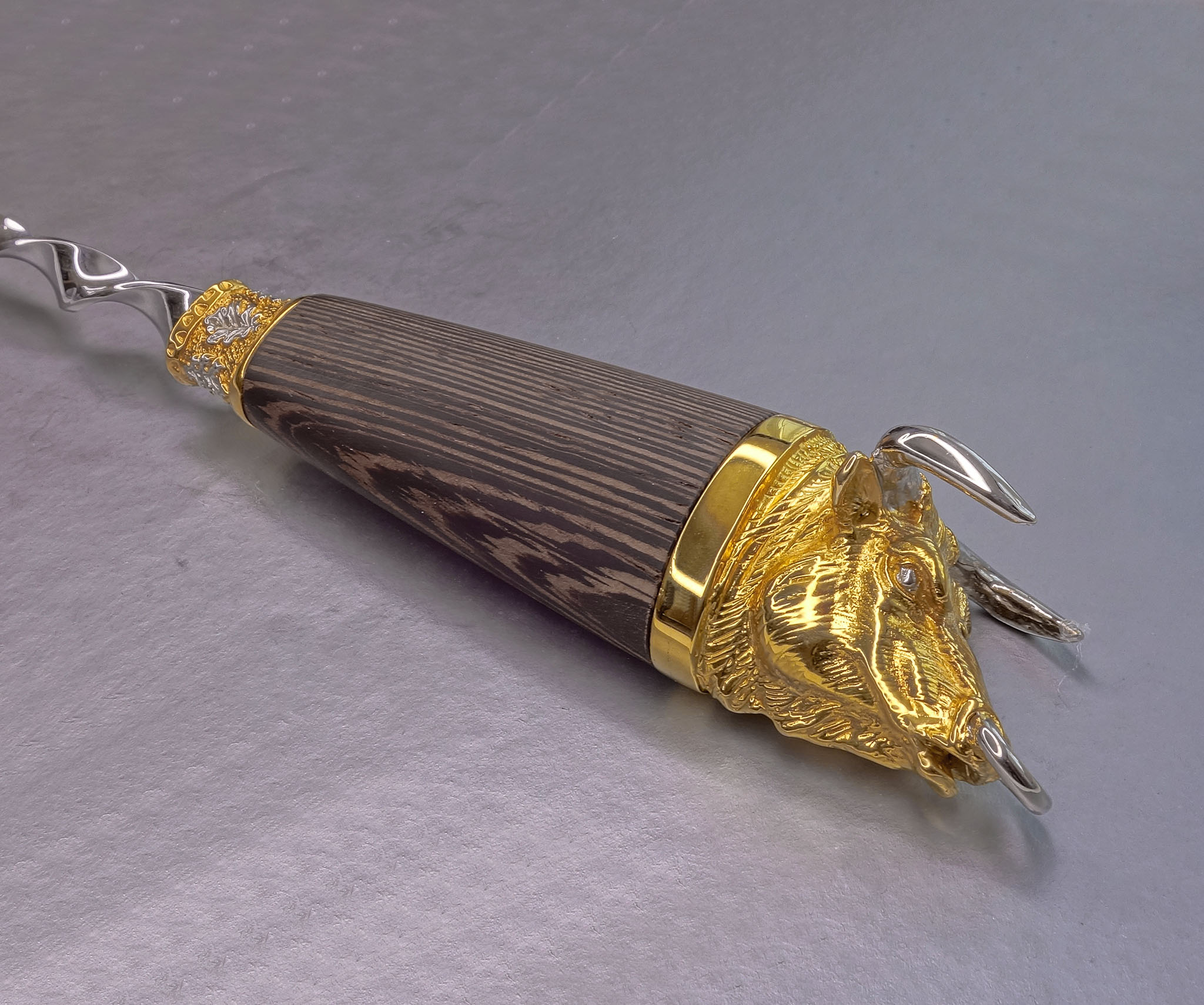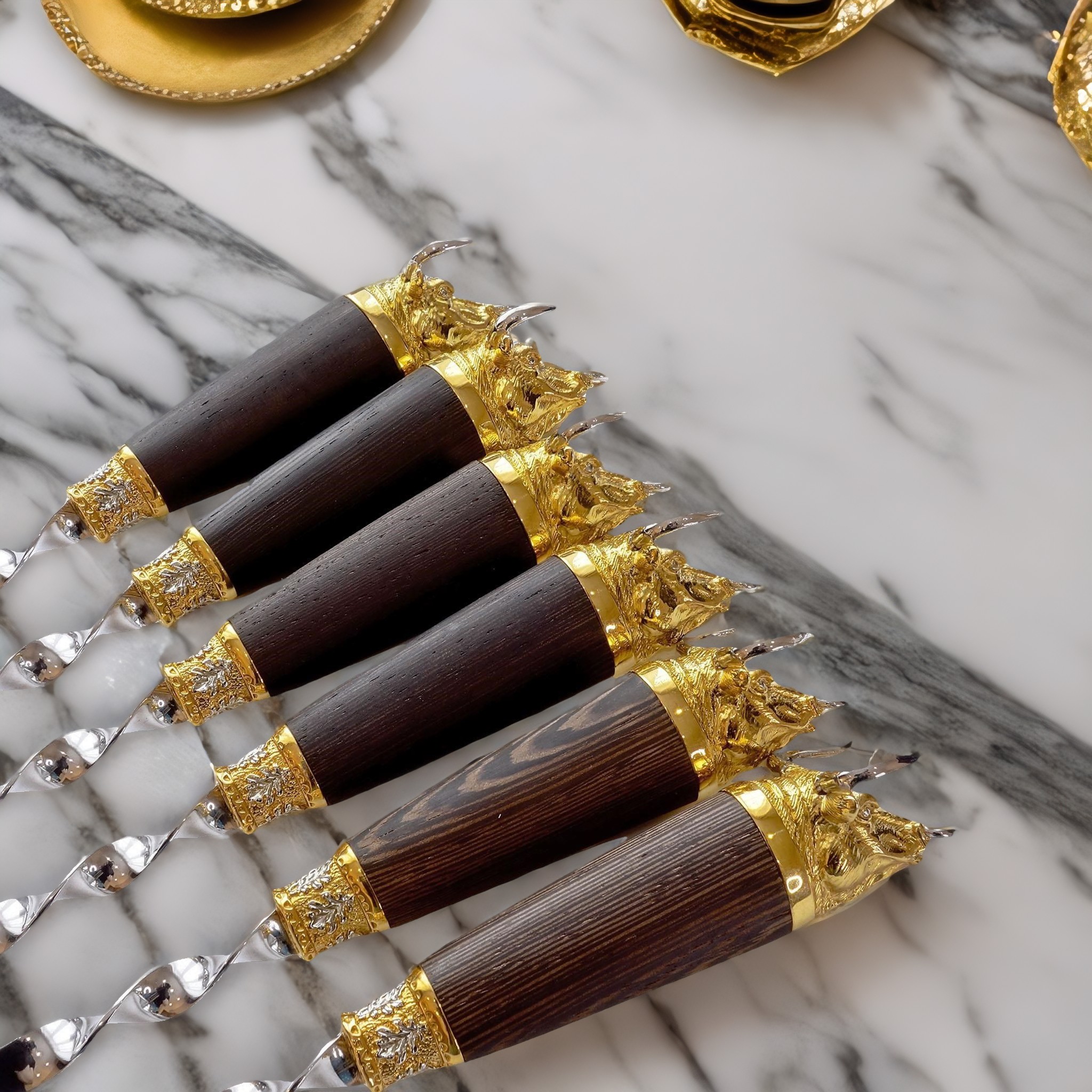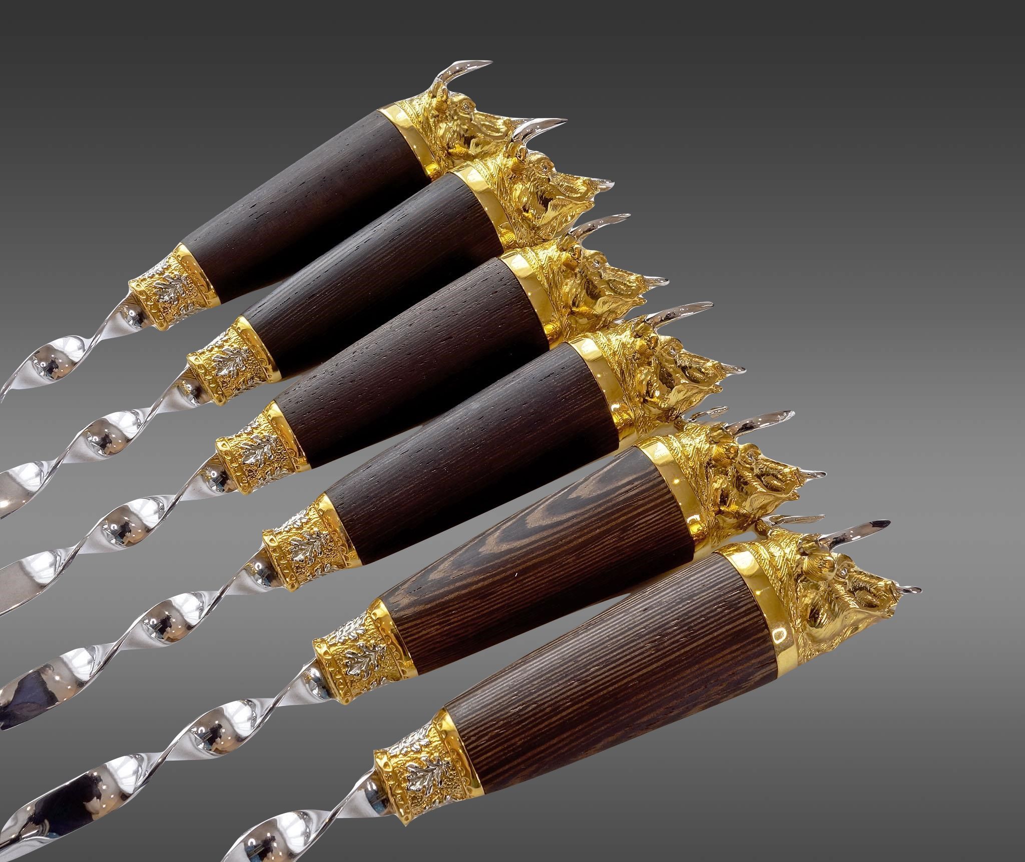 Шампуров в наши дни сплошь и рядом, но наш набор Быки — это что-то действительно особенное. Рукоятки шампуров выполнены в виде голов быка из бронзы и покрыты позолотой! Не просто инструмент для жарки мяса, но и изумительный элемент декора, говорящий о вкусе его владельца. Каждая деталь выполнена с высочайшей точностью, что делает данный набор уникальным в своем роде. Внимание к деталям, превосходное качество материалов, искусство в каждой линии — вот что выделяет наш набор шампуров Быки на фоне прочих.