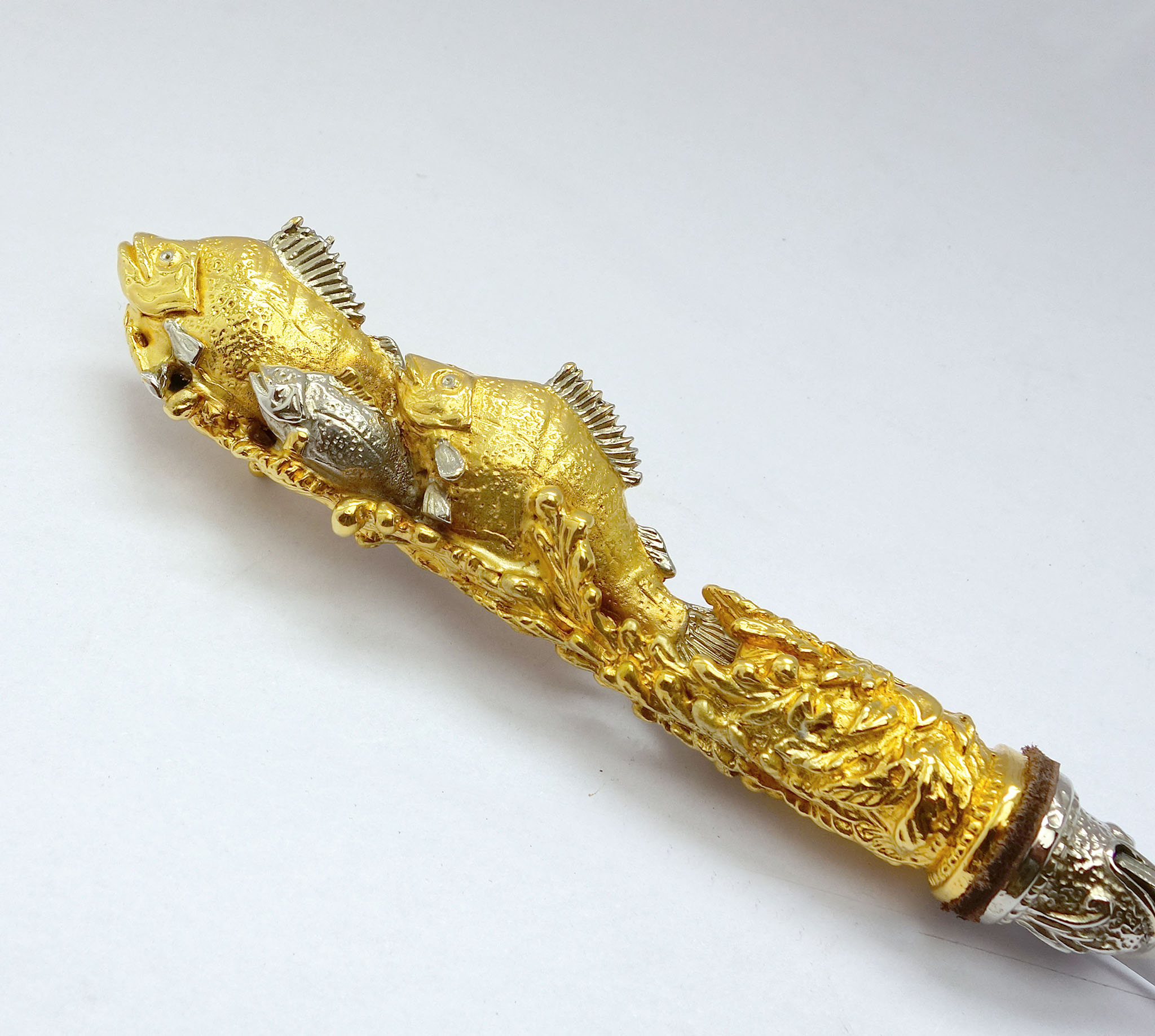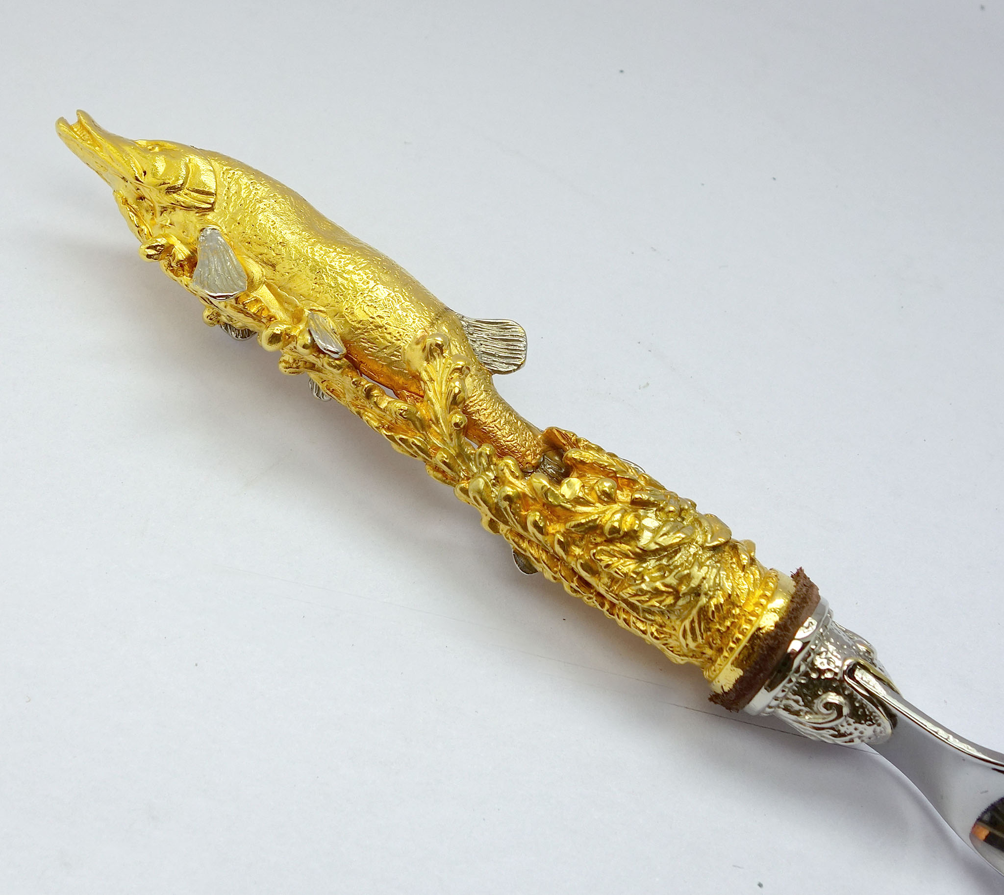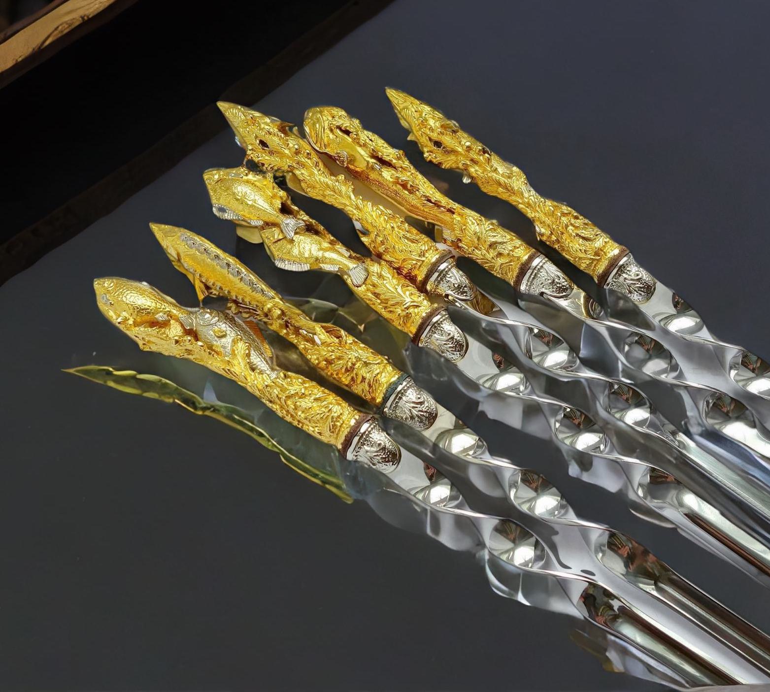 Представляем вашему вниманию набор шампуров Рыбы. Это не просто инструмент для приготовления шашлыка – это совершенно новый уровень вашего комфорта и стиля! В набор входят шампуры с уникально декорированной ручкой из бронзы, выполненной в виде рыбы. Специальное покрытие из золота придает им изысканный и благородный вид.