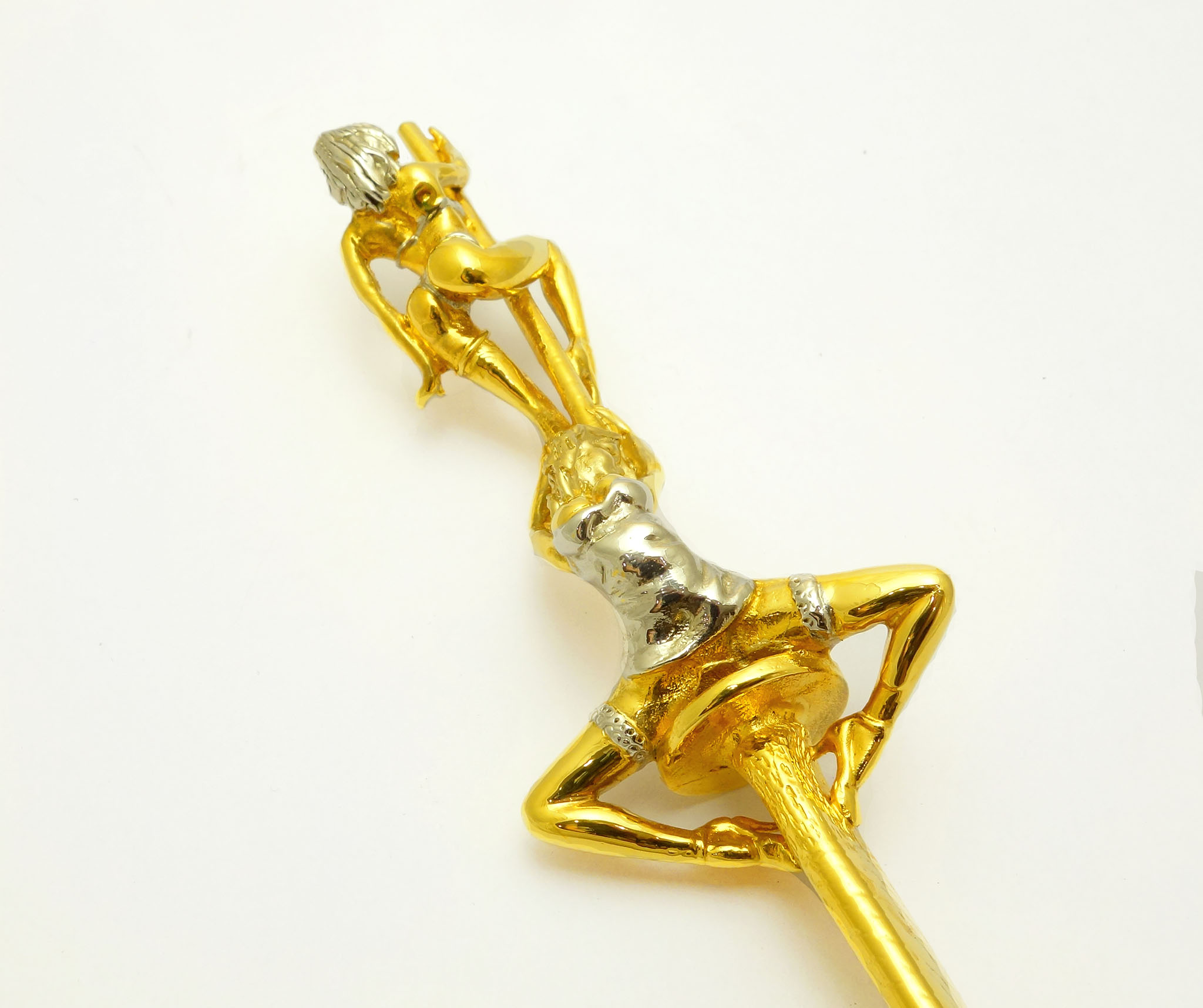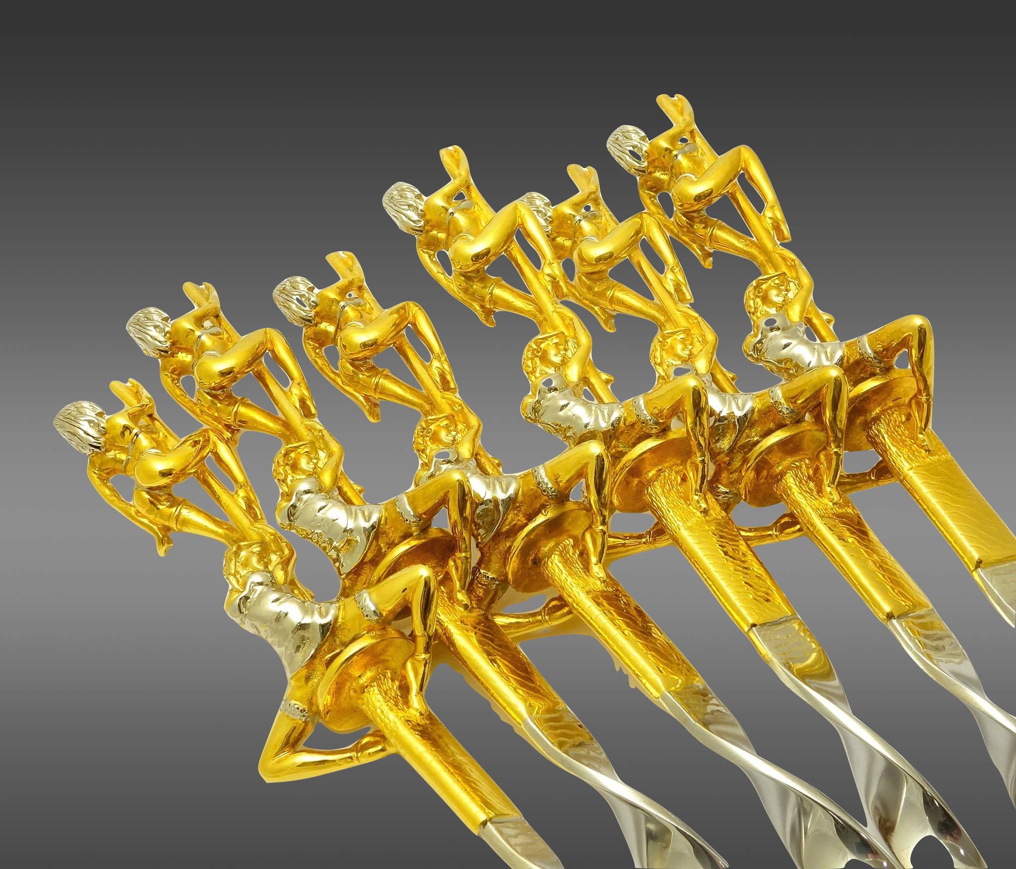 Представляем вам наш уникальный набор шампуров Танцовщицы. Это идеальный выбор для любителей пикника и любителей нонконформистского стиля. Ручки шампуров выполнены в виде изящных танцовщиц стриптиза, которые точно привлекут внимание ваших друзей и гостей. Детали вылиты из бронзы и специально покрыты позолотой для придания исключительного шика и блеска.