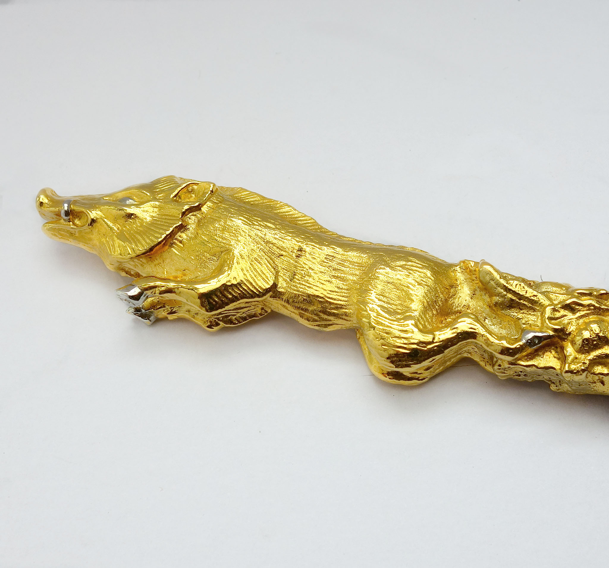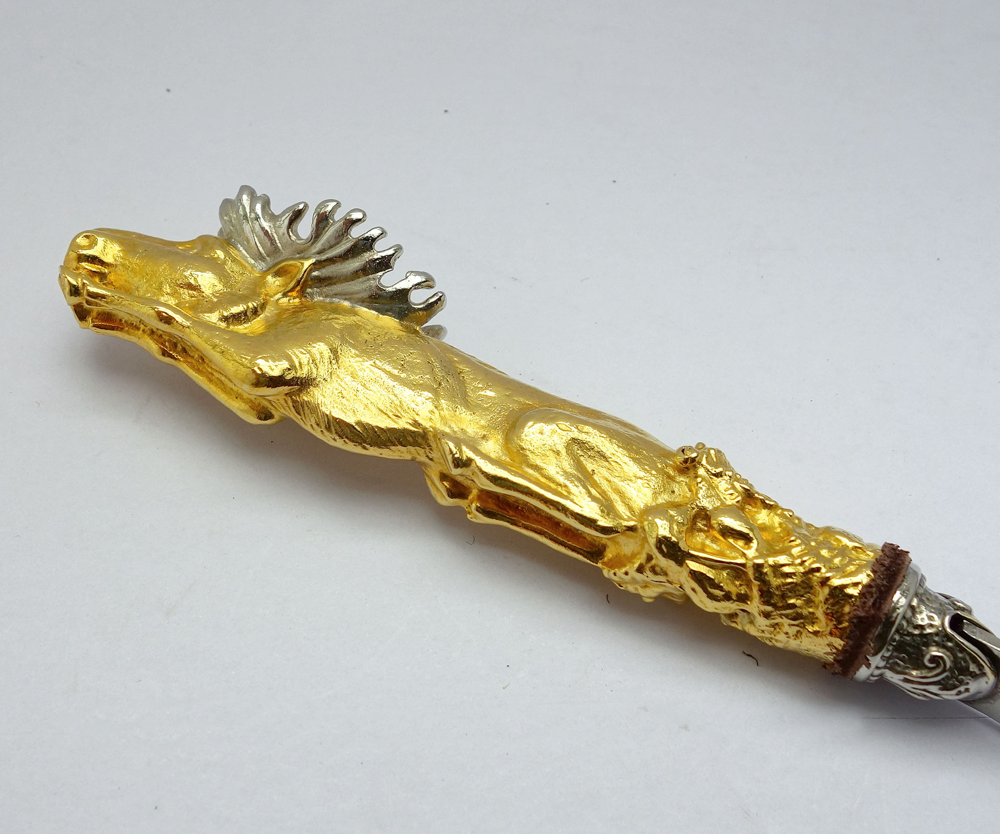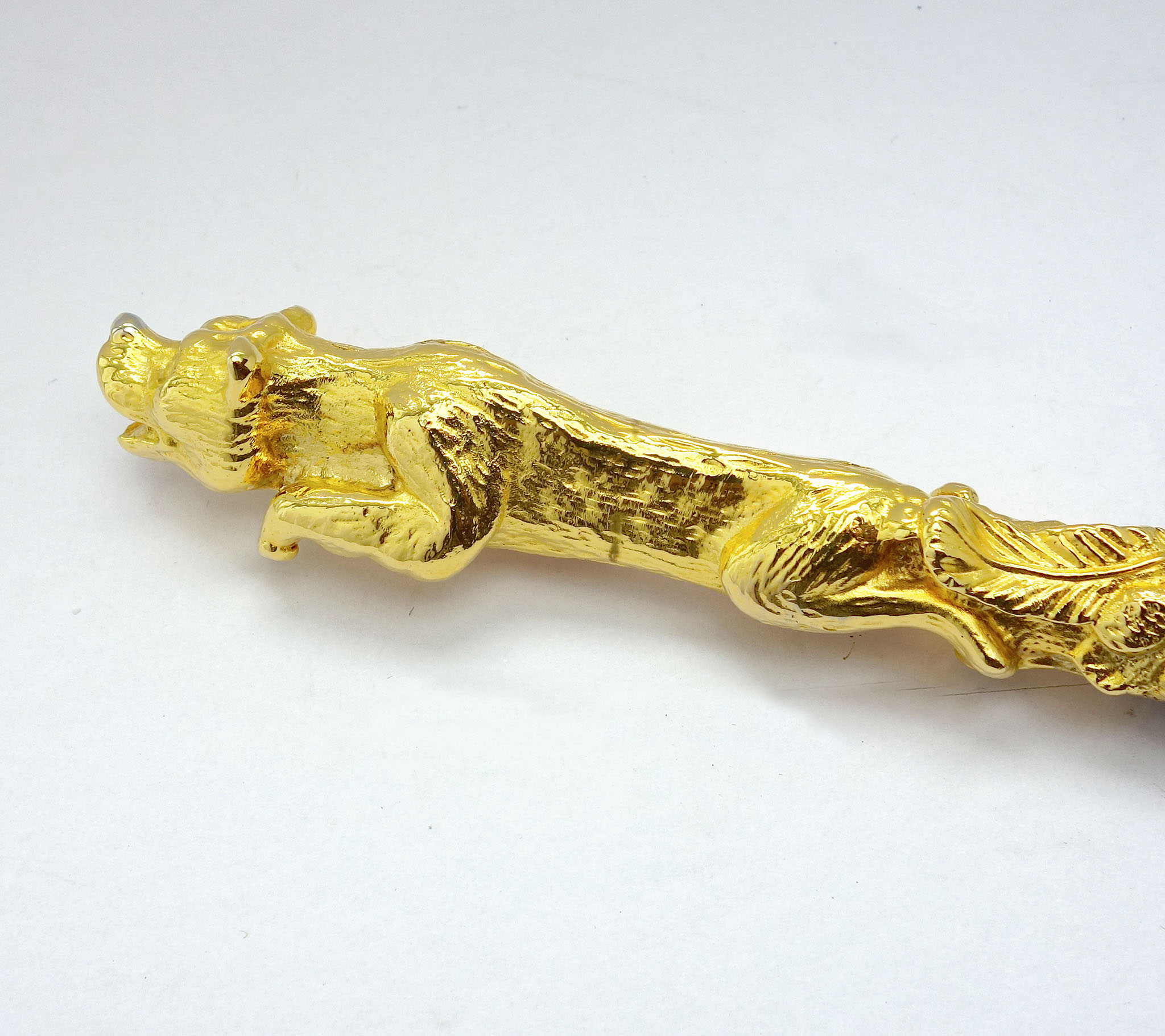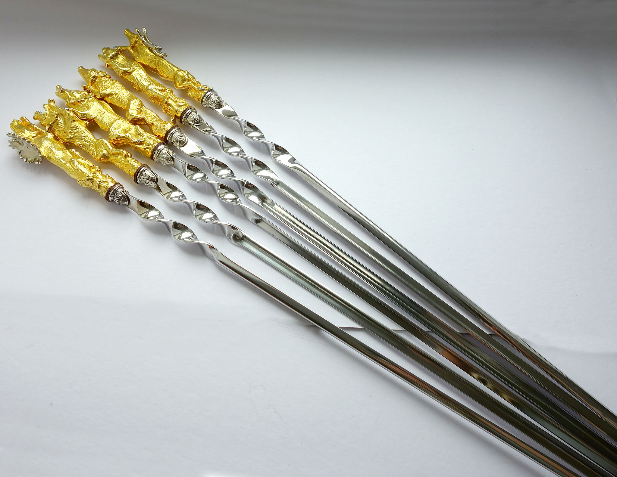 Окунитесь в мир первобытных охотников с нашим новым набором шампуров Звери. Сделанные в традициях древних ремесленников, эти шампуры не только позволят Вам приготовить лучший шашлык в мире, но и превратят процесс приготовления пищи в настоящее удовольствие. Ручки шампуров выполнены в виде зверей из бронзового литья и покрыты золотом. Это делает их не только красивыми, но и очень удобными в использовании. Ручки не нагреваются и не скользят в руке.