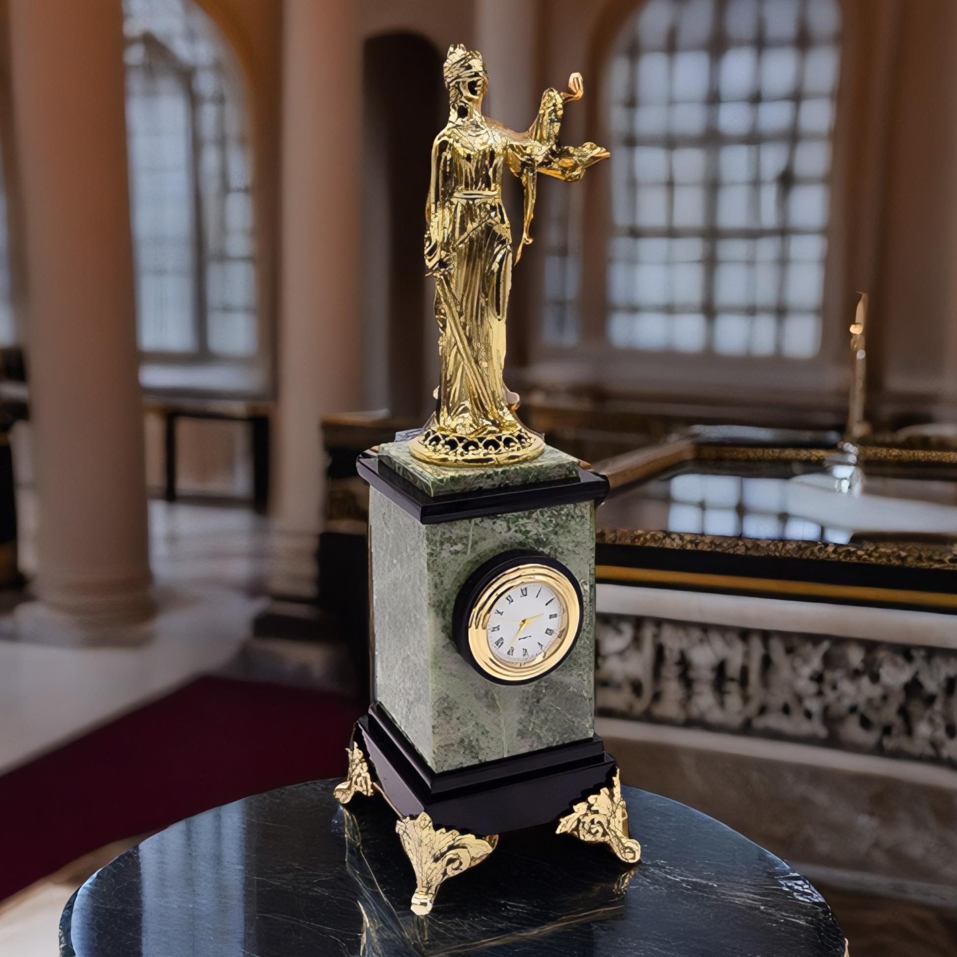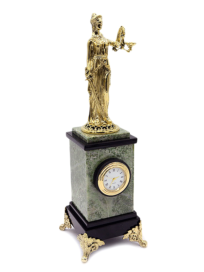 Но эти часы не просто красивы. На них также установлена бронзовая статуэтка Фемиды, которая символизирует справедливость и мудрость. Благодаря этому, эти настольные часы становятся еще более значимыми и внушительными, идеальным подарком для юриста, судьи или просто ценителя искусства. |