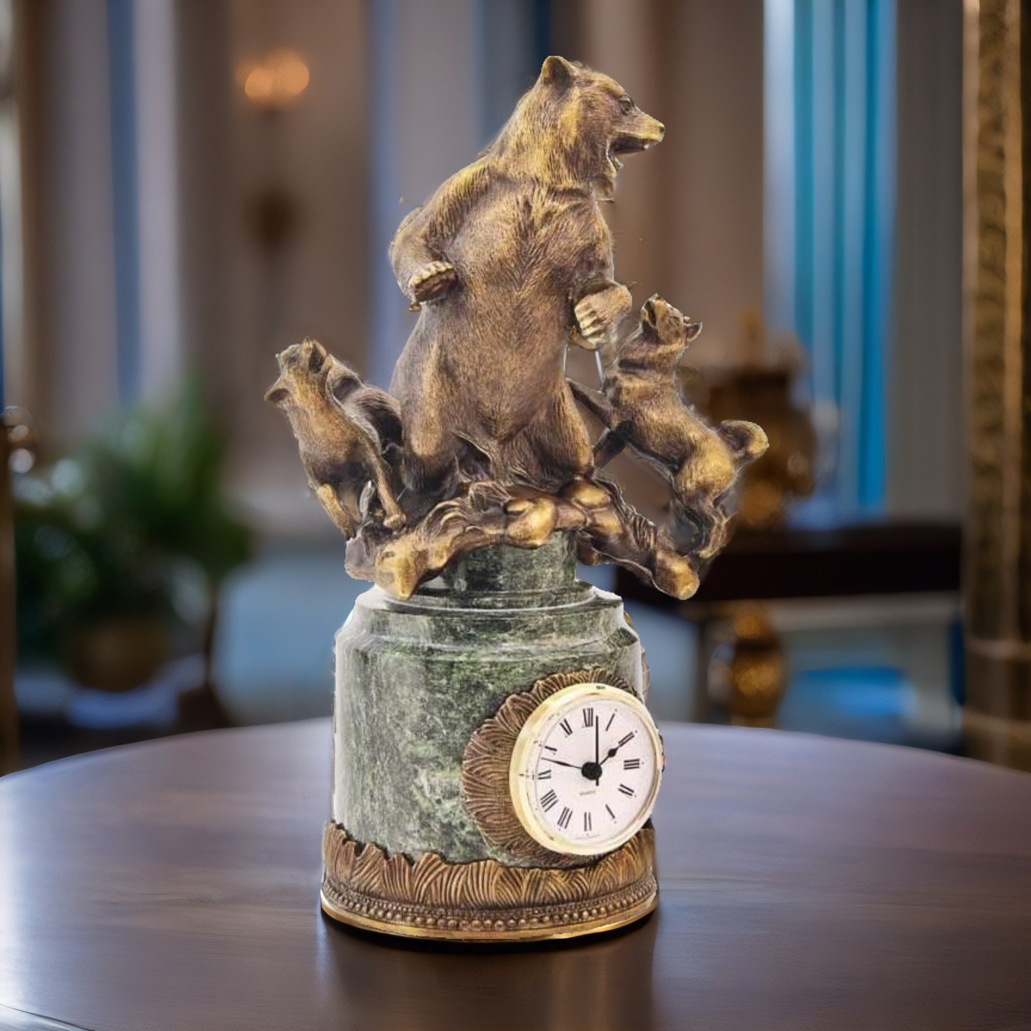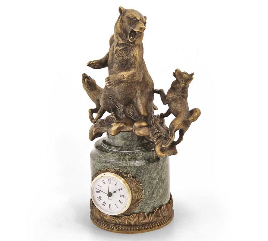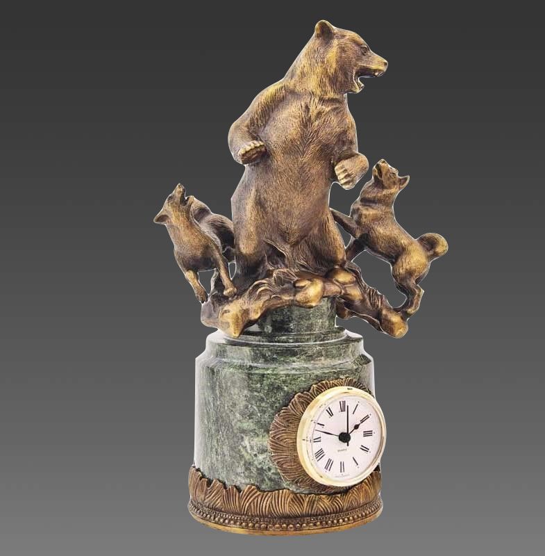 Наш товар особенный, потому что он изготовлен из двух уникальных материалов: бронзы и змеевика. Бронза придает часам традиционный винтажный вид, а змеевик добавляет утонченности и мягкости цвета, что делает дизайн гармоничным и приятным для глаз. На часах изображена статуэтка охоты на медведя с собаками — привлекательная деталь, заметная всем вашим гостям. Это отражает собой оригинальность, дух приключений и смелости, готовности встретить любые трудности. |