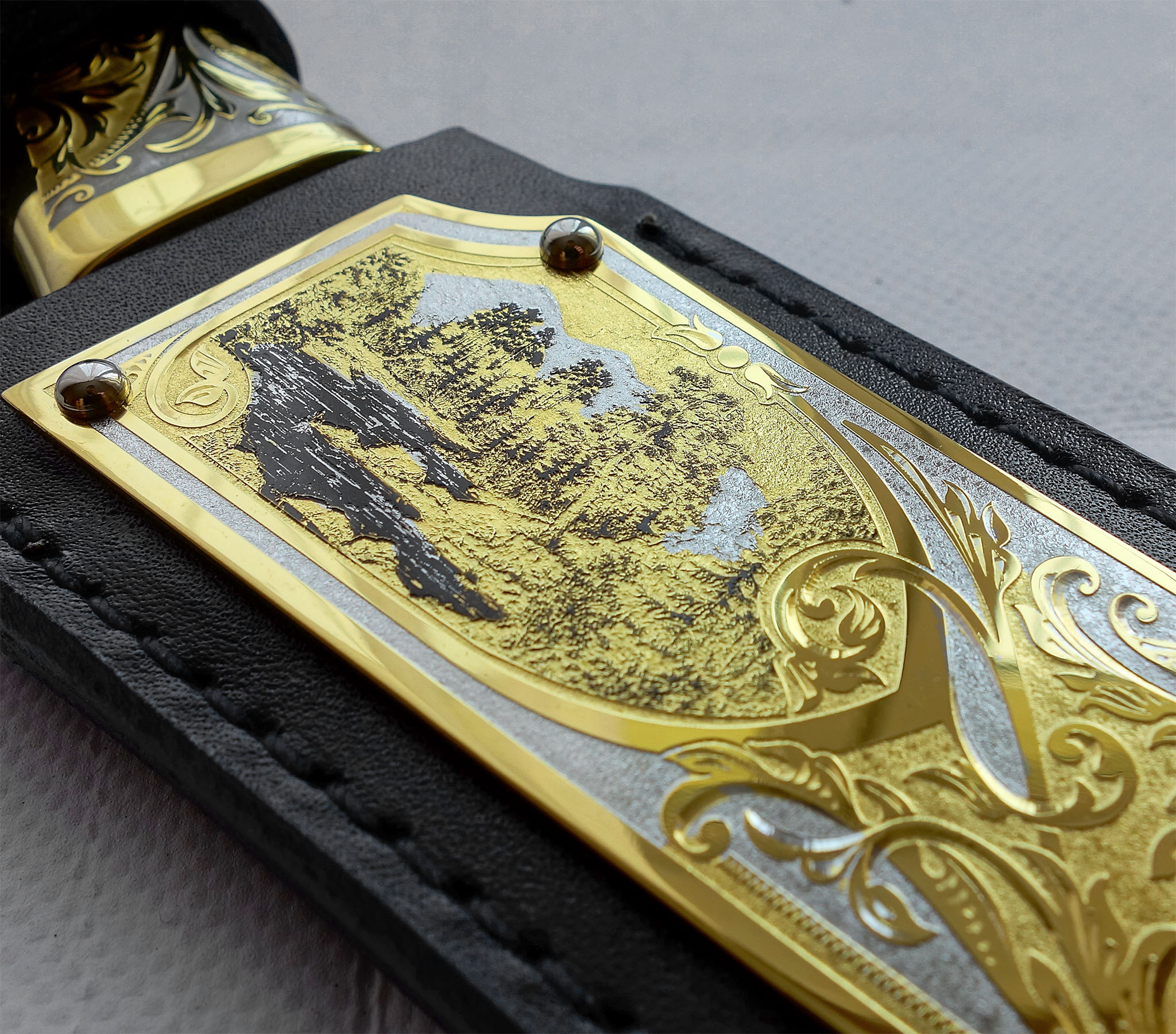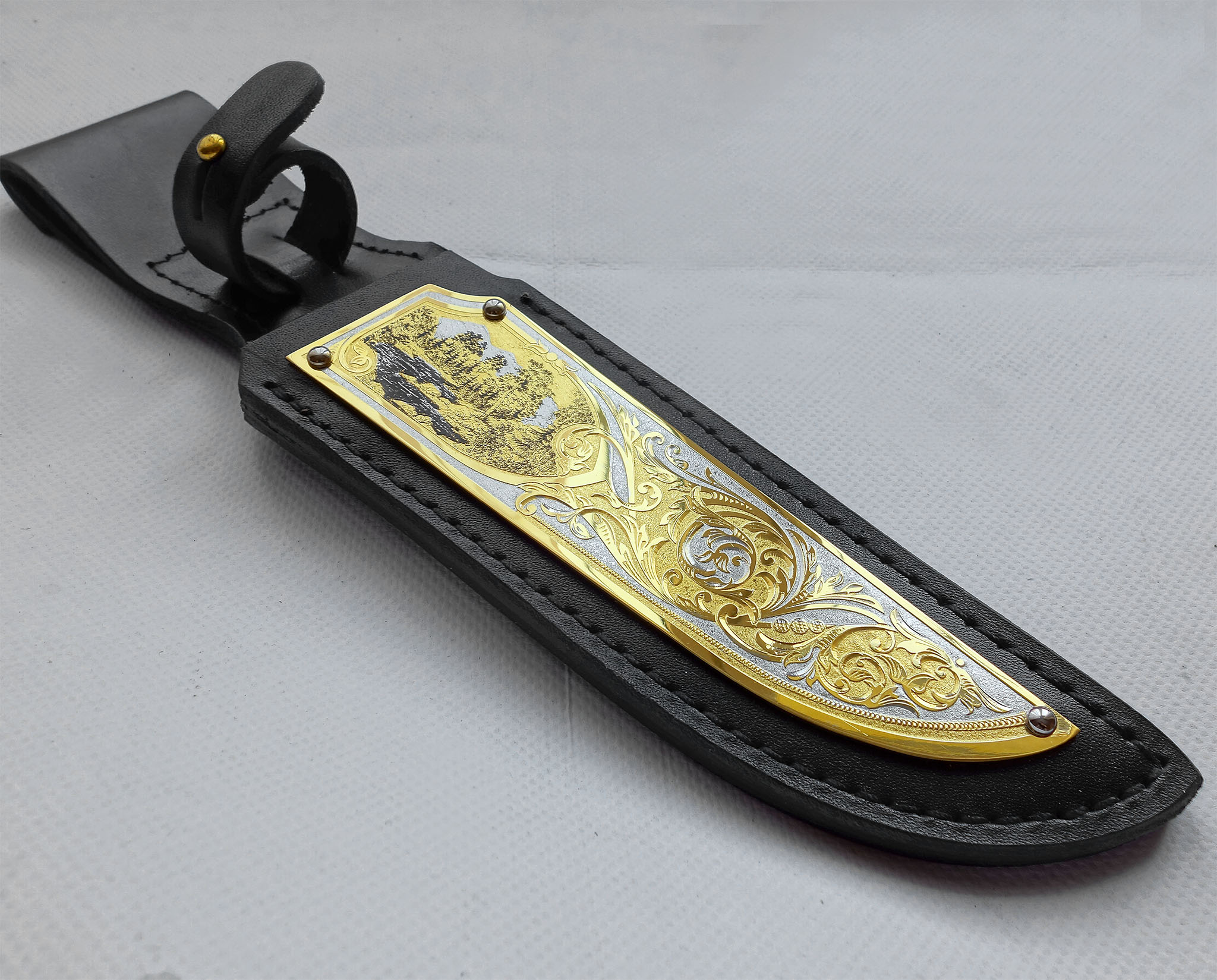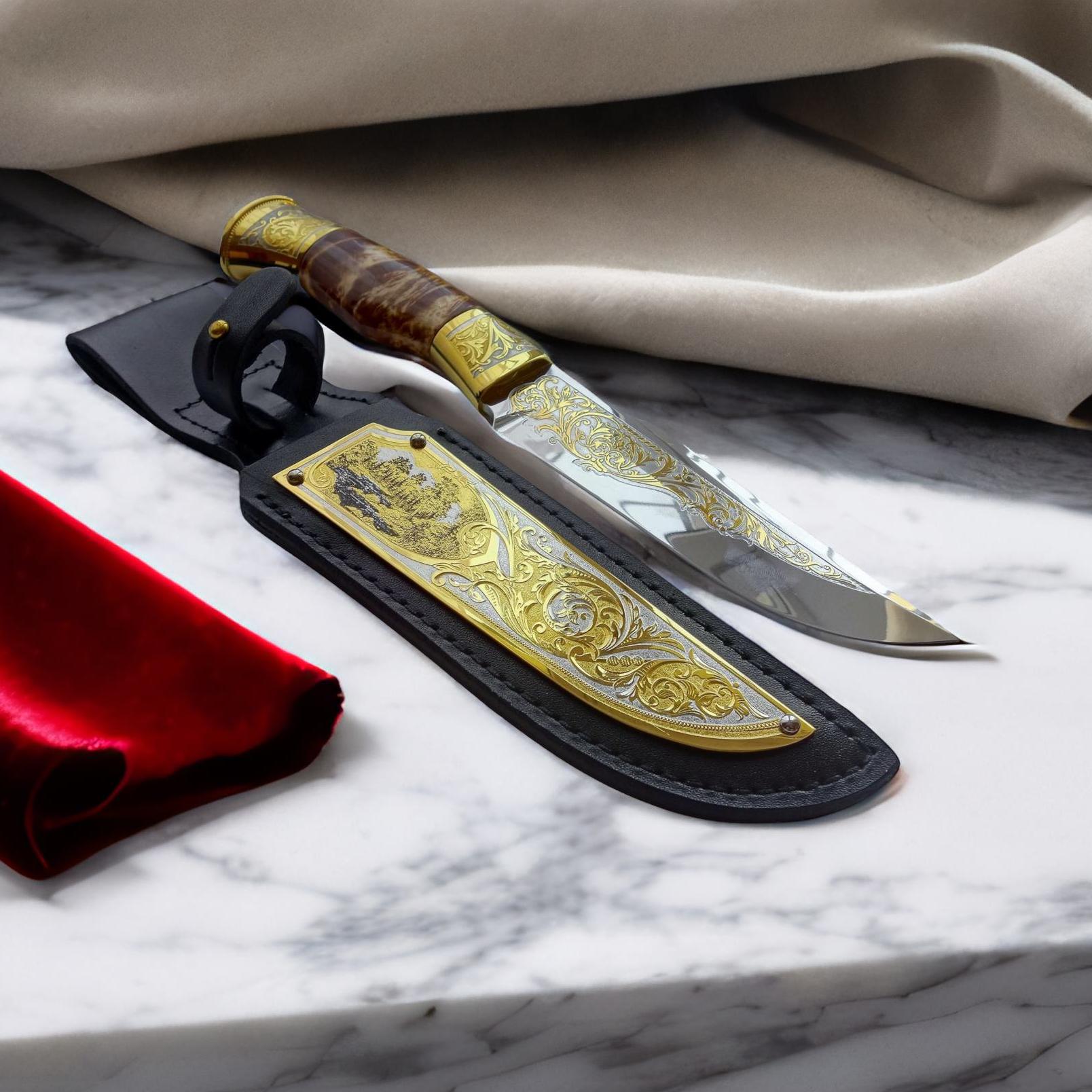 Нож «Бурый медведь» из Златоуста представляет собой истинное произведение искусства. Он отлично подойдет в качестве подарка для охотников и любителей природы. На рукояти ножа мастерски выполнена голова бурого медведя, которая внушает уважение и восхищение. Ножны украшены гравировкой медведя, делая этот нож еще более особенным и уникальным. Это не просто нож, это символ силы и мощи, идеальное дополнение к коллекции или же функциональный инструмент. |