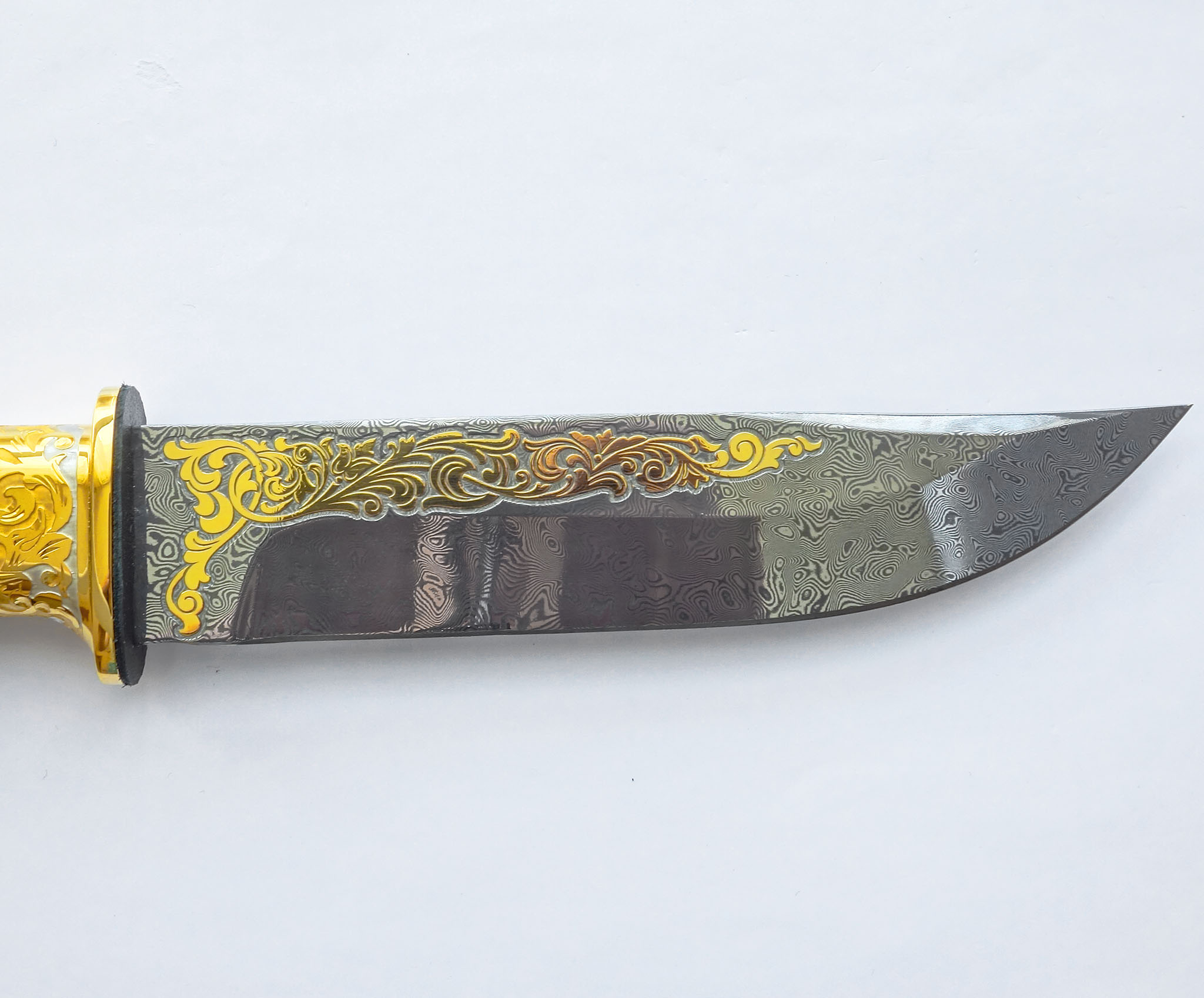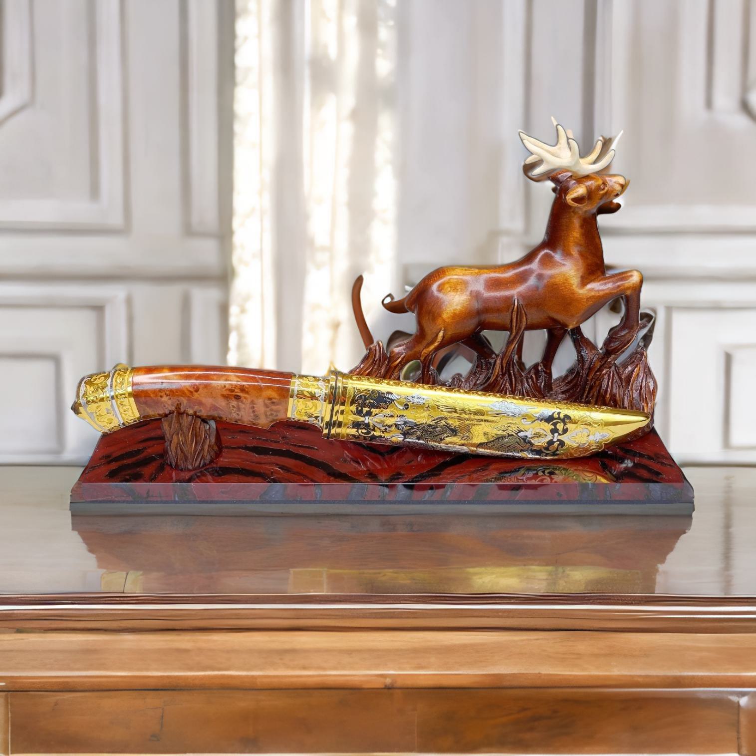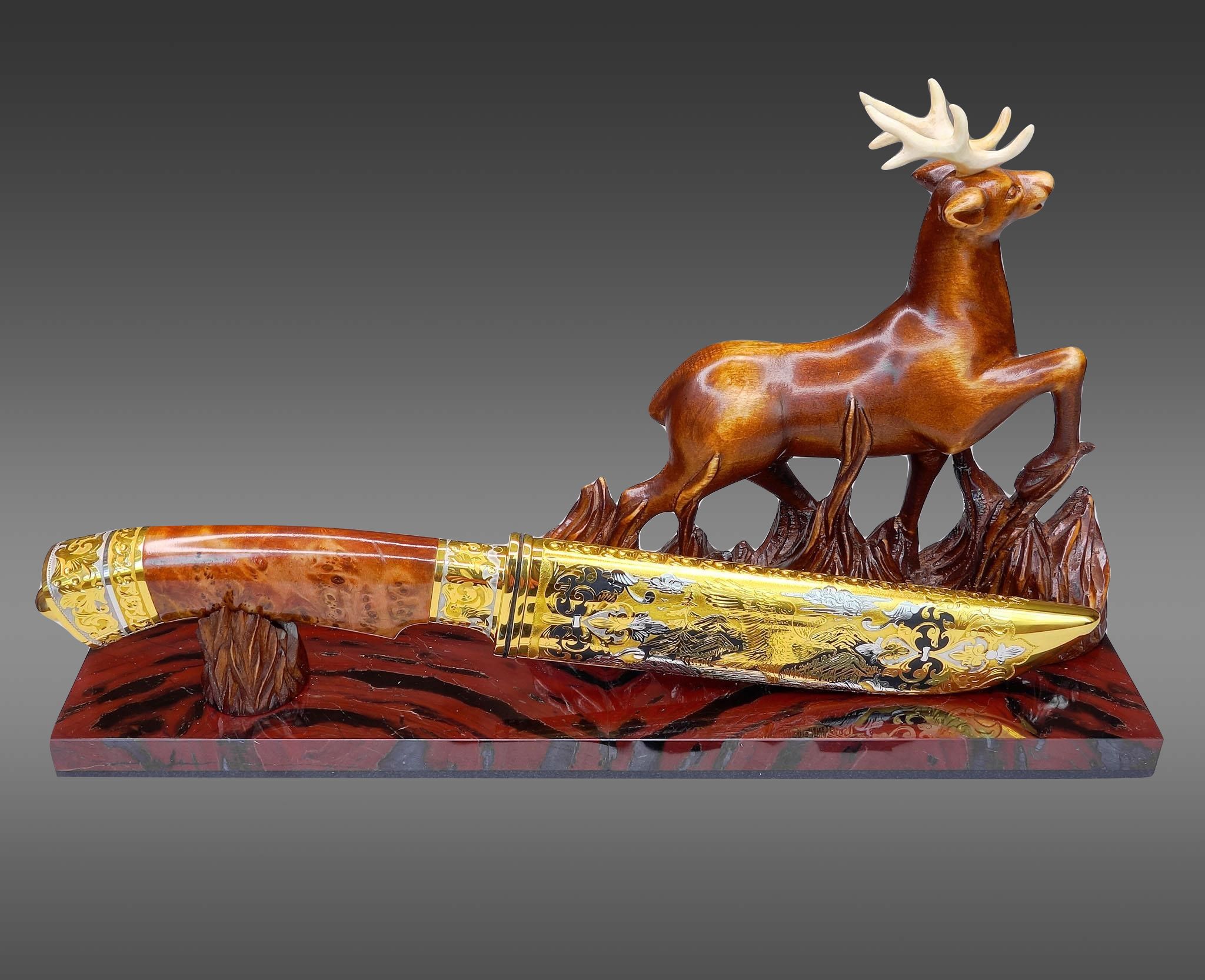 Превосходный нож на подставке "Олень" № 2 из Златоуста - это не просто инструмент, это произведение искусства. Клинок изготовлен из высококачественной дамасского стали, а основание из красной яшмы добавляет изысканность. Фигура оленя вырезанная вручную из дерева делает этот нож не только практичным, но и красивым предметом интерьера. Этот нож может стать центром внимания в вашей коллекции или подарком для того, кто ценит искусство и качественные вещи. Несомненно, это демонстрирует мастерство и талант художников-граверов Златоуста. |