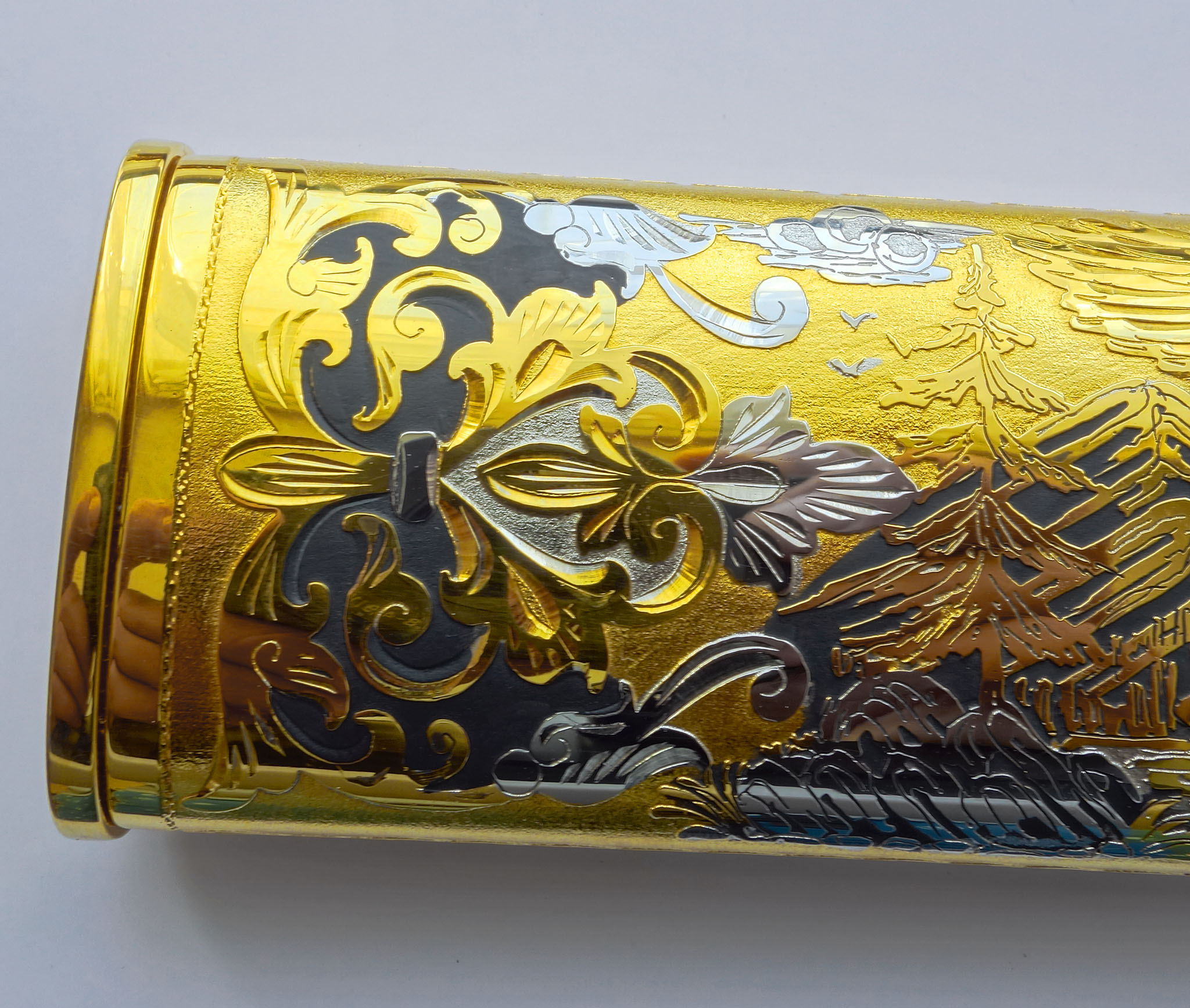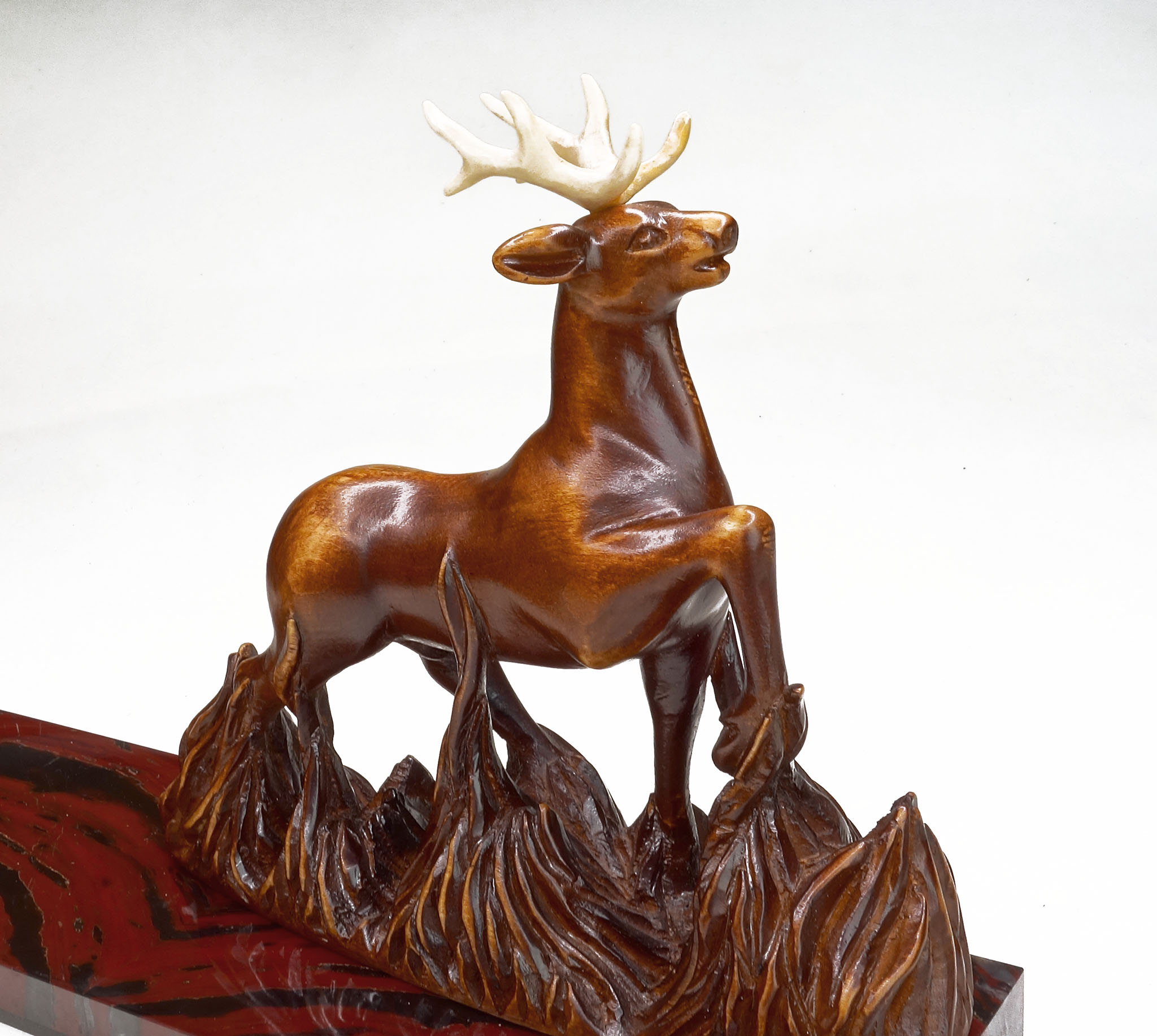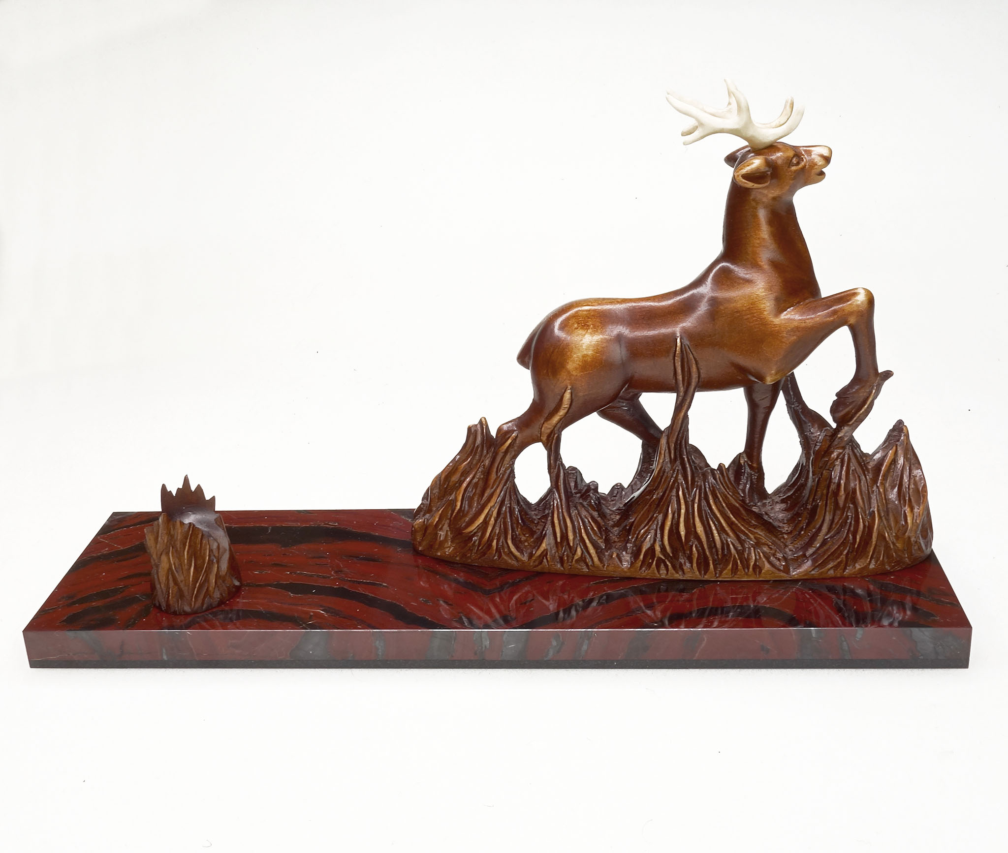 Превосходный нож на подставке "Олень" № 2 из Златоуста - это не просто инструмент, это произведение искусства. Клинок изготовлен из высококачественной дамасского стали, а основание из красной яшмы добавляет изысканность. Фигура оленя вырезанная вручную из дерева делает этот нож не только практичным, но и красивым предметом интерьера. Этот нож может стать центром внимания в вашей коллекции или подарком для того, кто ценит искусство и качественные вещи. Несомненно, это демонстрирует мастерство и талант художников-граверов Златоуста. |