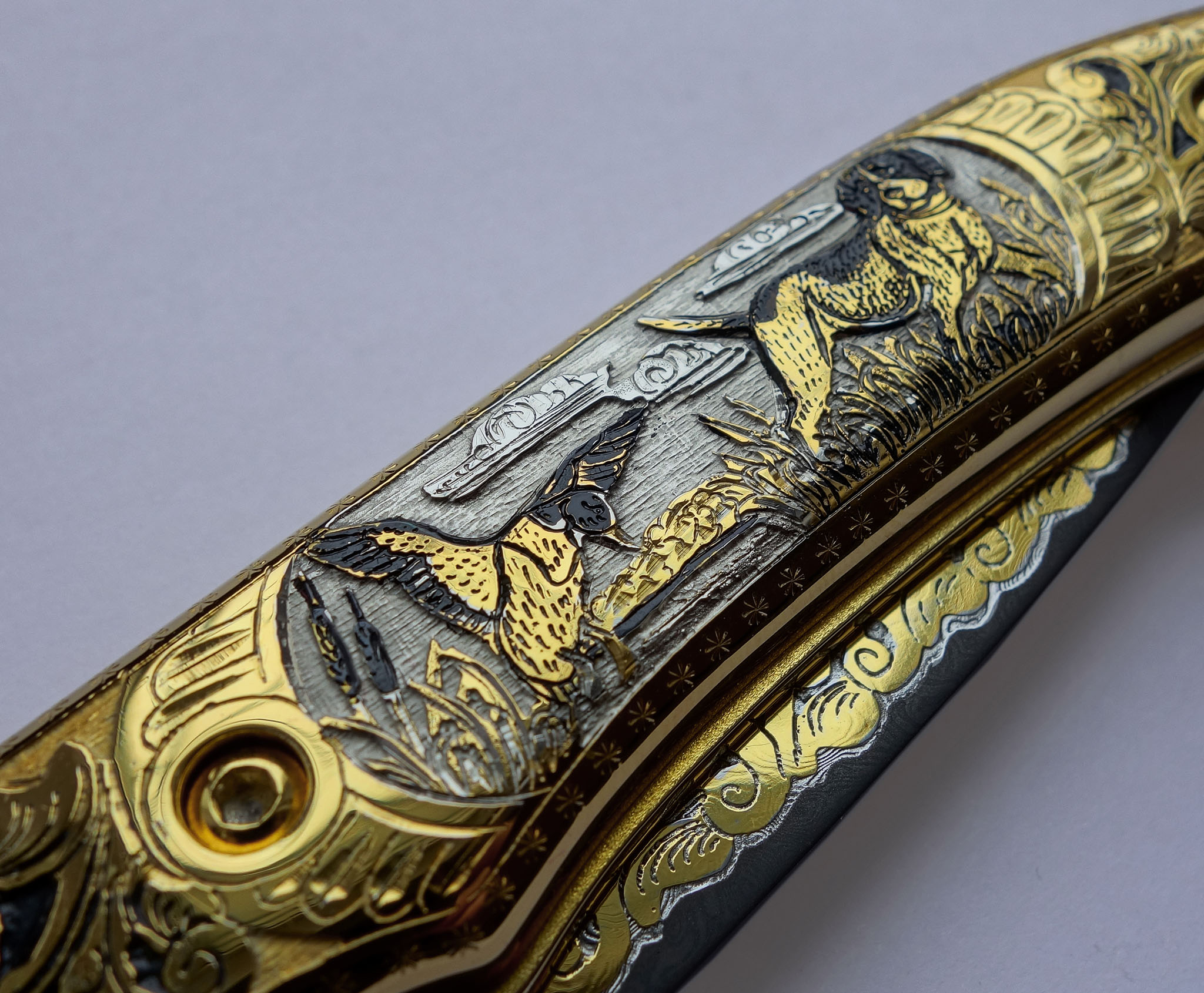 Складной дамасский нож "На уток" из Златоуста - это истинное произведение искусства и функциональности. Изготовлен из дамасской стали, он является воплощением качества и долговечности. Этот нож имеет изысканное украшение в виде изображения уток на рукояти, что придает ему уникальный и престижный характер. Подойдет как для охотников, так и для любителей коллекционировать уникальные предметы. Такой подарок станет истинным украшением любой коллекции. |