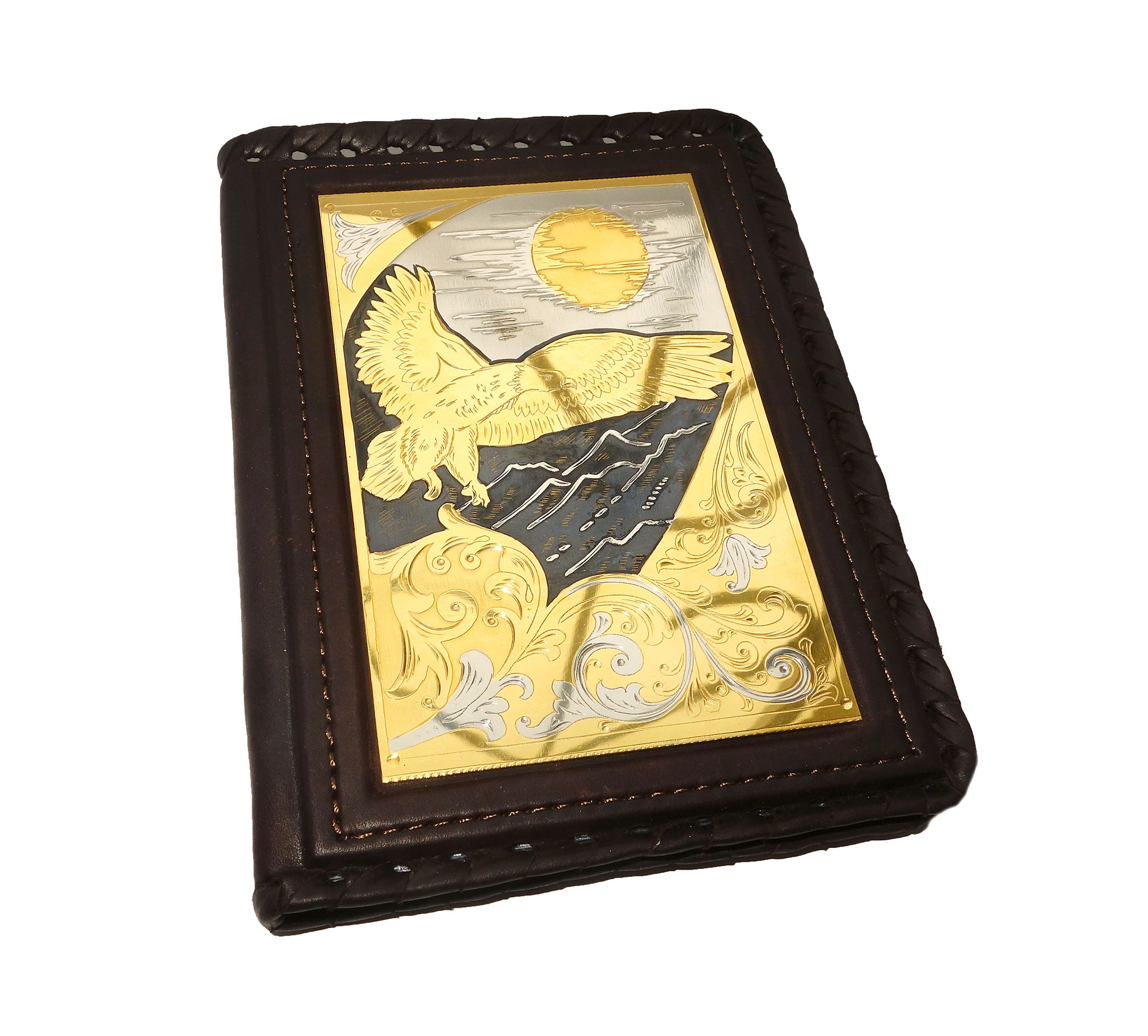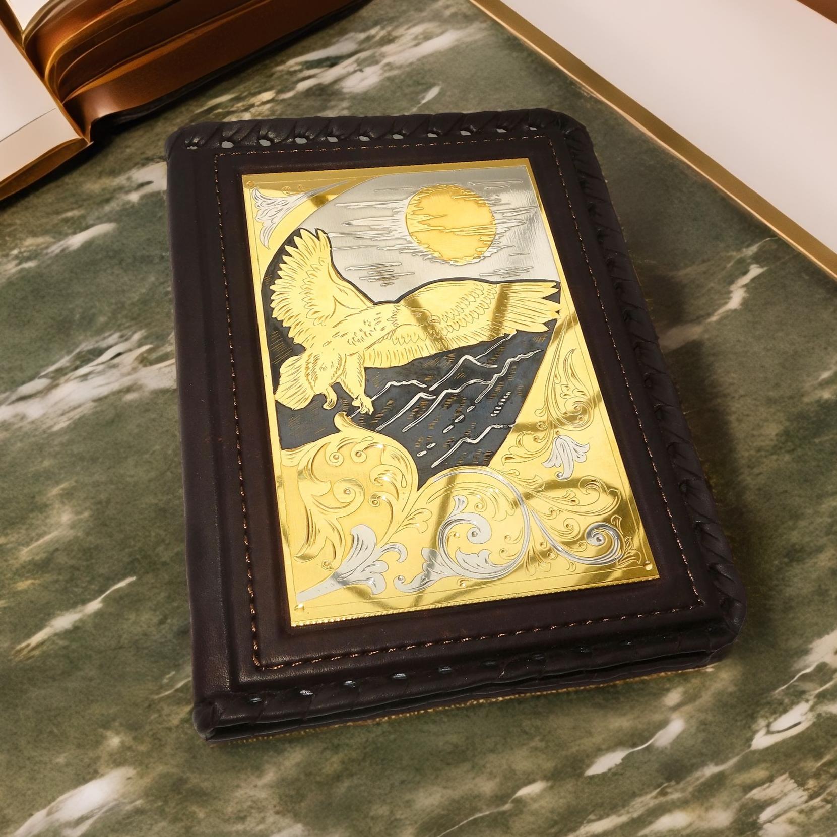 Наша новинка — кожаная обложка для водительских документов. Этот аксессуар изготовлен из высококачественной натуральной кожи, что гарантирует его долговечность и стильный внешний вид. Но что делает эту обложку действительно уникальной, — это ручная работа мастера и использование технологии златоустовской гравюры с золочением. Каждый экземпляр украшается гравировкой орла, символизируя силу, мощь и благородство.